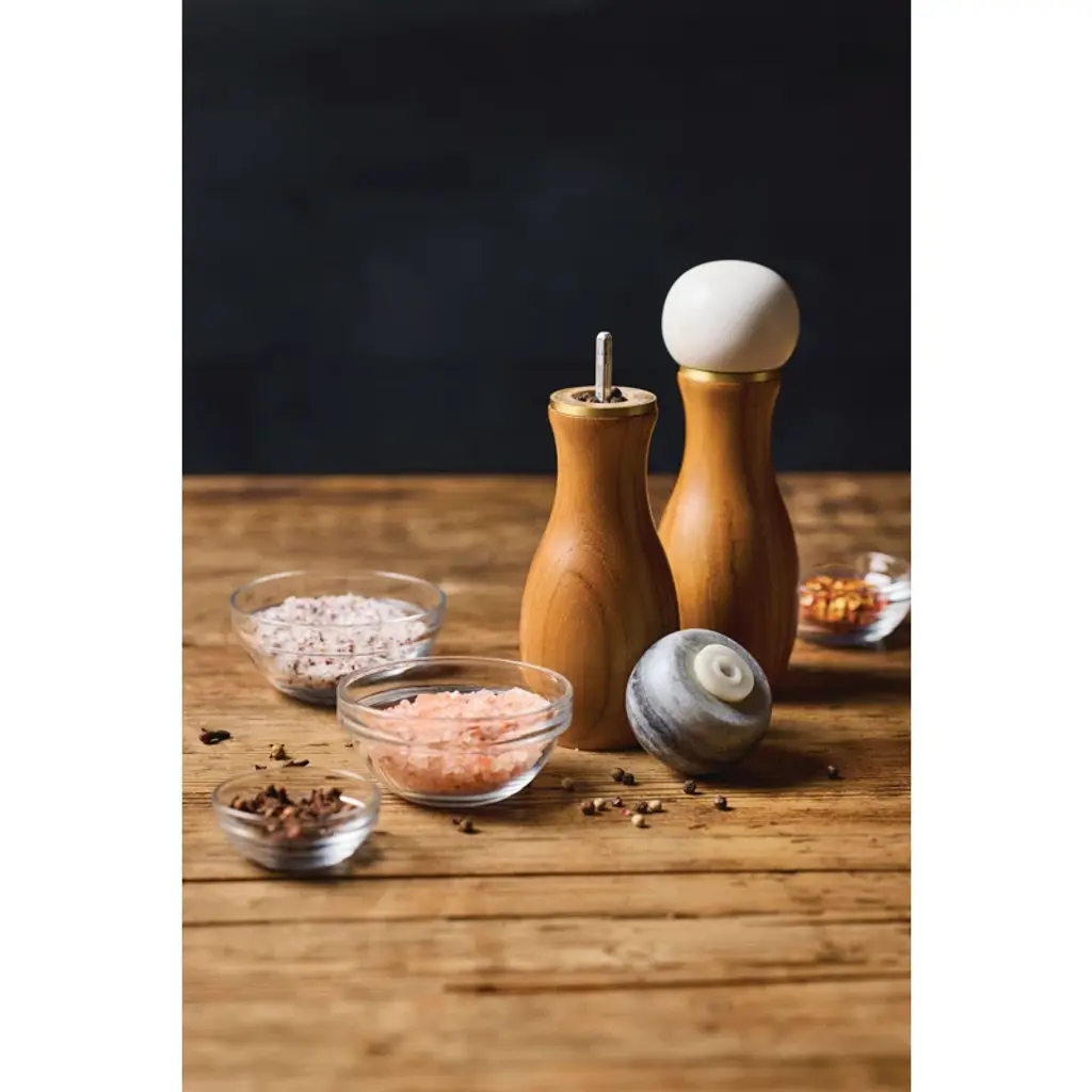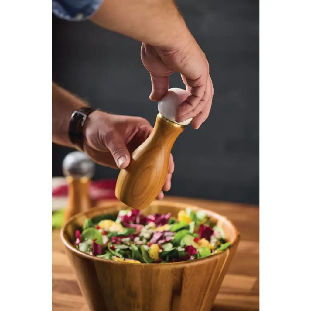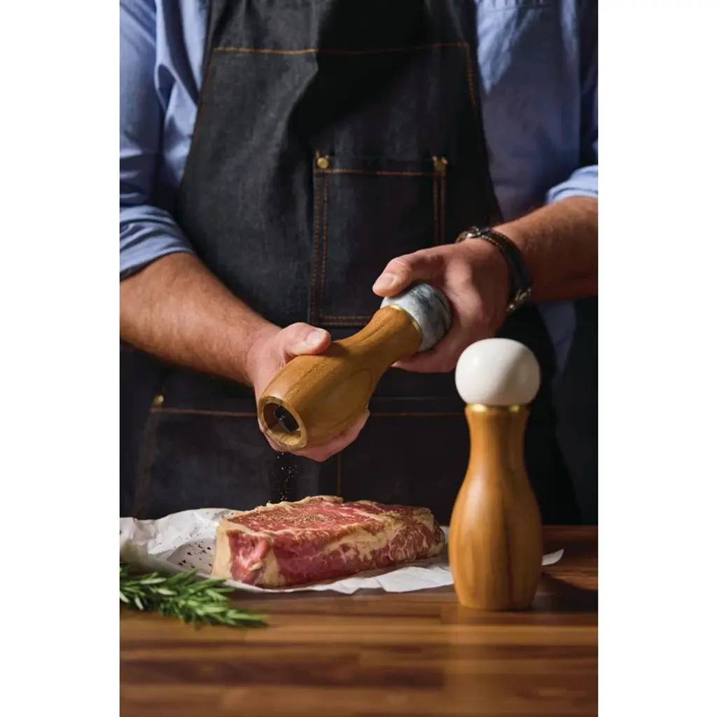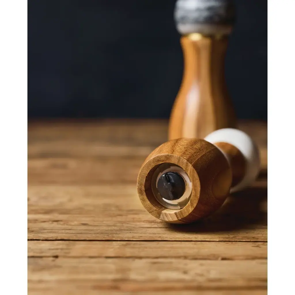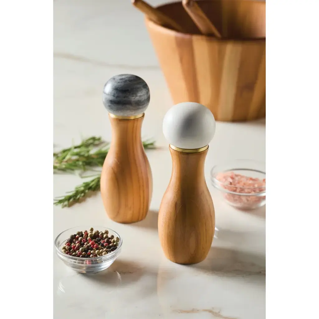 Season things up with the style, functionality, and elegant beauty of this stylish Teak and Marble Salt and Pepper Grinder Set from Anolon. Crafted from beautiful teak hardwood, these salt and pepper grinders feature brass accents and a modern, counter-friendly design that looks great on the table and works perfectly in the kitchen. Topped with heavy, durable, marble knobs (Grecian White for salt, China Gray for Pepper), the salt and pepper mills feature an easy-screw bottom plate for loading peppercorns and coarse salt into the grinders. Get freshly ground salt and pepper while cooking or eating with the stylish Teakwood and Marble Salt and Pepper Grinder Set from Anolon, and prep and serve with style.