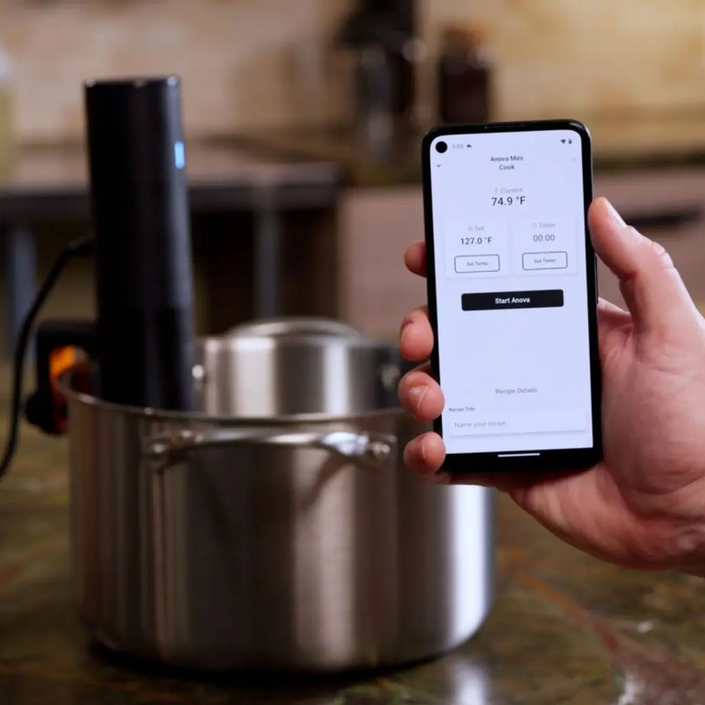 The Anova Mini Precision Cooker makes the magic of sous vide cooking accessible. Master the cooking technique made famous by professional chefs for its incredible and consistent results. The Mini's clever design allows you to set the time and temperature manually or via the Anova app. Cook food in a sealed bag in a pot of water for maximum tenderness and moisture retention, keeping track of its progress on your mobile device. The Precision Cooker heats and gently circulates water in the pot, bringing your meat, seafood, eggs and more to a precise programmed temperature without any worry of overcooking.