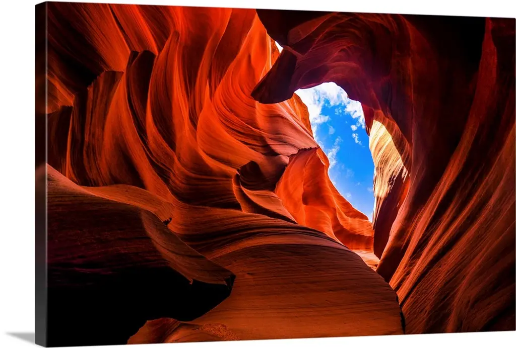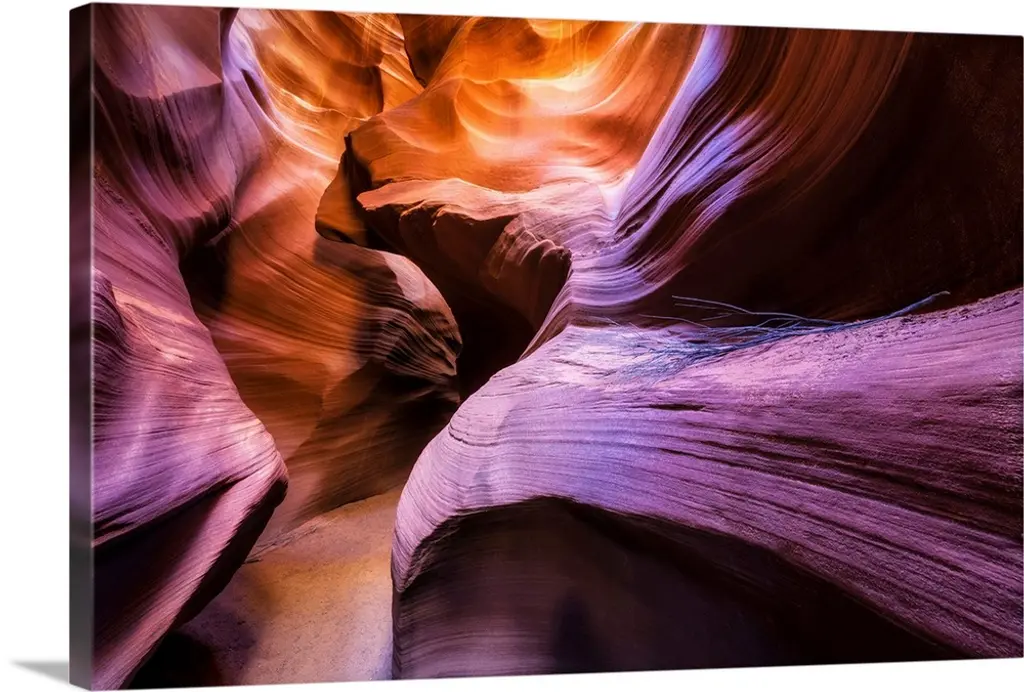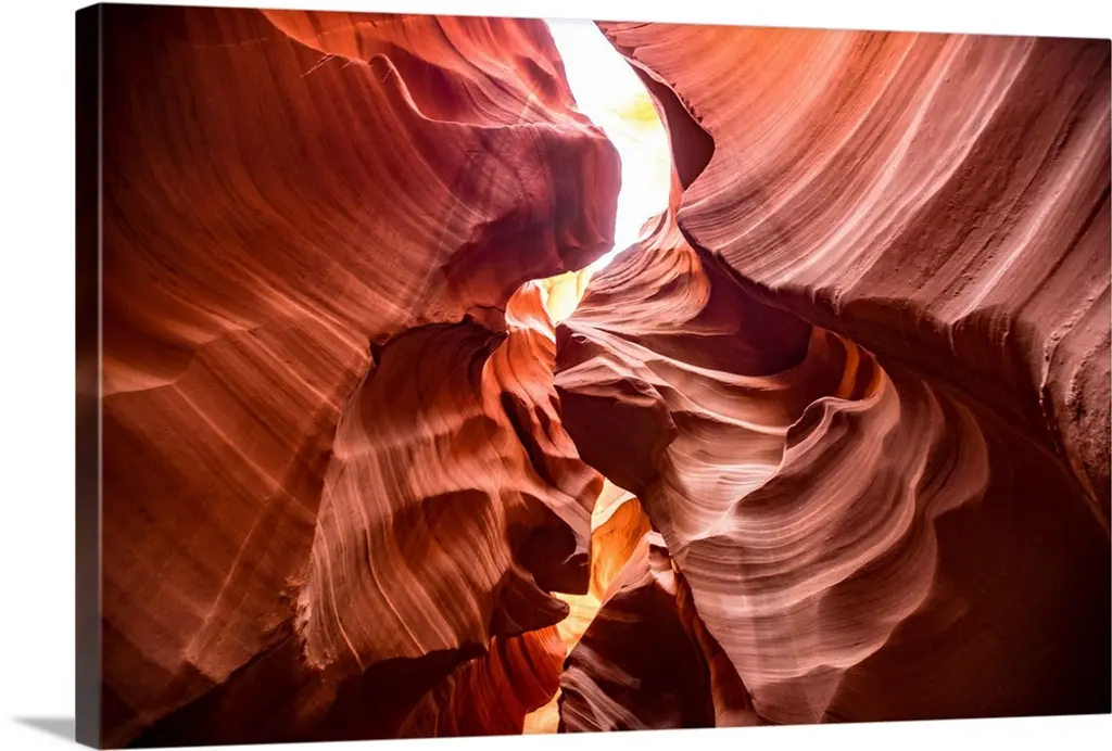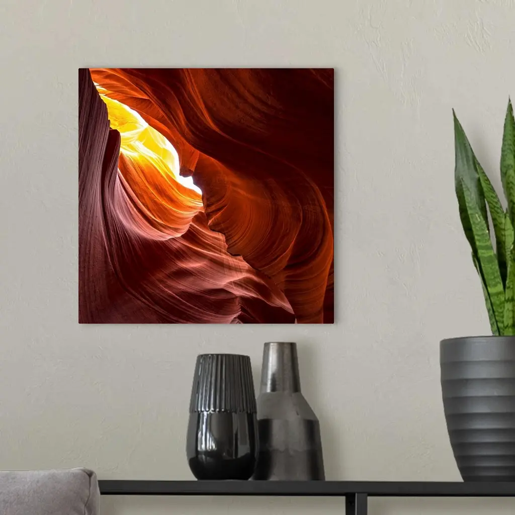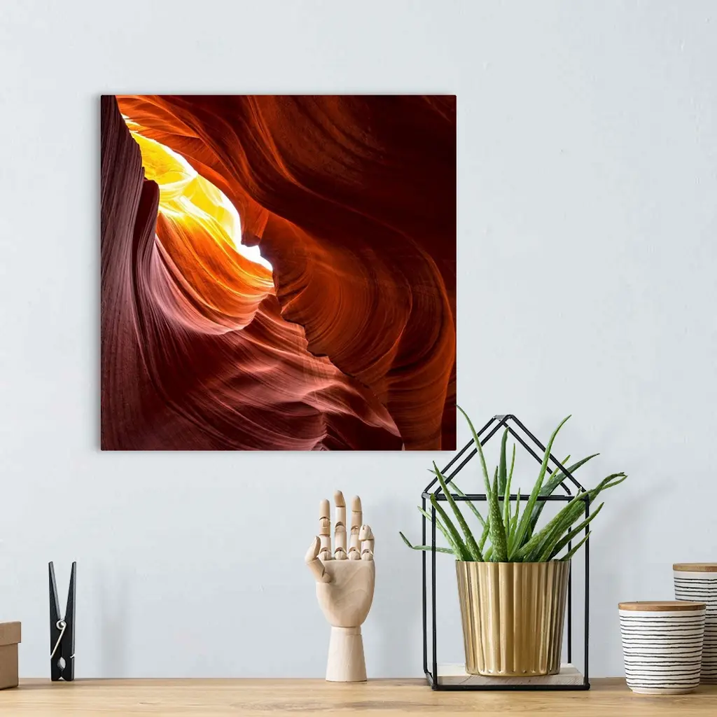 Square photograph from inside of Antelope Canyon rock formation located on the Navajo Reservation in Page, Arizona with flowing shapes and textures and bright yellow and white sunlight coming through the top.