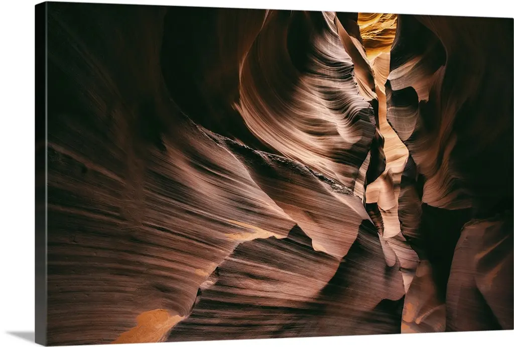 Photograph from inside of Antelope Canyon's rock formation located on the Navajo Reservation in Page, Arizona with flowing shapes and textures.