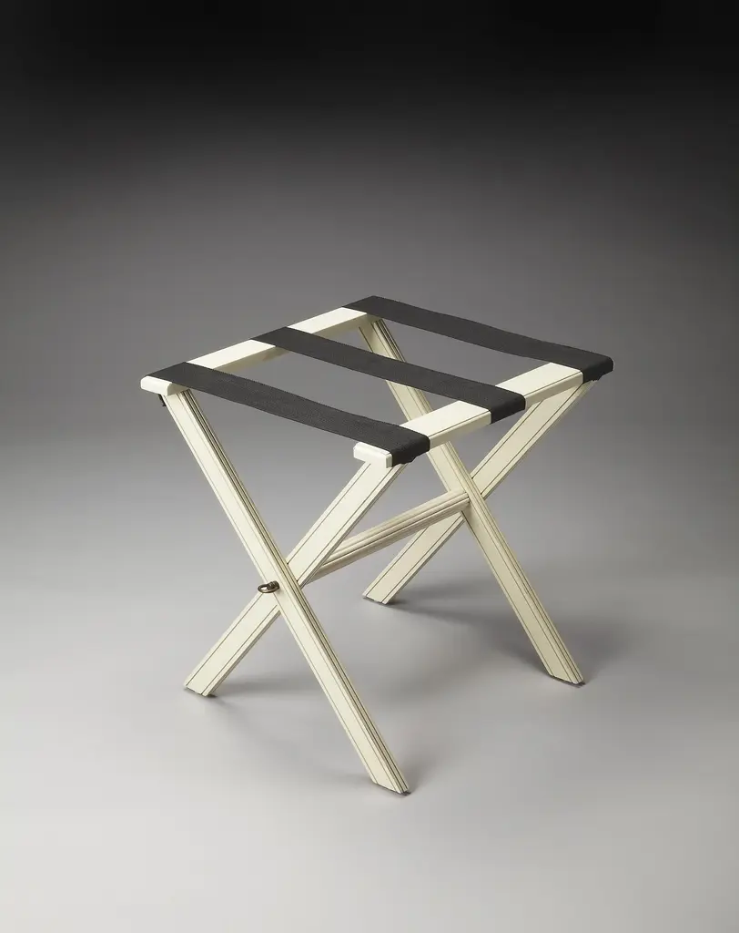 Perfect for any bedroom or walk-in closet, this luggage rack is ready when needed. The Cottage White finished solid Wood frame features elegant carving on the stretcher base and legs with three heavy duty cloth straps. Folds away for convenient storage. Durably Constructed With: Poplar and Rubberwood Solids, Cotton Product Construction Features: Finish Distressing Product Assembled Measurement & Weight: 21.25" H x 25.25" W x 18.25" D -- 13.0 lbs. lbs. Suggested weight capacity Item Arrives: Assembled Photo may slightly differ from actual item in terms of color/finish due to the lighting during photo shoot or the monitor's display.