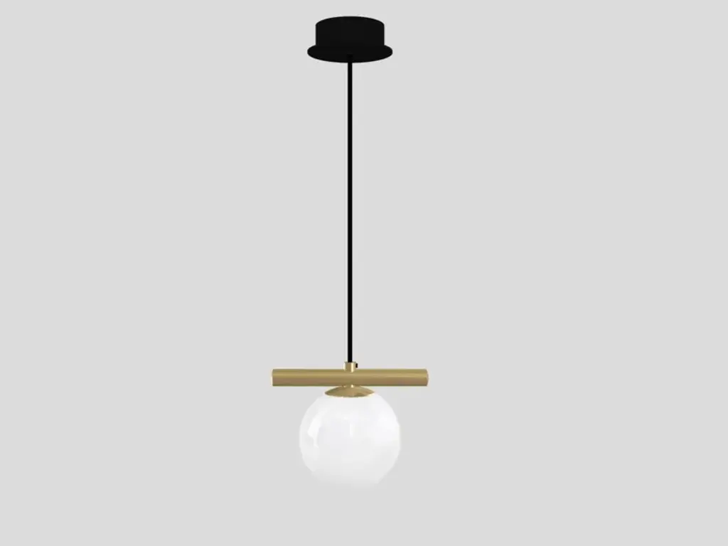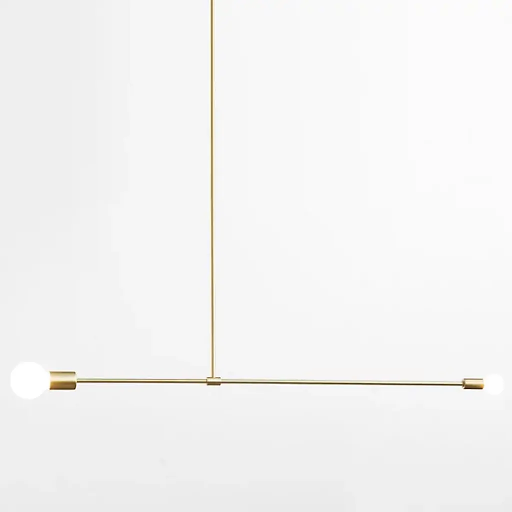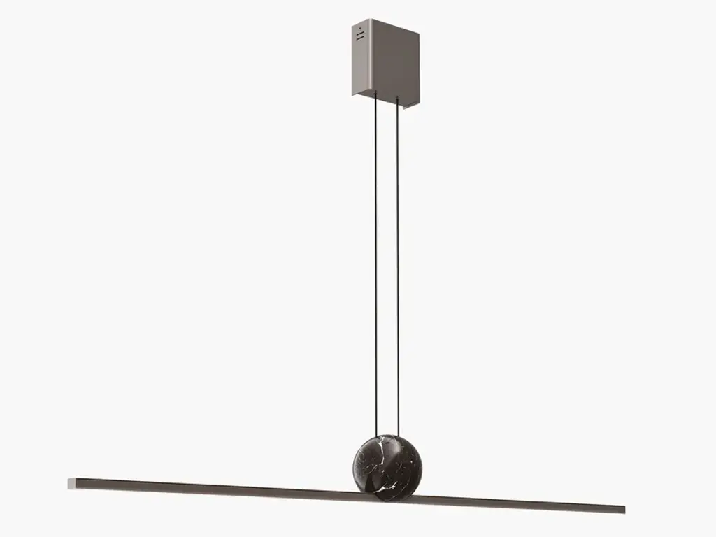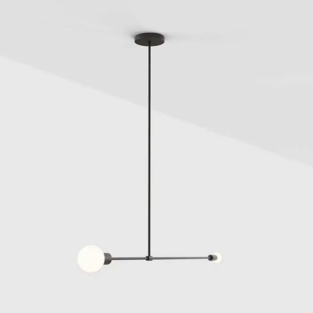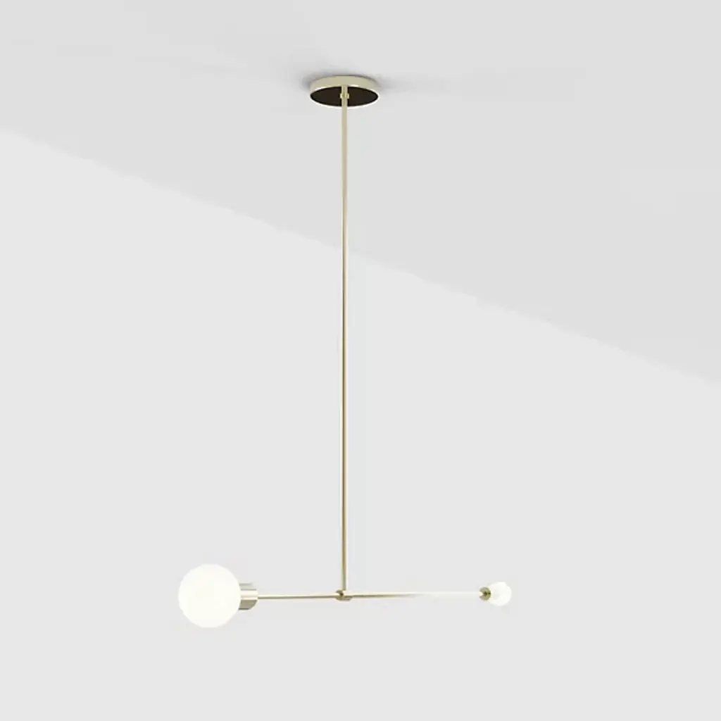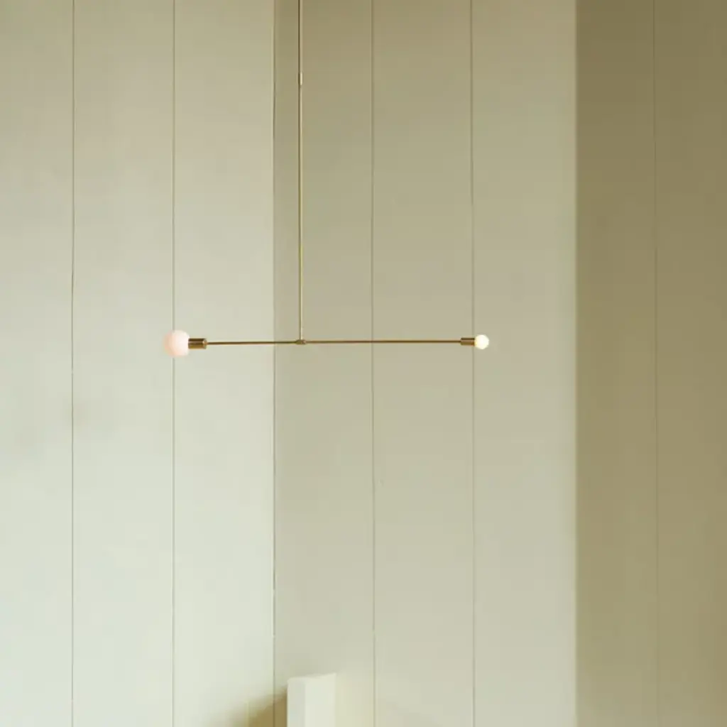A poetic piece told with pure geometry. Bring balance and warm comfort to your room with the glass and brass design of the Antipode Linear Suspension from Lambert & Fils. It's a calculated contemporary design created by Lambert & Fils with the motto of exploring the many shapes of light. It begins with elegant hardware made from solid brass. The brass dashes overhead in crisp lines, giving the room an open, airy feel. While different in scale, milky glass globes on either side delight in their bare bulb design. Revealing the bulb translates to a luminous experience when turned on. Producing a graphic silhouette, the bulbs radiate for a warm ambient glow.