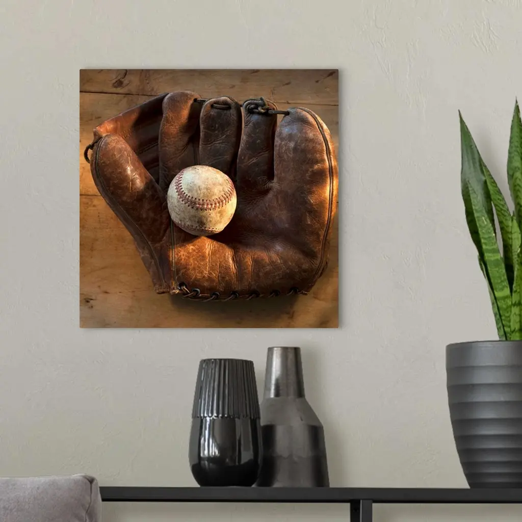 Antique baseball on baseball glove with bat wall art for home and office decor. Discover canvas art prints, photos, mural, big canvas art and framed wall art in GreatBigCanvas.com's varied collections.