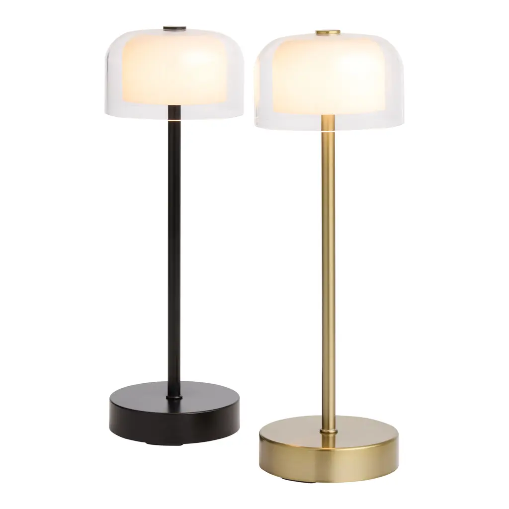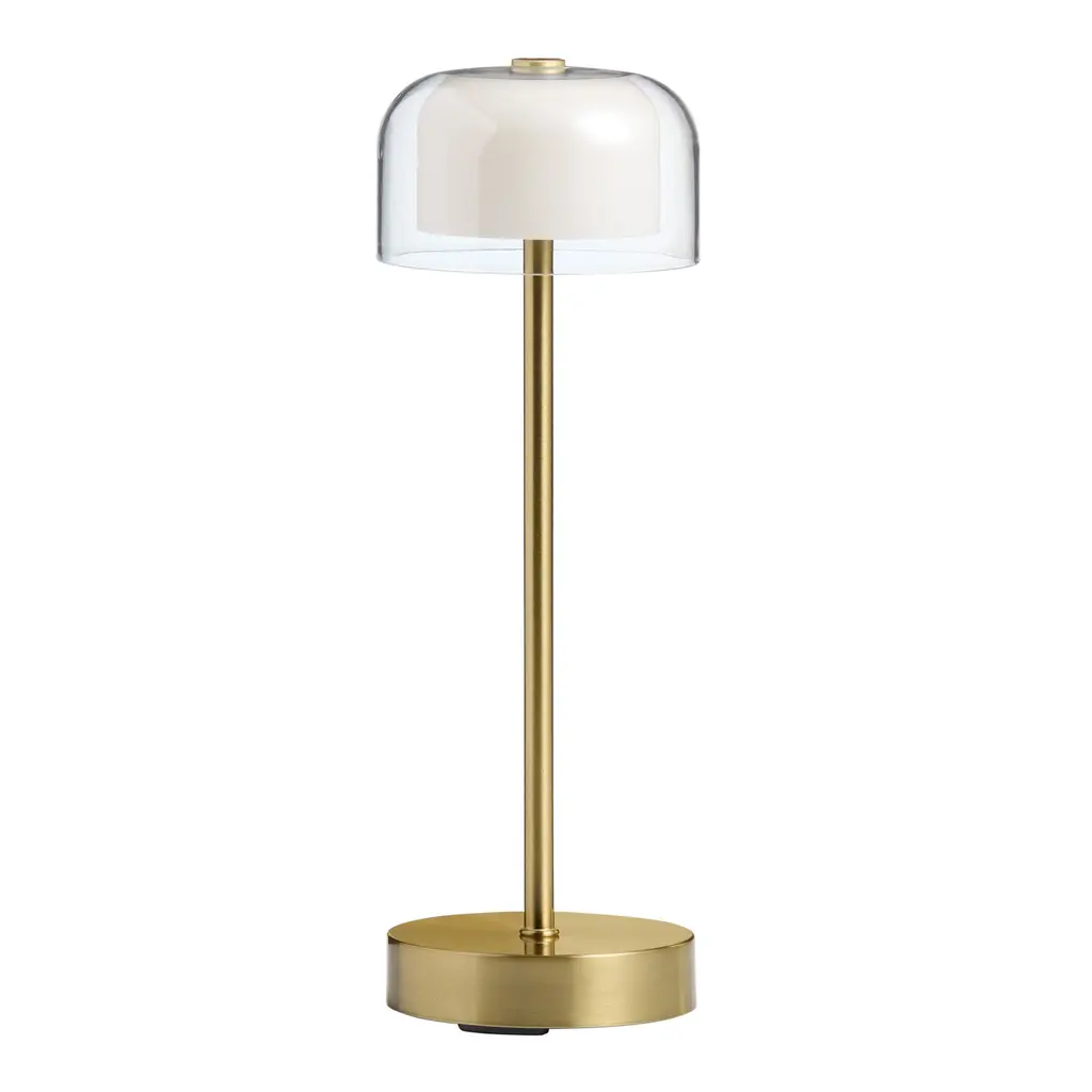A portable light with a sophisticated style, our antique-brass LED touch lamp features a double-dome shade with a frosty white interior and transparent exterior. A tap-touch function at the top of its twin shades cycles though three color-temperature settings, from soft-yellow mood lighting to warm white illumination. Lasting for hours on a full battery, this USB-C rechargeable accent lamp goes from your bedroom or home office to the dining room or patio.