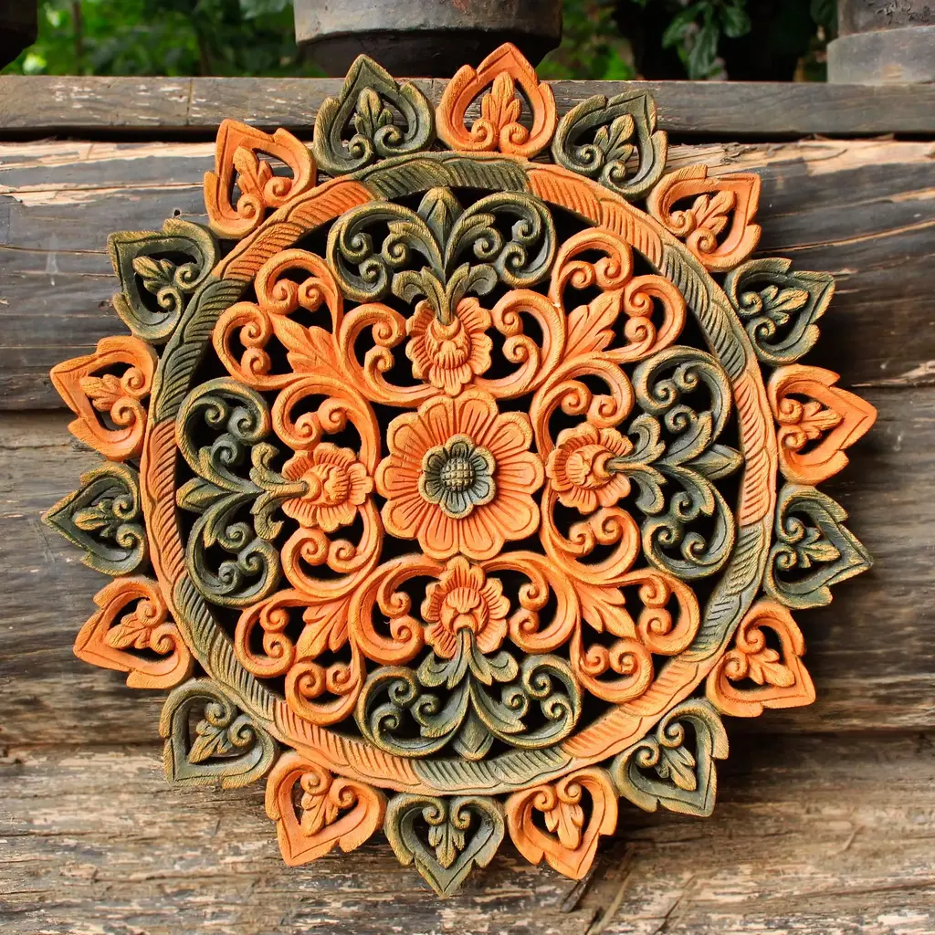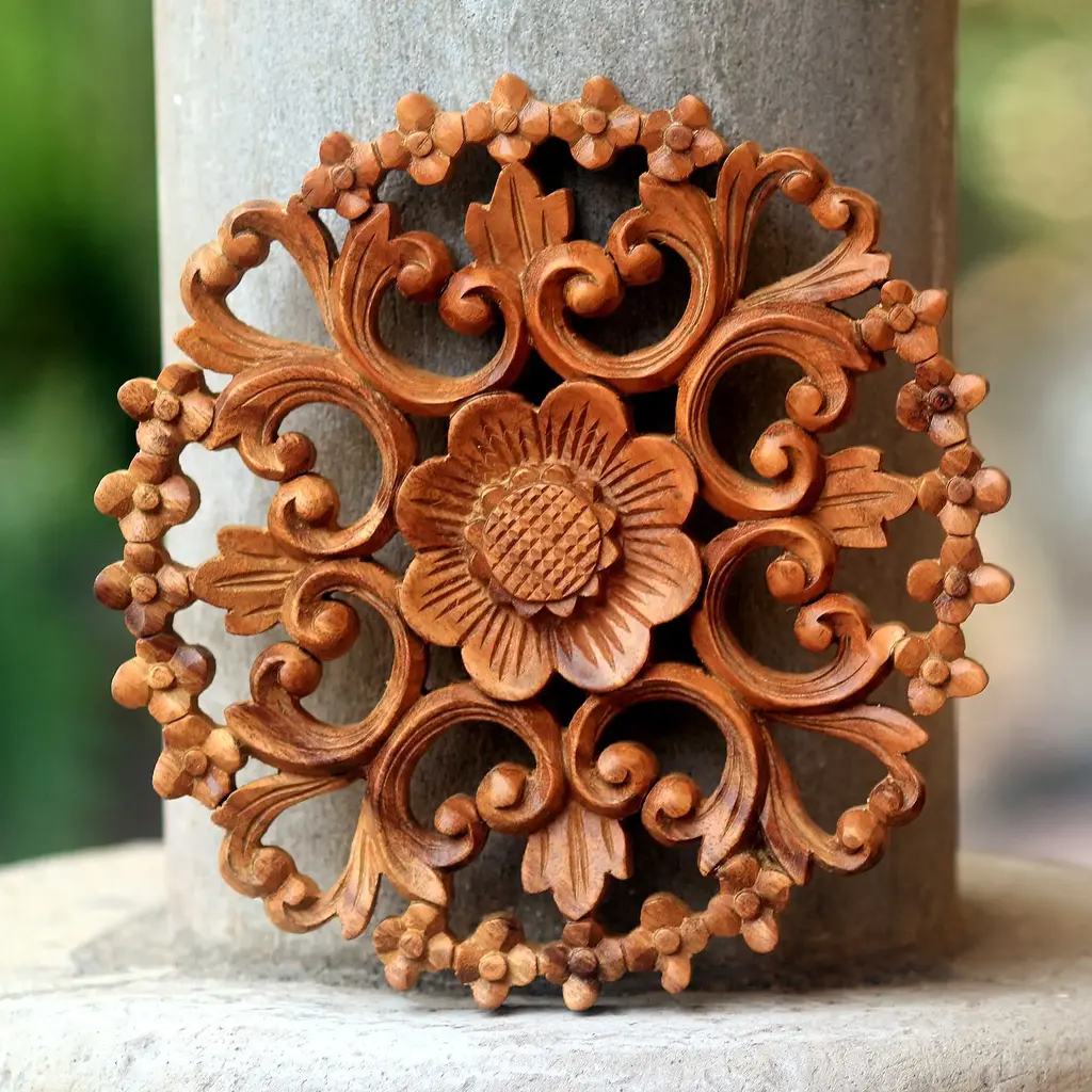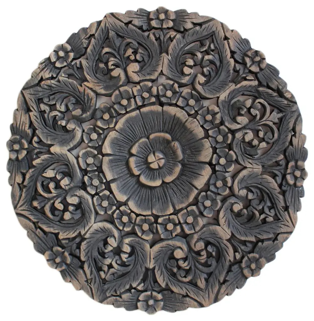 Hand carved teak Burmese panel. Traditional intricate floral designs used for various decorate purposes. Fabulous in groupings used as headboards ceiling plates or as interesting exterior design elements. Each may vary slightly in exact finish, handmade differences, and natural imperfections. This item is non-returnable - all sales are final.