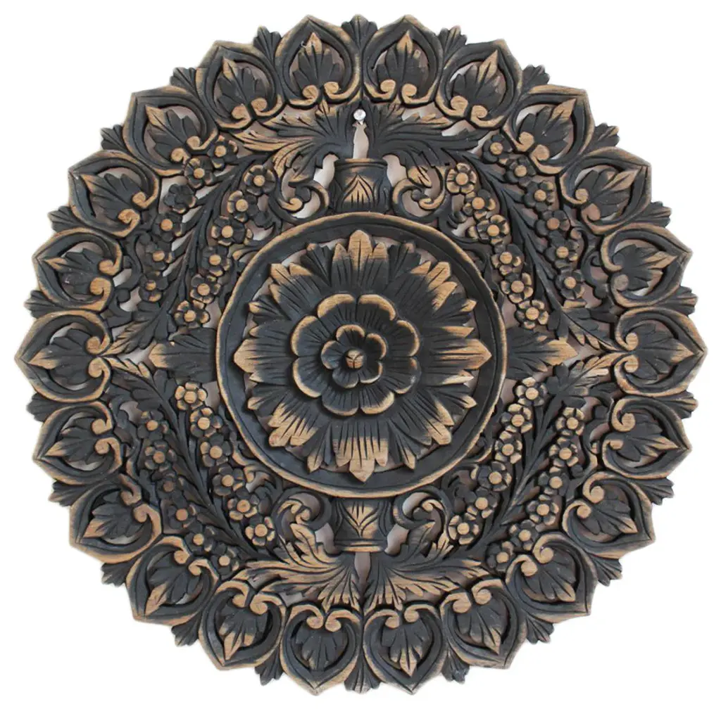 Hand carved teak Burmese panel. Traditional intricate floral designs used for various decorate purposes. Fabulous in groupings used as headboards ceiling plates or as interesting exterior design elements. Each may vary slightly in exact finish, handmade differences, and natural imperfections. This item is non-returnable - all sales are final.