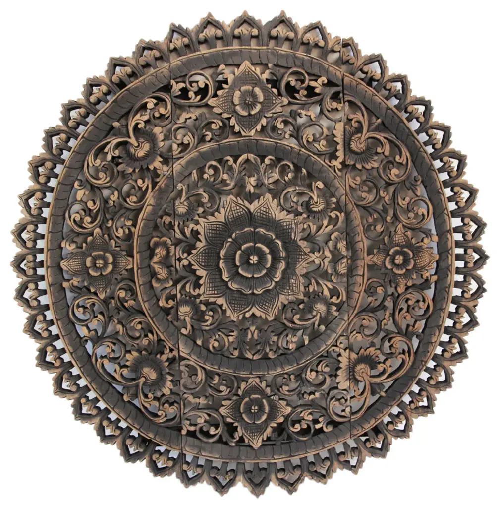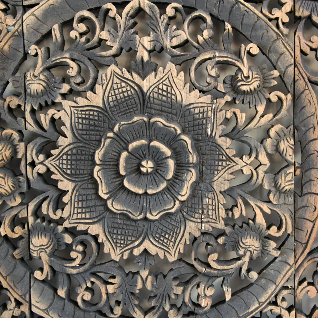 Hand carved teak medallion panel are a traditionally made by Burmese artisans with intricate floral designs and antiqued two tone burned finish. These beautiful panels are used for various decorative purposes displayed in groupings, used as headboards, ceiling plates or as an interesting exterior or interior design element. Larger sizes may be broken down into separate panels. Each may vary slightly in exact finish, handmade differences, and natural imperfections. This item is non-returnable - all sales are final.