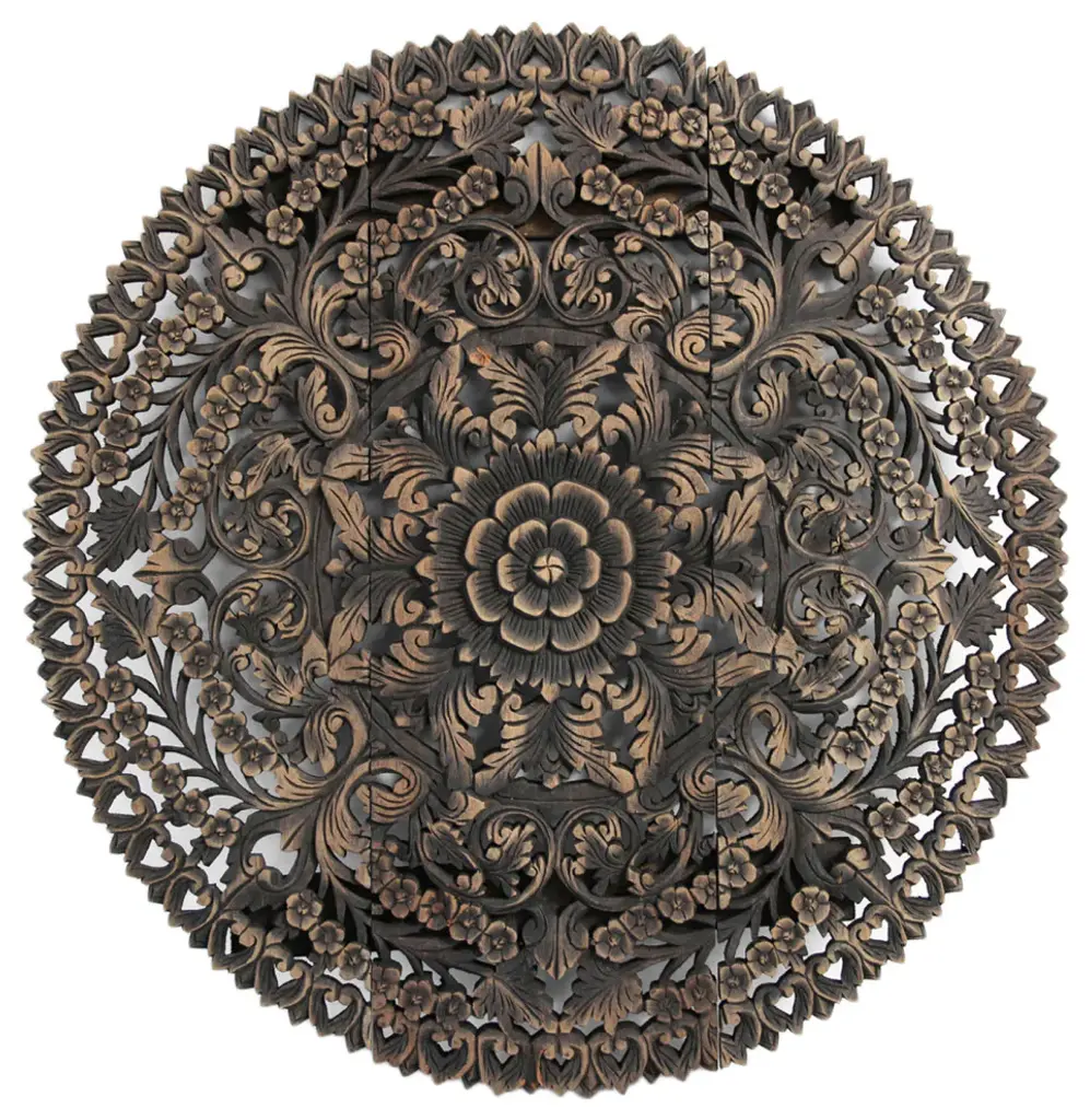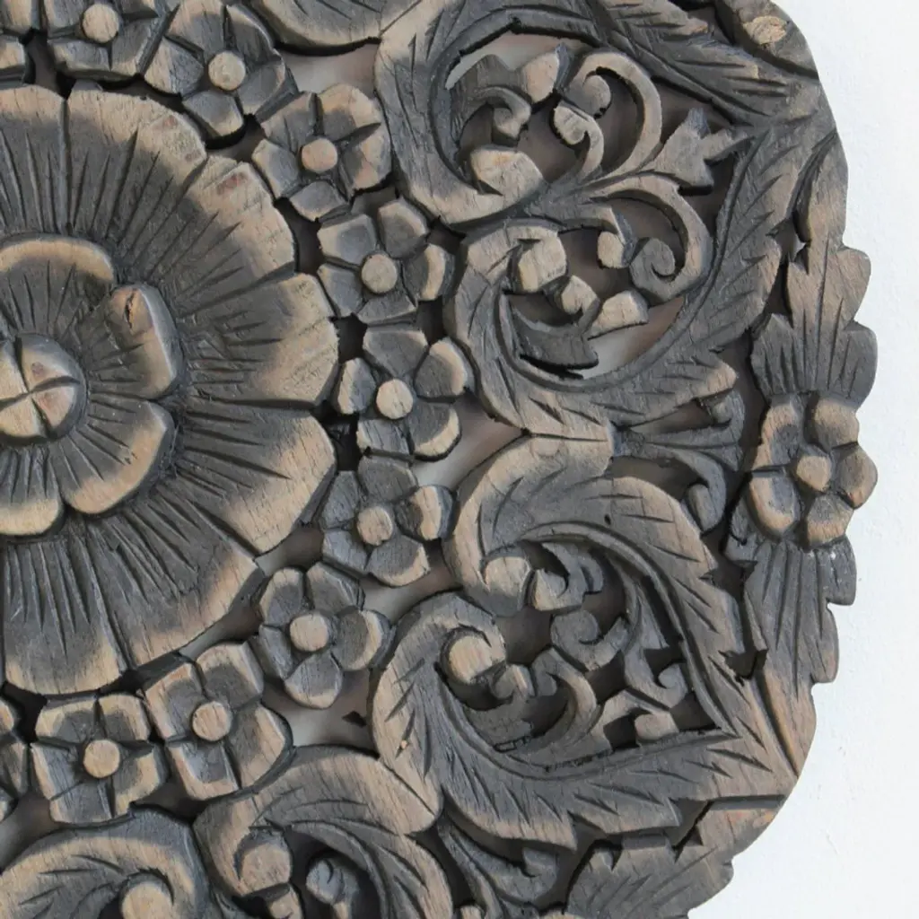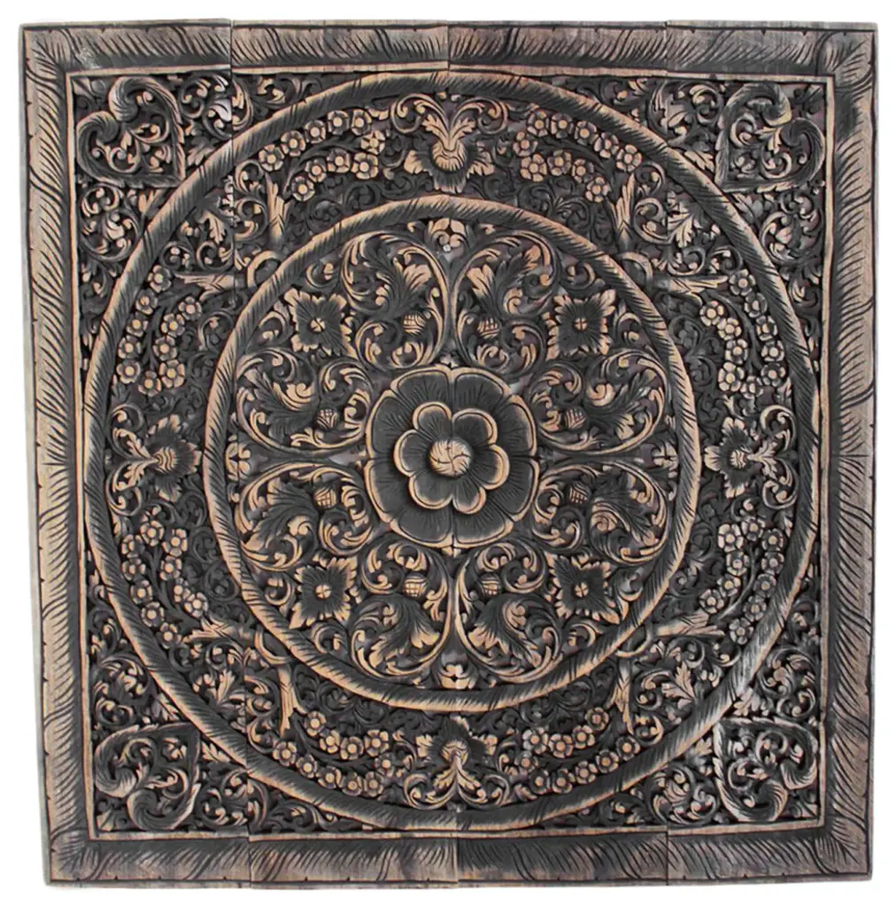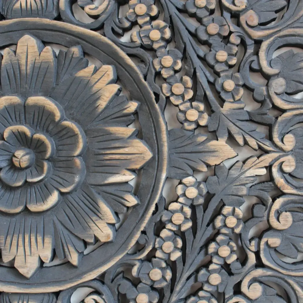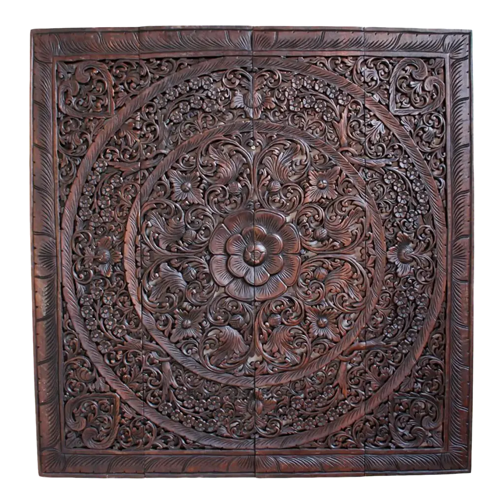 Hand carved teak medallion panel are a traditionally made by Burmese artisans with intricate floral designs and antiqued two tone burned finish. These beautiful panels are used for various decorative purposes displayed in groupings, used as headboards, ceiling plates or as an interesting exterior or interior design element. Larger sizes may be broken down into separate panels. Each may vary slightly in exact finish, handmade differences, and natural imperfections. This item is non-returnable - all sales are final.