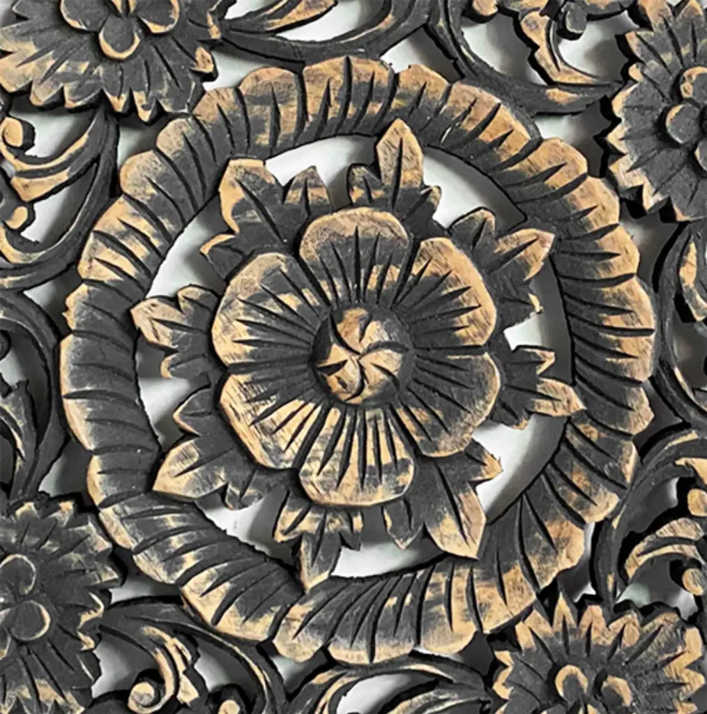 Hand carved teak medallion panel are a traditionally made by Burmese artisans with intricate floral designs and antiqued two tone burned finish. These beautiful panels are used for various decorative purposes displayed in groupings, used as headboards, ceiling plates or as an interesting exterior or interior design element. Larger sizes may be broken down into separate panels. Each may vary slightly in exact finish, handmade differences, and natural imperfections. This item is non-returnable - all sales are final.