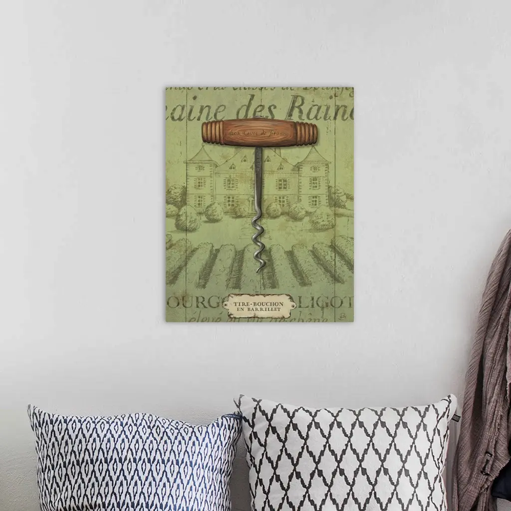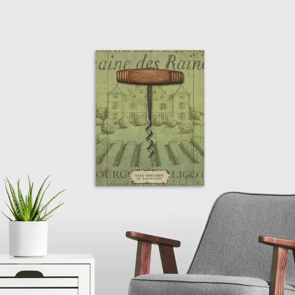 This vertical decorative art is perfect for the wine aficionado or kitchen wall art; the wall art has an antique corkscrew superimposed over a drawing of a house, vineyard, and type in French.