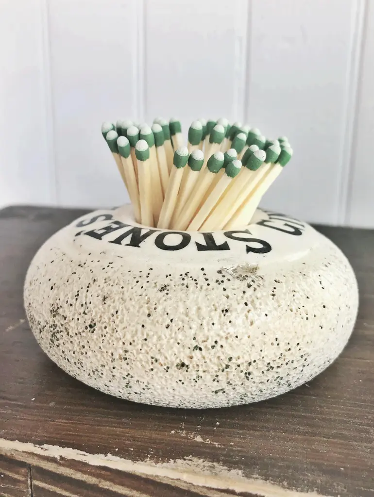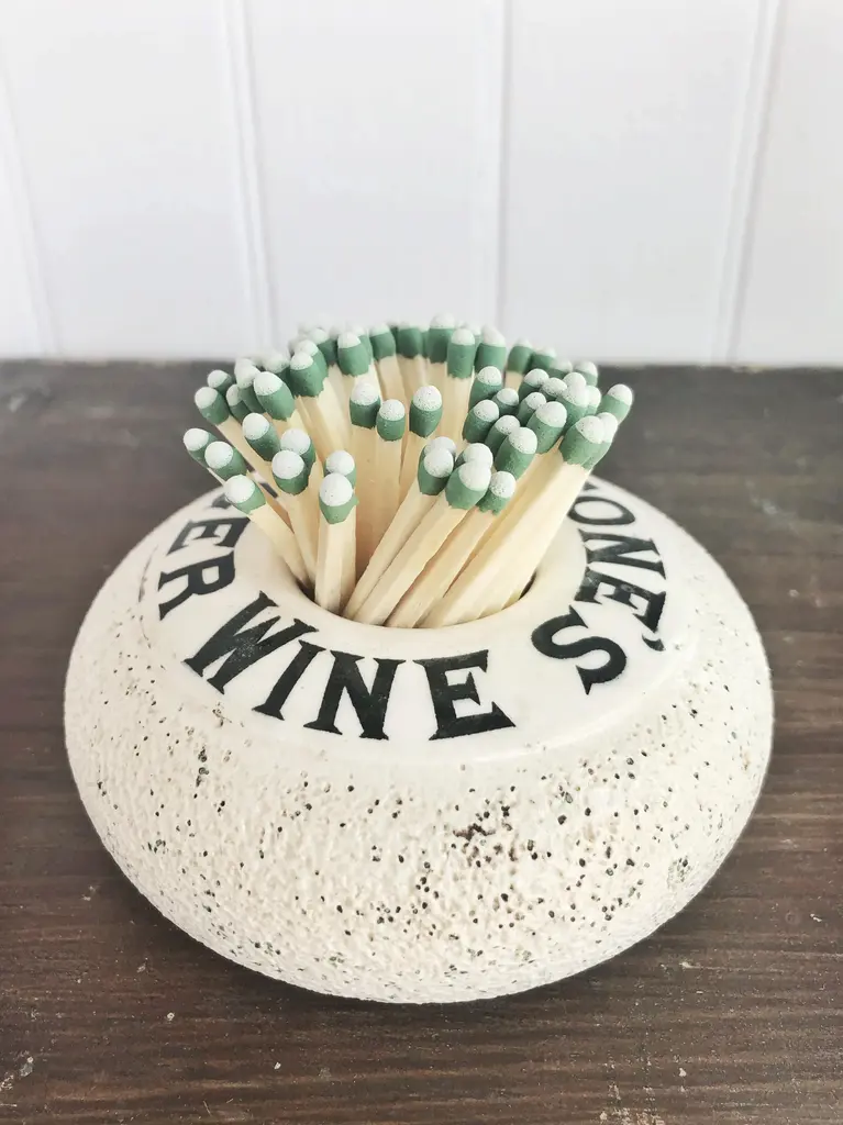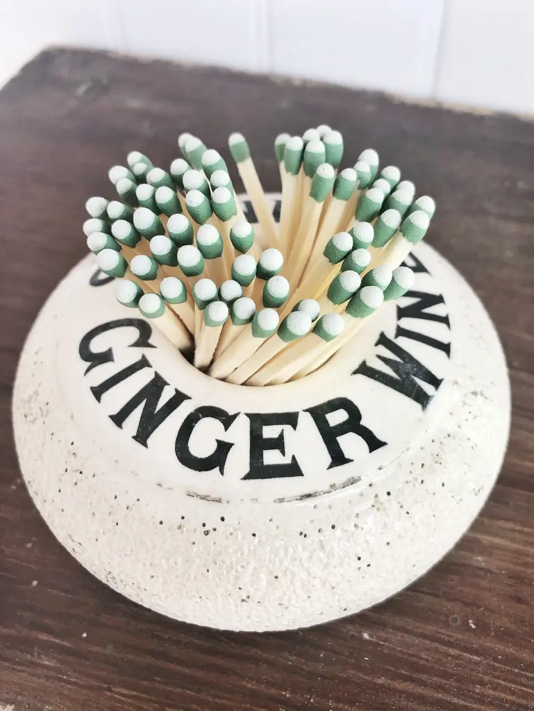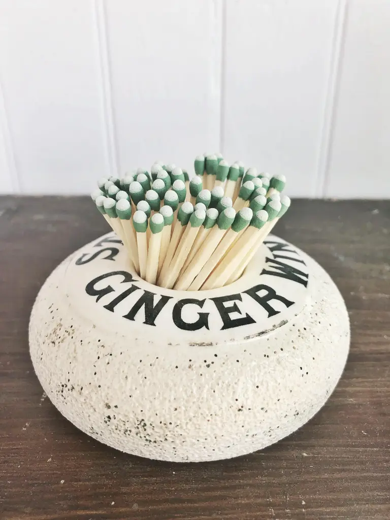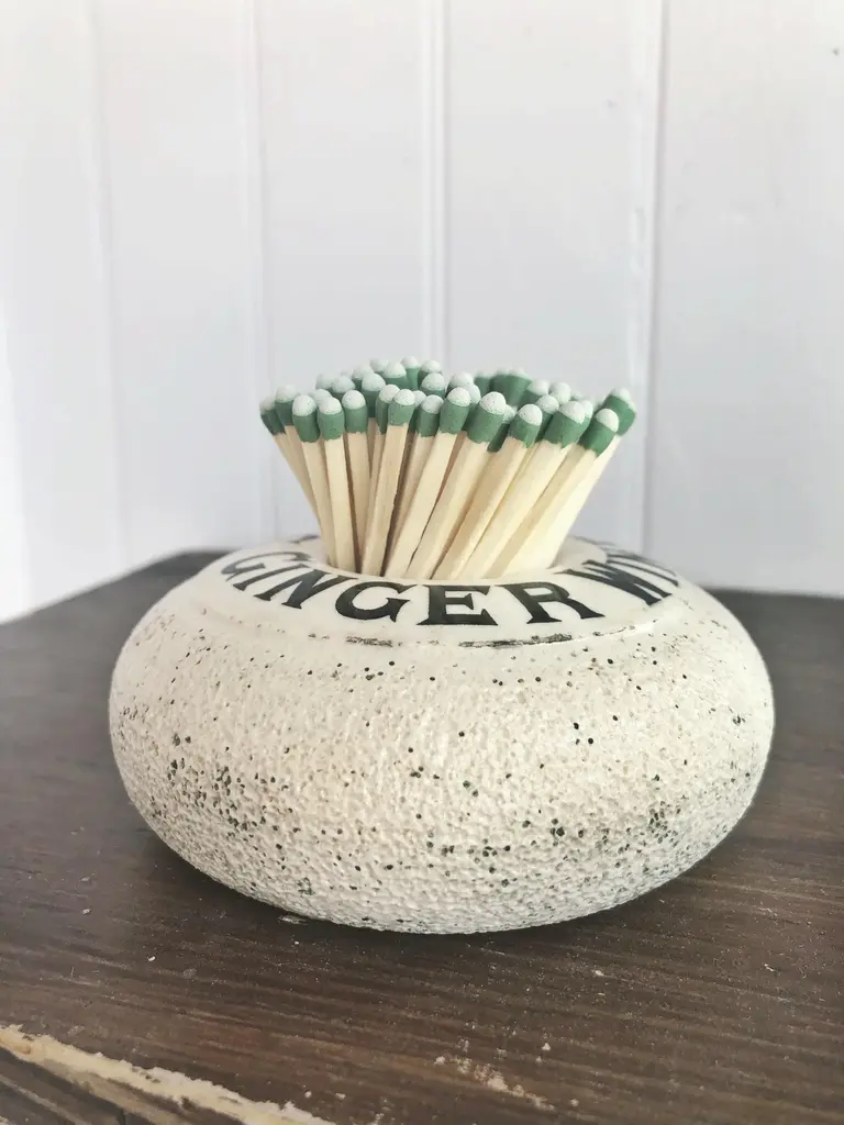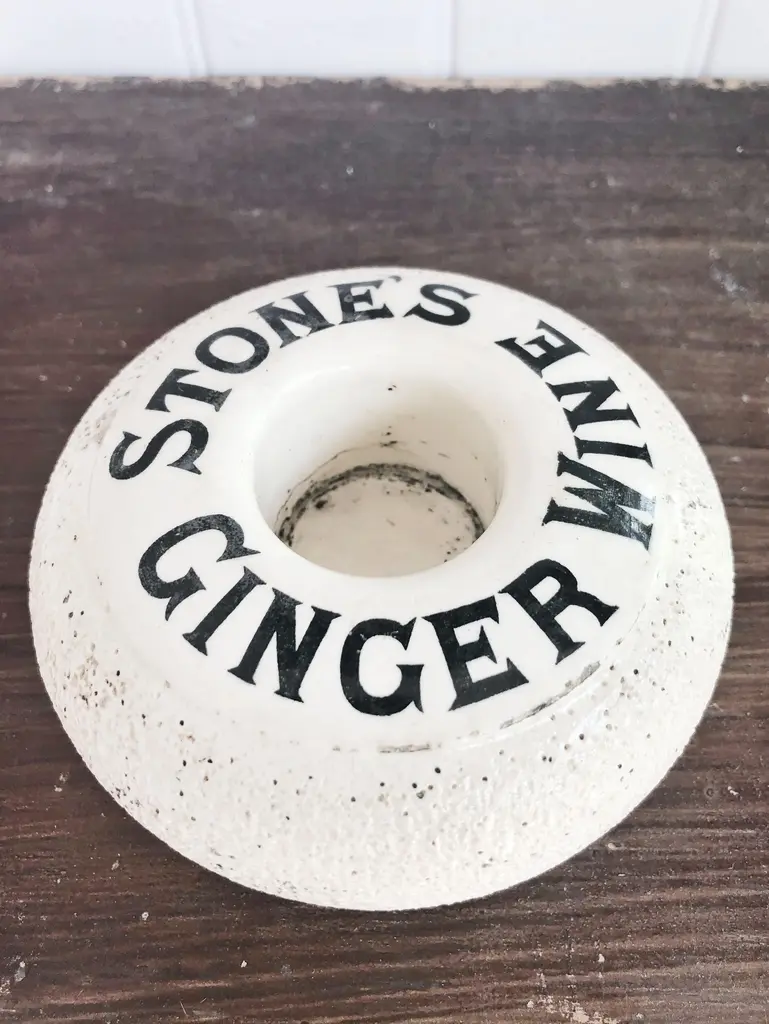 An antique English stoneware match strike, made to be used in a pub to advertise ginger wine. In excellent condition for it's age, no cracks or damage, just lots of crazing to the glaze and a few tiny spots of discoloration. Measures approx. 4" across by 1.75" tall.