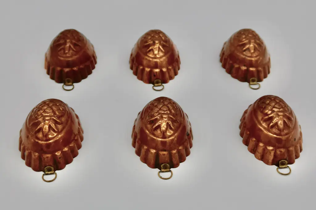 A lovely set of early 1920's French copper molds. They are tin lined, each with its original hanger. Selling three (3) sets of two (2) molds, each for $115. If you would like to purchase all three for a discount, please contact our page.