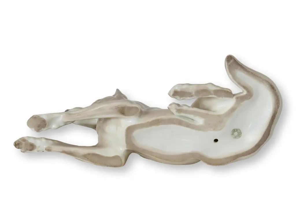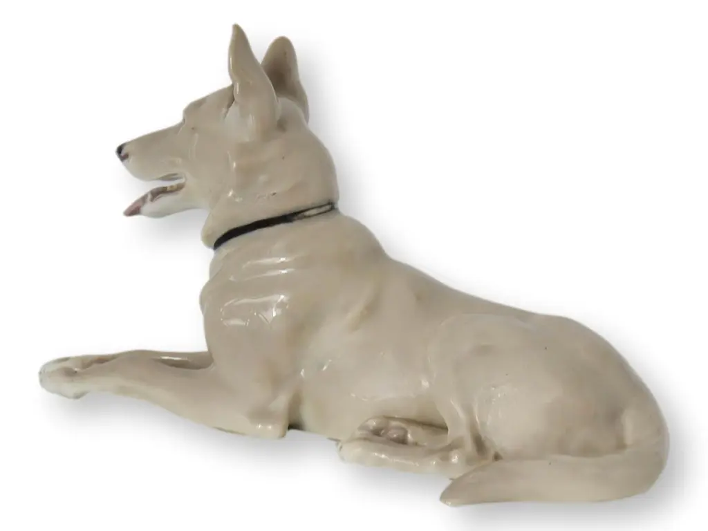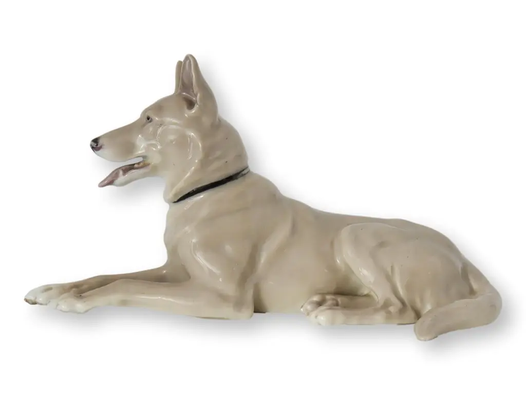 Crafted by Gebruder Heubach, this grey German Shepherd porcelain figurine showcases precise detailing and the brand's renowned craftsmanship. An authentic representation of the breed, it stands as a classic piece for collectors and enthusiasts. Made in Germany, its subtle elegance makes it a timeless addition to any animal lovers collection. Signed on the bottom.