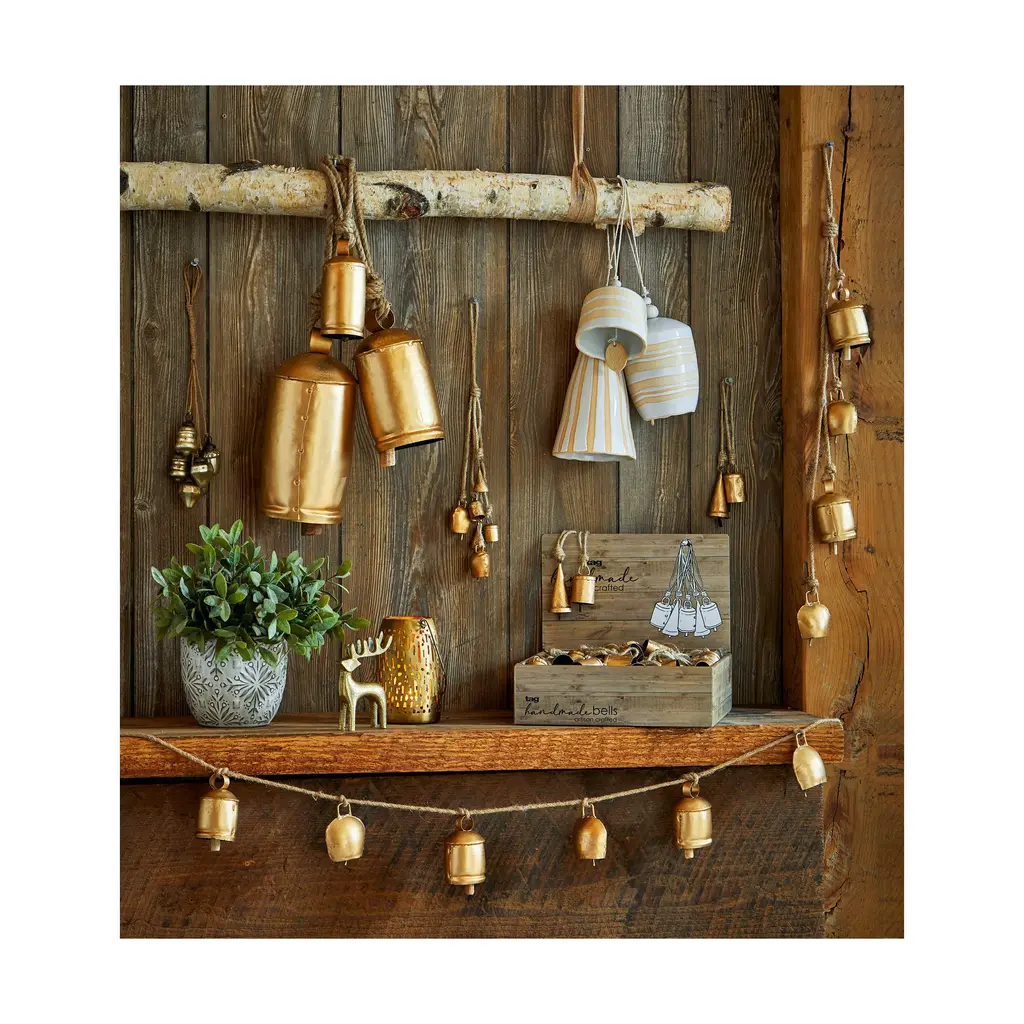add a distinctive, magical touch to your home this holiday season. made from wrought iron, mango wood, and jute these hanging bells are the perfect addition to any mantel, window ledge, or chair back. the weathered, antique look brings a vintage vibe without sacrificing style or elegance. mix and match with multiple sizes and styles for a more dramatic effect. hand assembled. slight color variations are to be expected each piece is one-of-a-kind, no two pieces will be exactly alike.Wrought iron, mango wood, and jute construction. Rope for hanging. Burned gold finish.Crafted from wrought iron , mango wood & jute ropeBells measure 10.25 inch h x 4.5 inch l x 4.5 inch w.