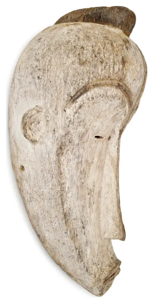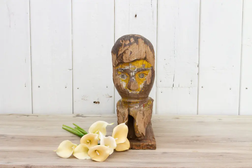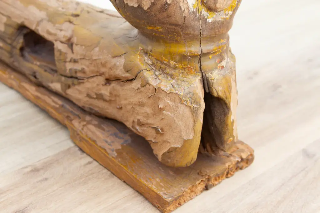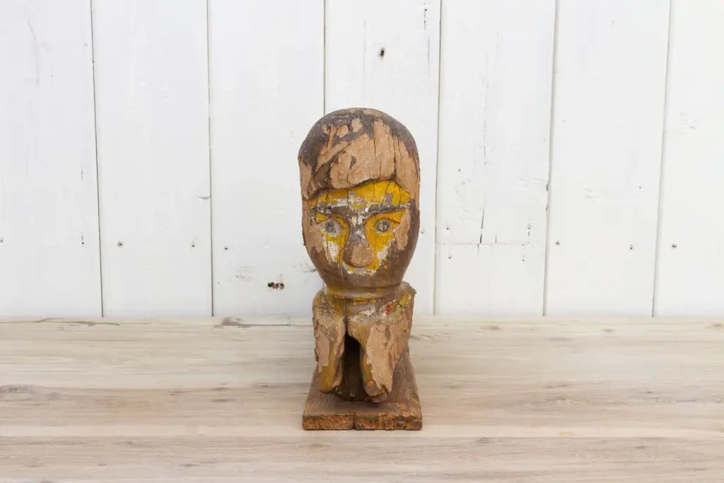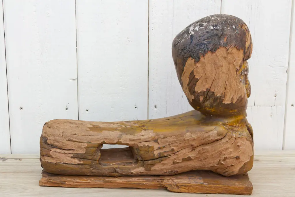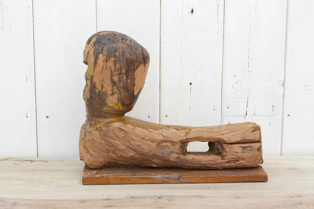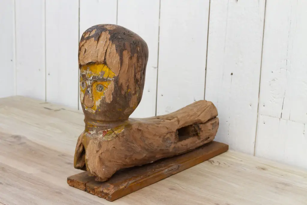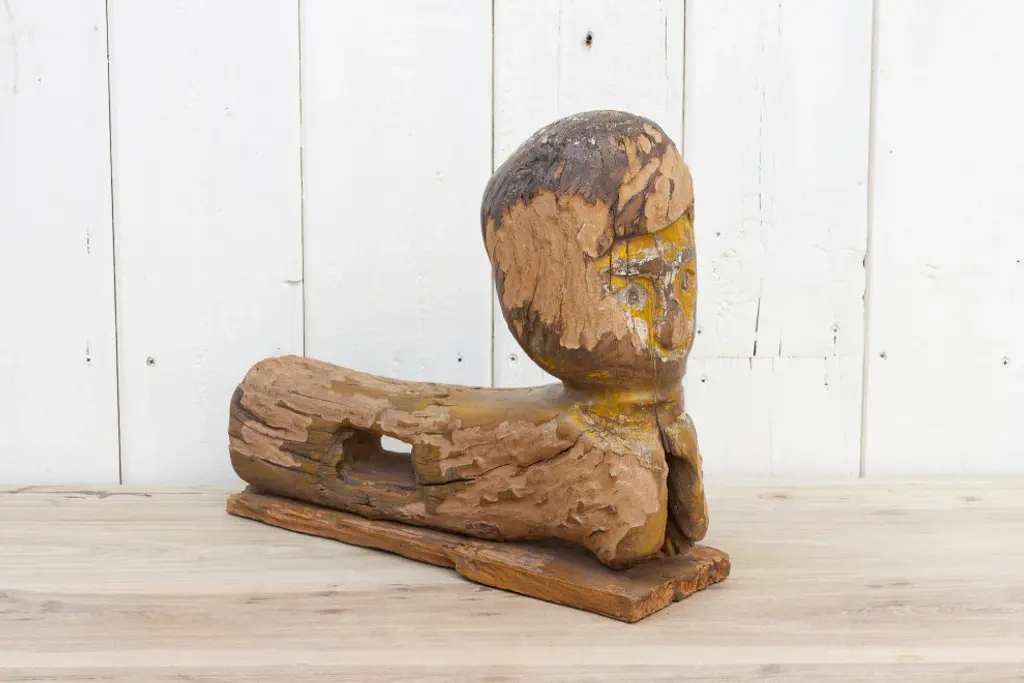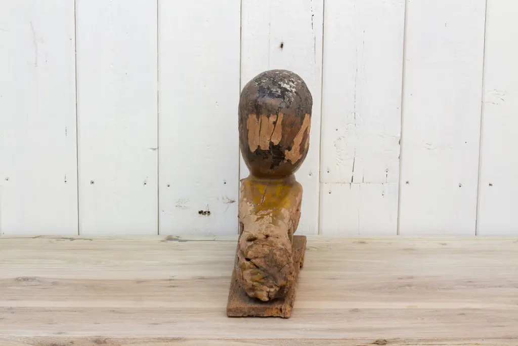 19th Century architectural decorative corbel from Java, this antique carving was originally part of a building facade. This tribal Javanese statue has a carved rounded head with an elongated body. This antique folk carving has a fitting patina with wear and oxidation but it preserves part of its original yellow color.