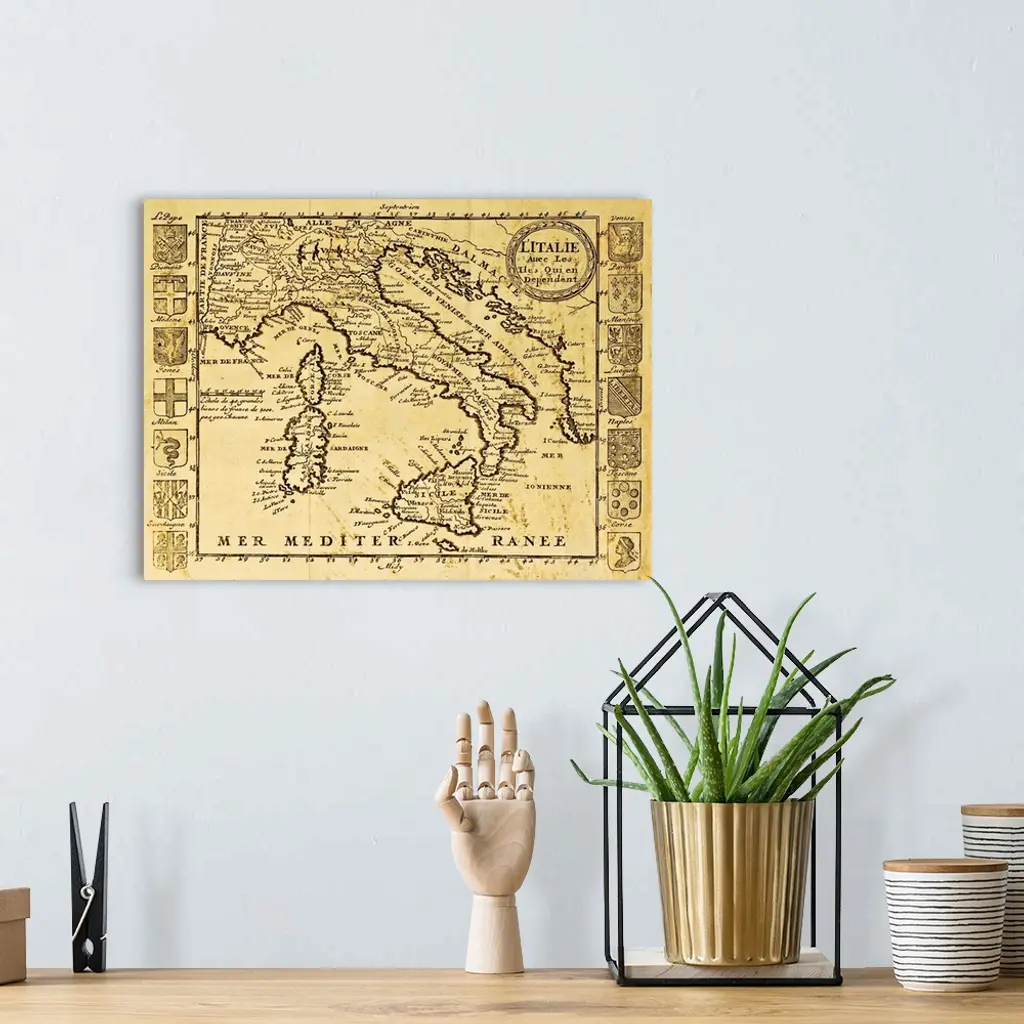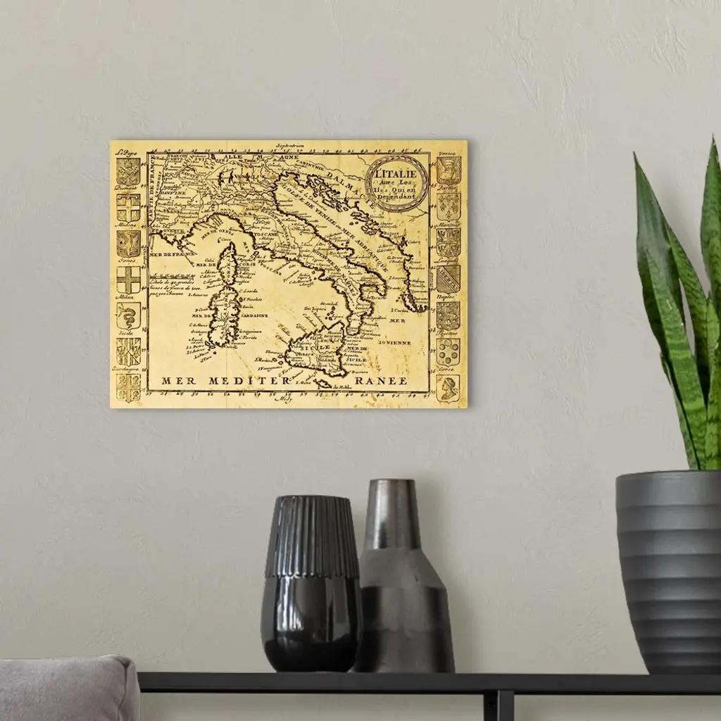 Antique Map Of Italy Framed By Territorial Crests