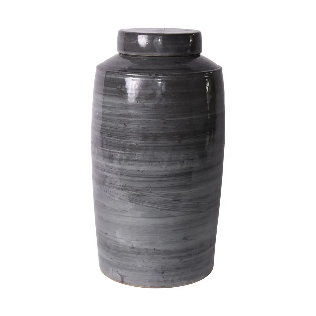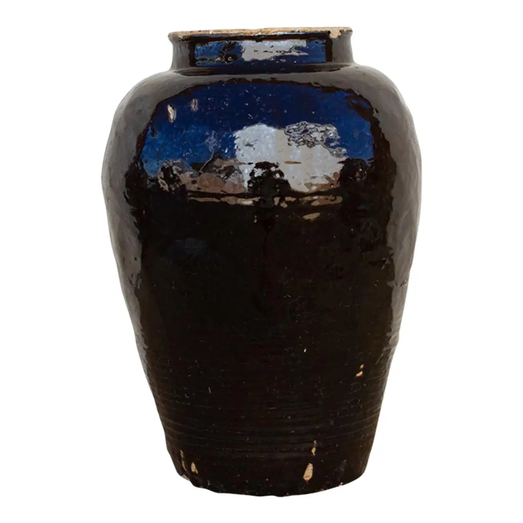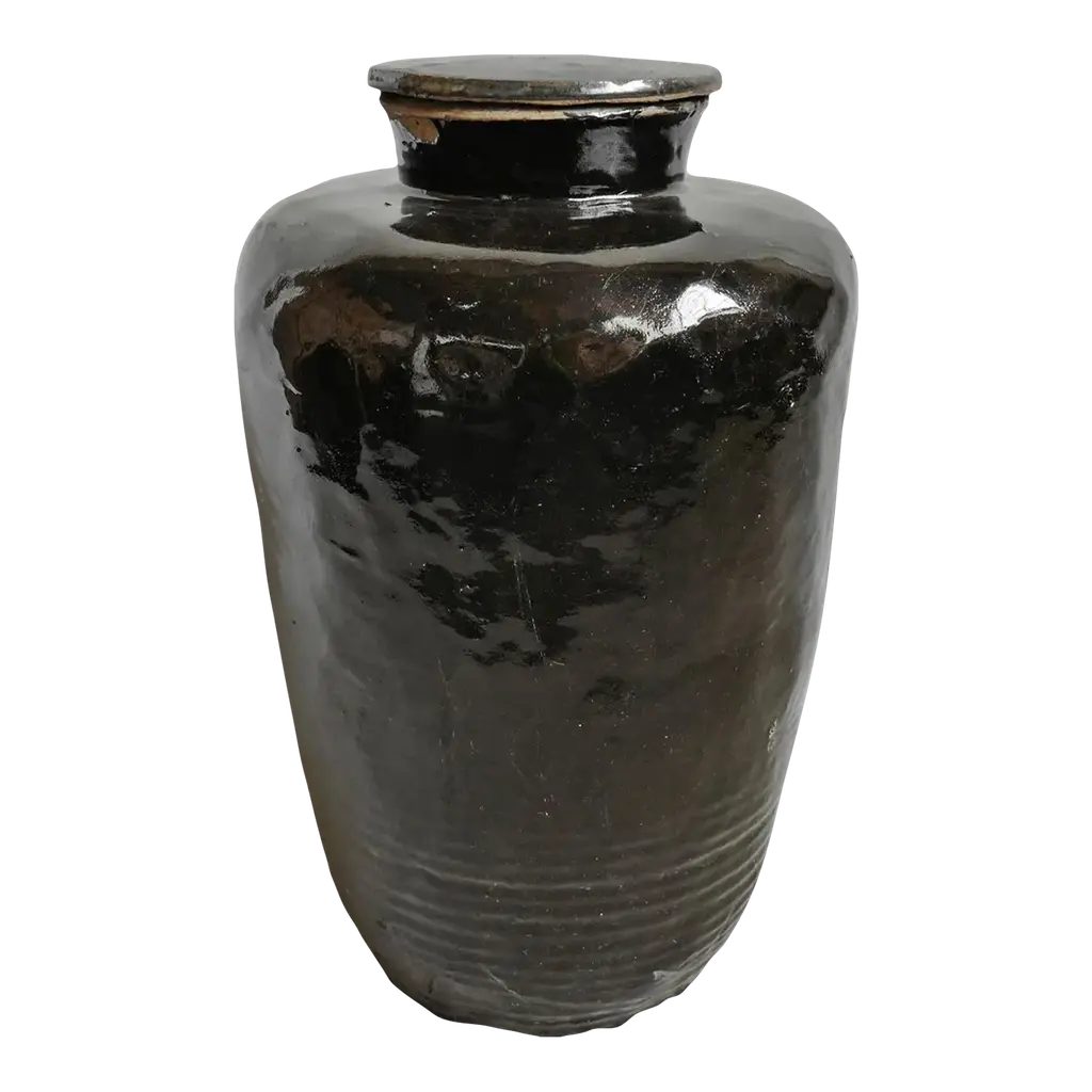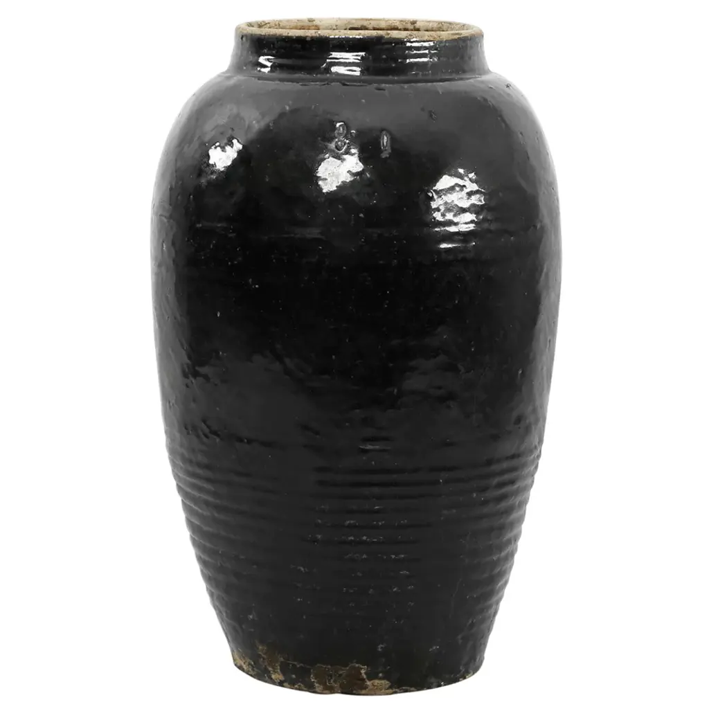 A large antique Southeast Asian pottery Martaban jar with a Henan style glaze and moulded ribbed details. These jars were used to carry Mango and pickles on the silk route.