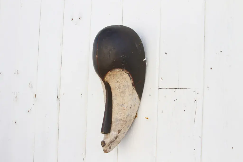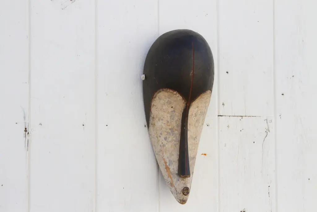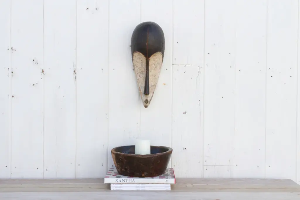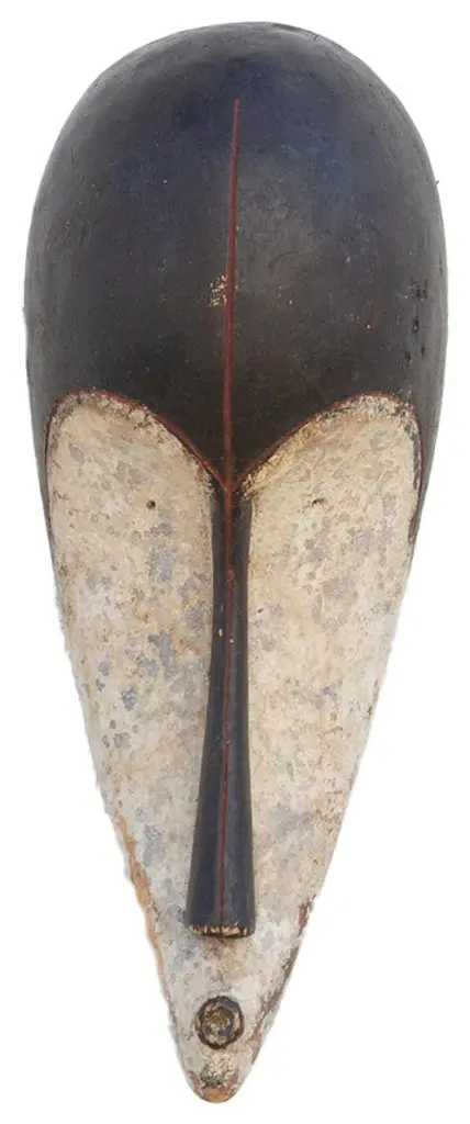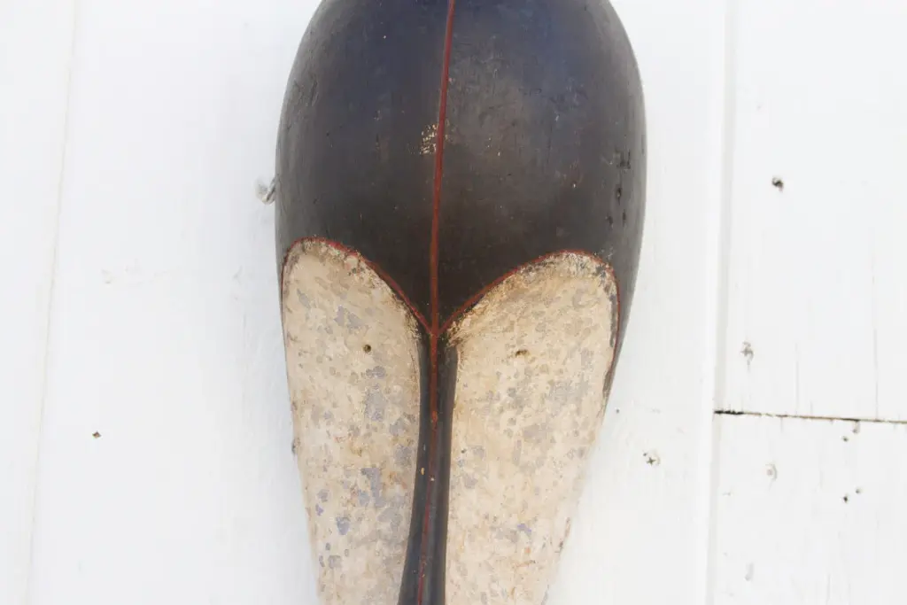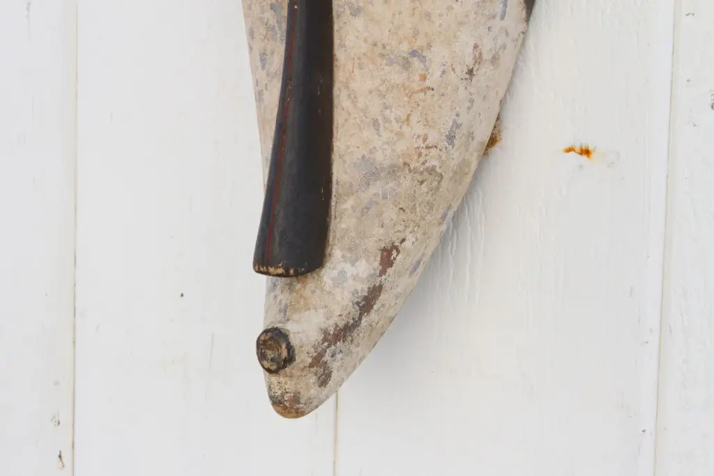 This antique African mask is a traditional mask that was used by the Fang tribe in Western Africa for various cultural and ceremonial purposes. This Fang face mask has been carved from wood, with delicate facial features that are both elegant and intricate. The mask is painted in black and white, with the black representing death and the white representing life. The black and white colors on the mask are arranged in an alternating pattern, which gives the mask a striking and powerful appearance. This African mask has a prominent nose, high cheekbones, and a small mouth. The eyes are almond-shaped and slanted, which gives the mask a sense of mystery and intrigue. The overall shape of the mask is elongated, with a narrow chin and glass and hard-stone eyes.
