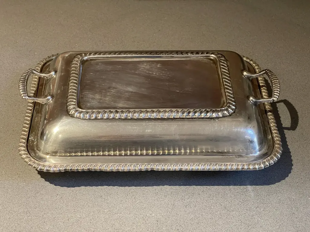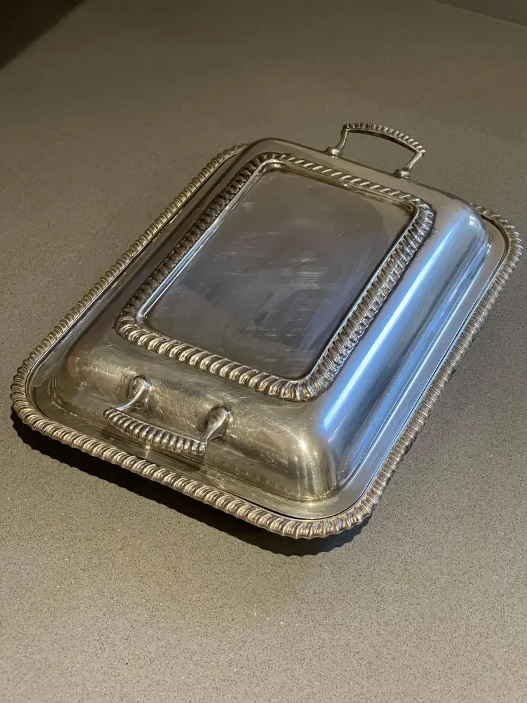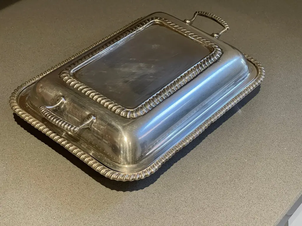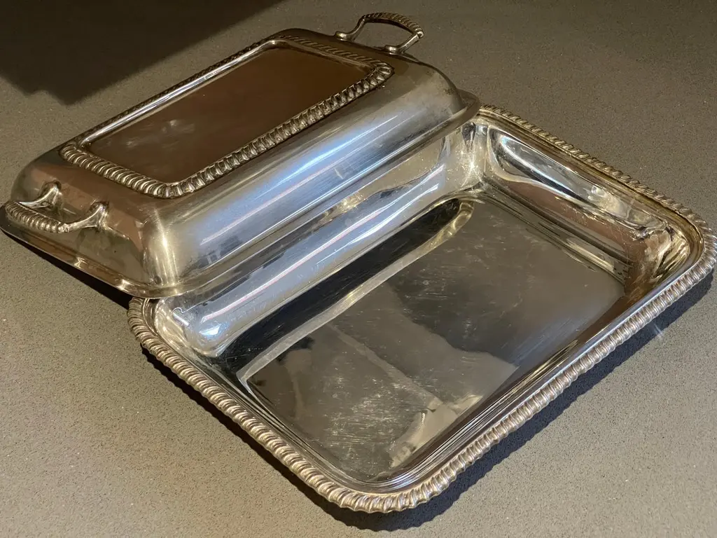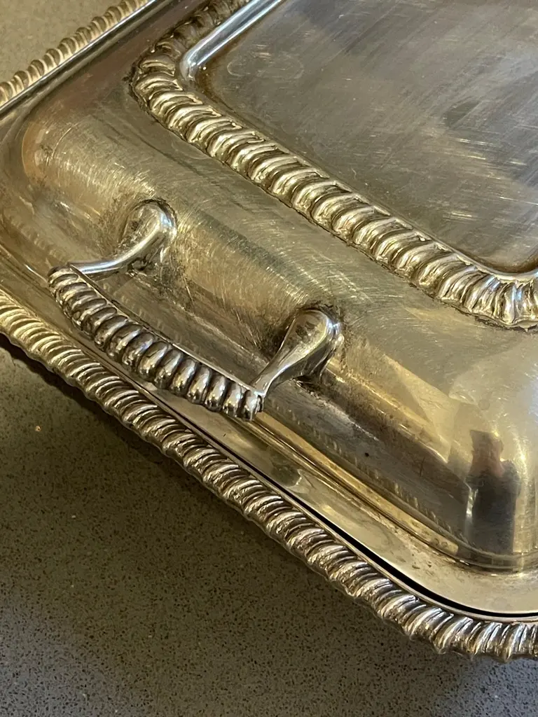 Antique Early 20th Century English Silver Plated Lidded Entree Serving DishCondition: All aspects are sound and secure and there are no dings, dents, bends or pitting. There is some rubbing on the silver plate, revealing the brassy base metal in some areas. See close-up photos of each of the corners. It has been cleaned and hand-polished and is ready to use.Also, A Pair Is Available.Impressed with the base as follows:E.P.N.SMaker's mark (please see final photo)8189Made in EnglandMeasurements (excluding handles): 28cm x 20.75cmOverall length - handle to handle: 31.5cmOverall height (with lid): 7.5cmWeight: 1.42kgWill be packaged carefully and sent via a trackable service.