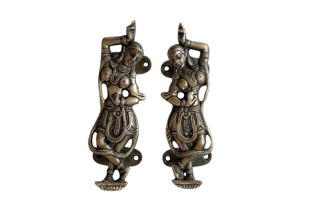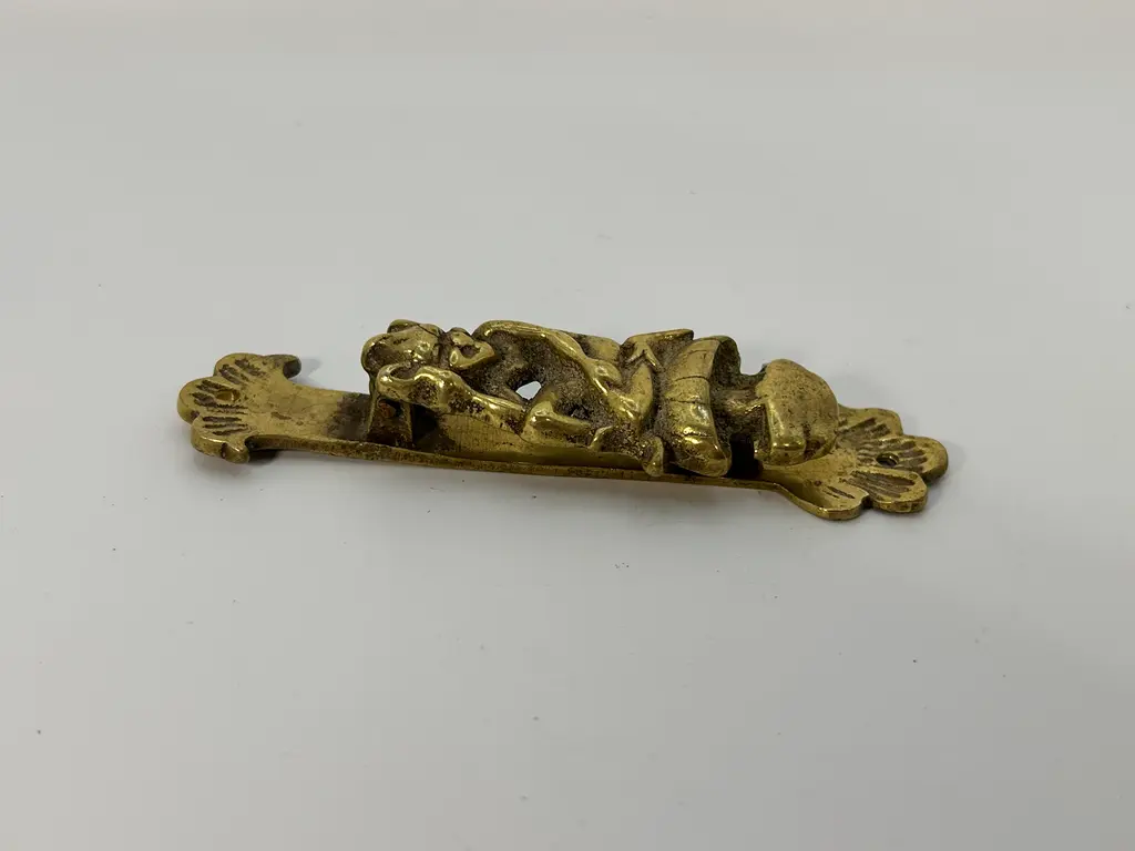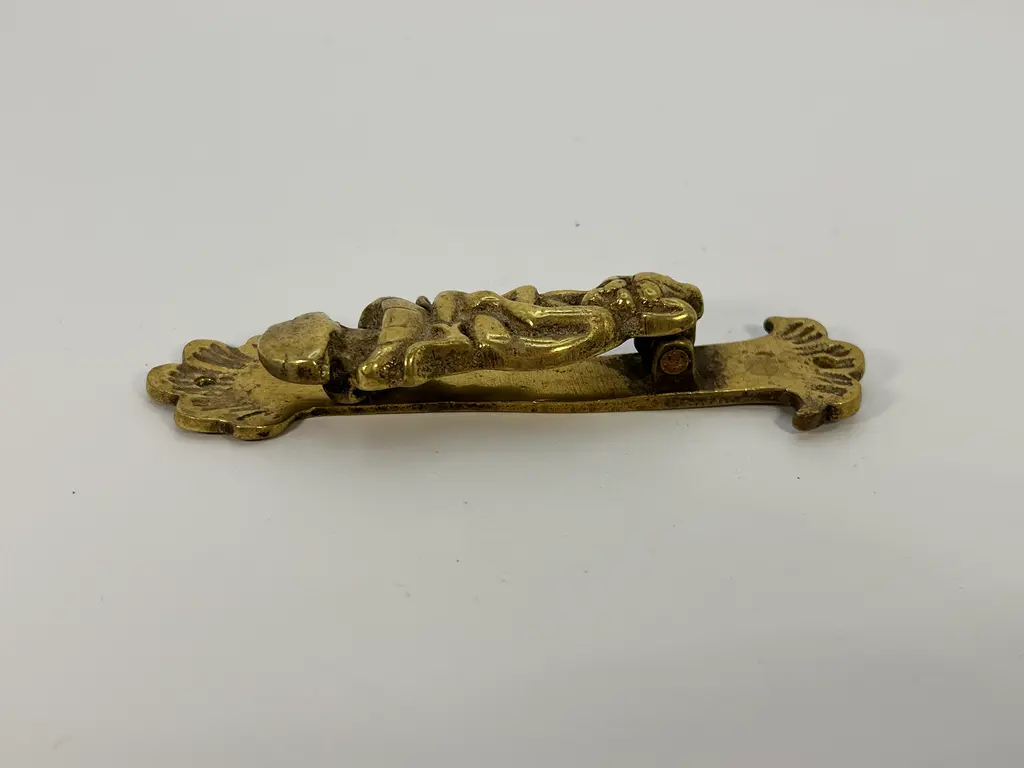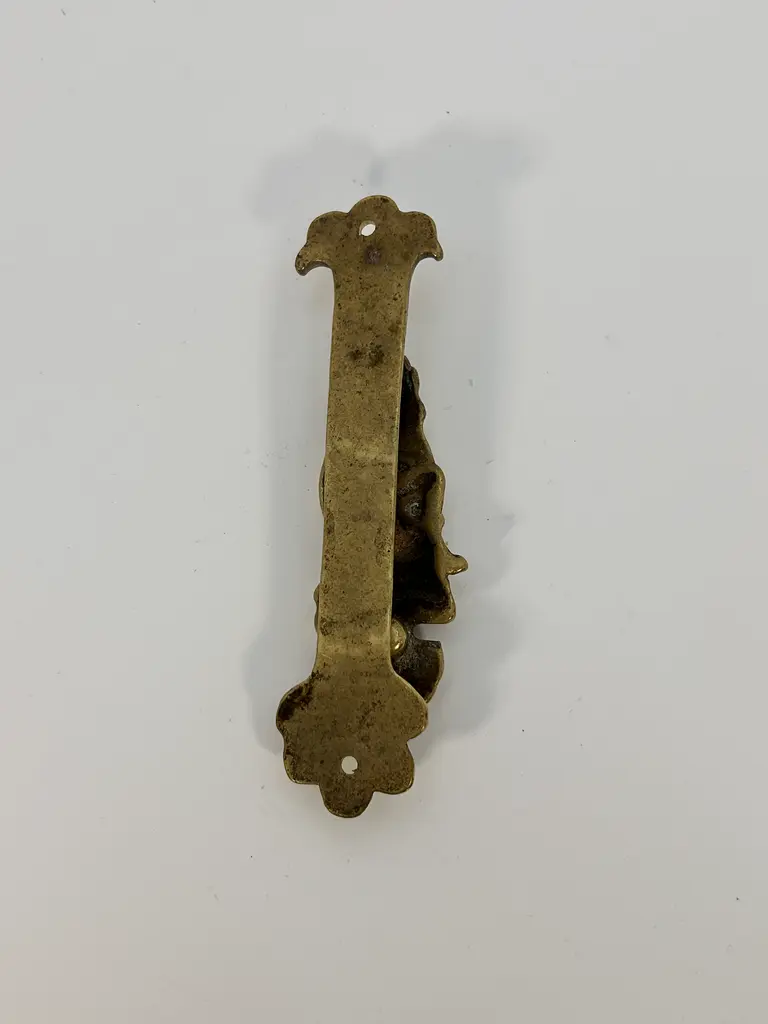 Antique solid brass door knocker in the shape of a Pixie perched on a mushroom. Sourced in England. Mounting screws not included.