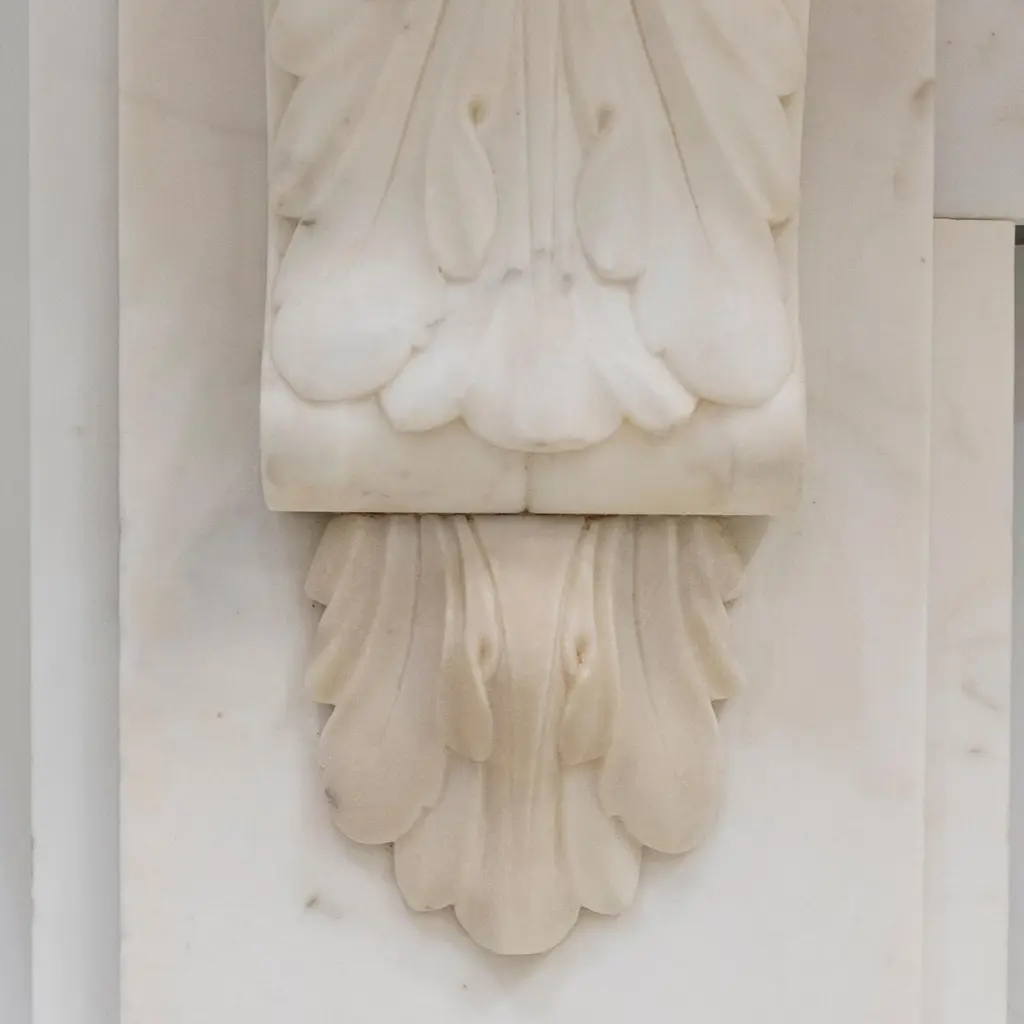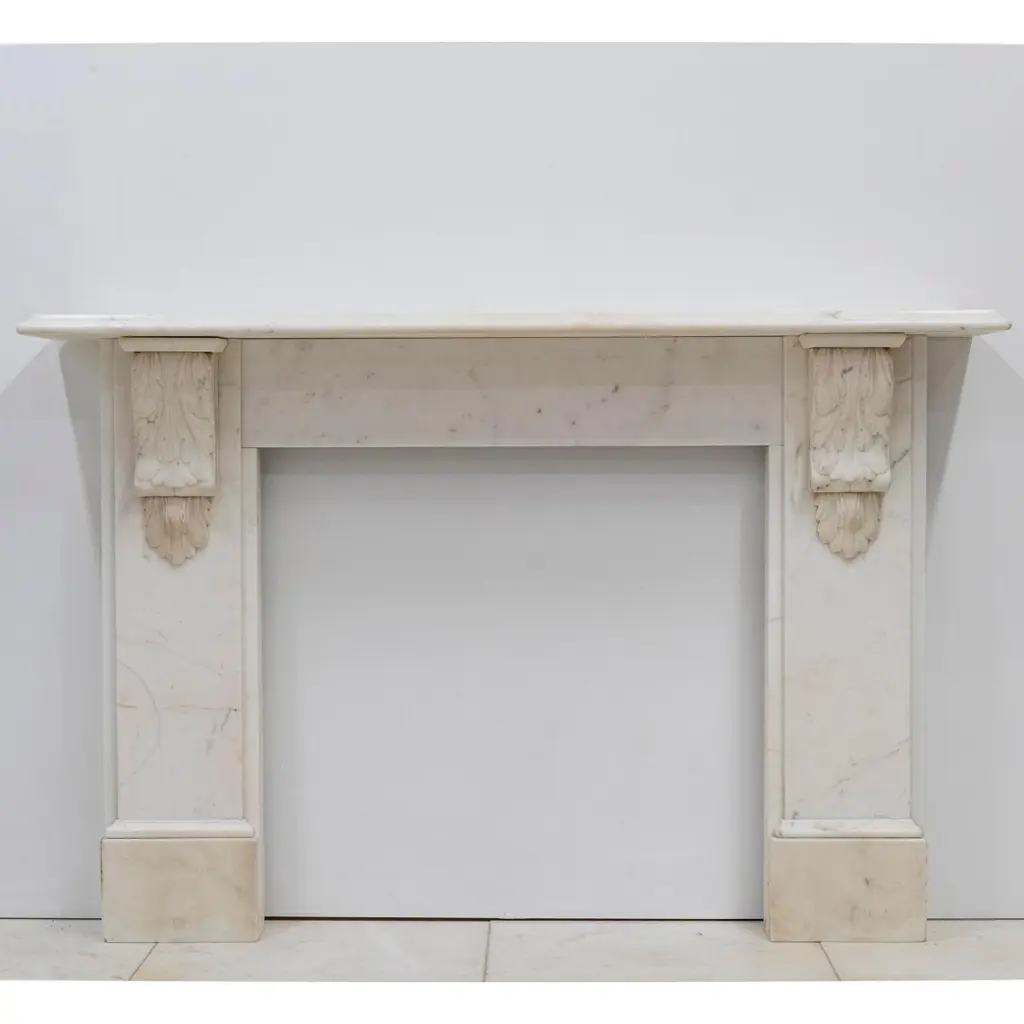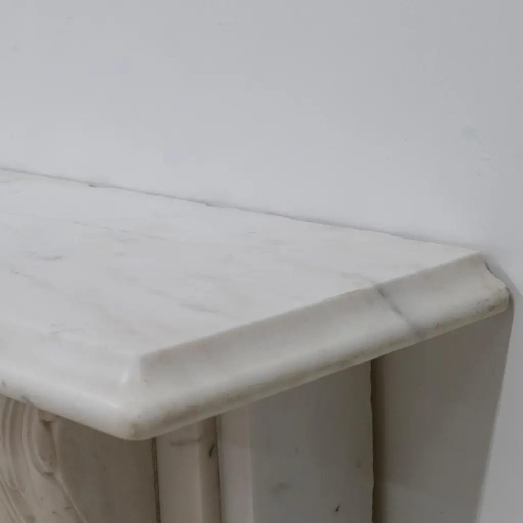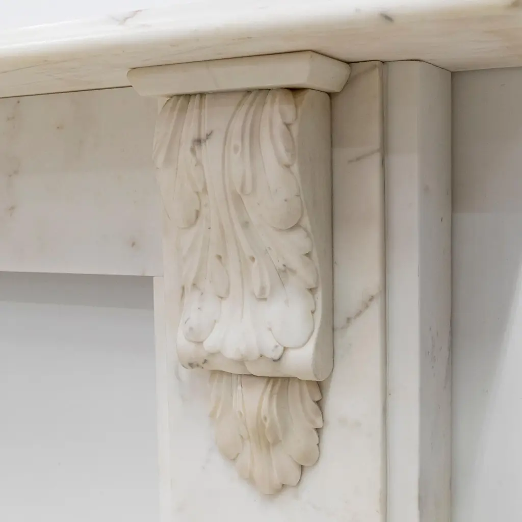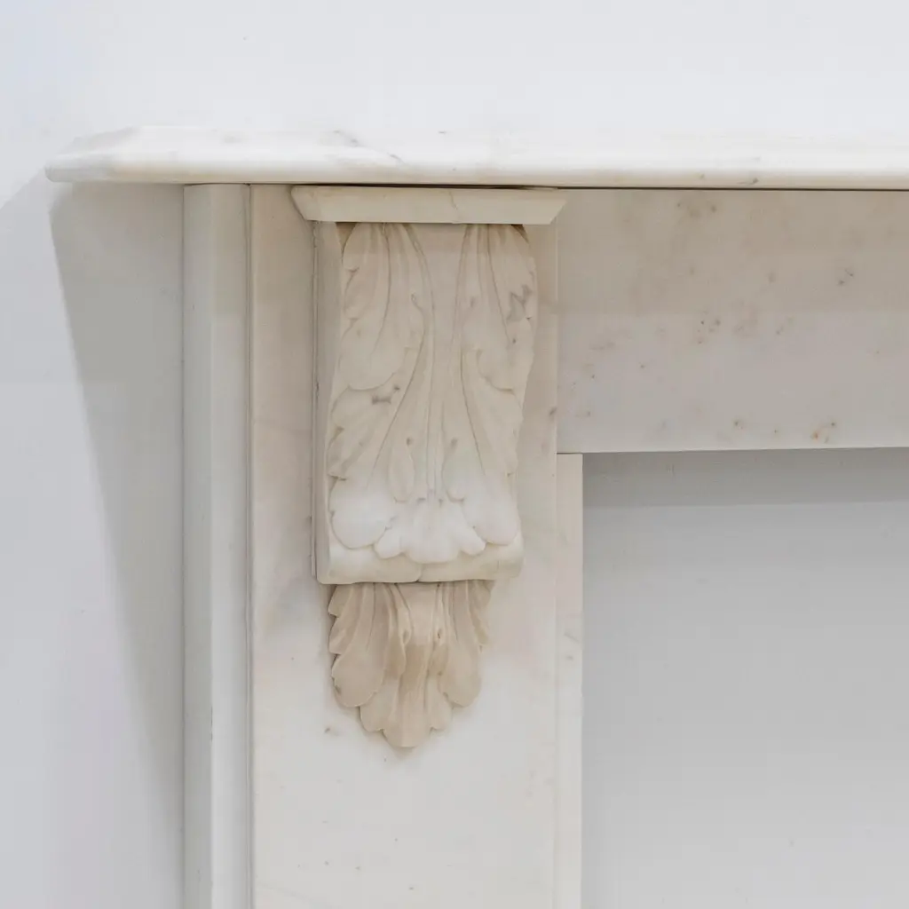 This refined early Victorian chimneypiece, crafted from fine Italian Carrara marble, showcases intricately carved corbels with foliage motifs, a large bevelled shelf rests atop.A magnificent fireplace surround, perfectly illustrating the superior design and craftsmanship celebrated during the Victorian era.DimensionsShelf: 178cm width x 31cm depthOverall height: 117cmOpening: 96cm width x 93cm heightWidth of Jambs: 29cm Dimensions are approximate.