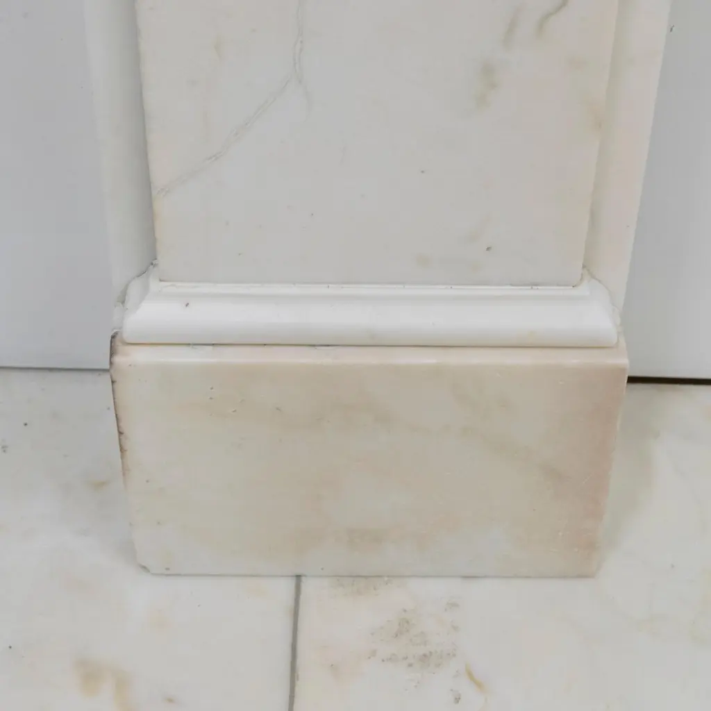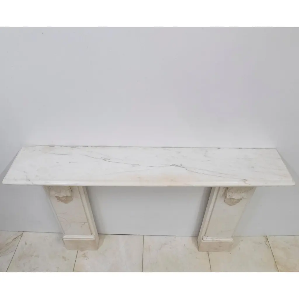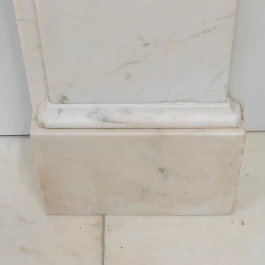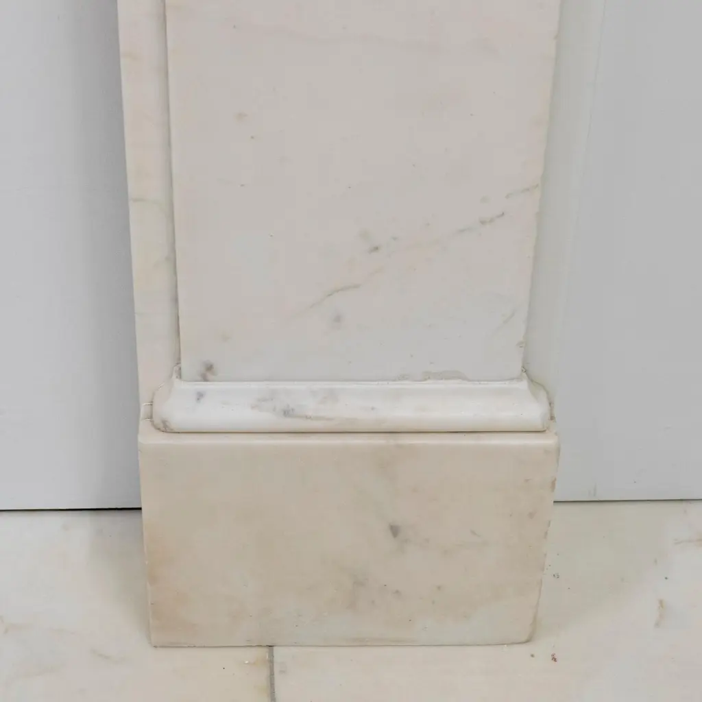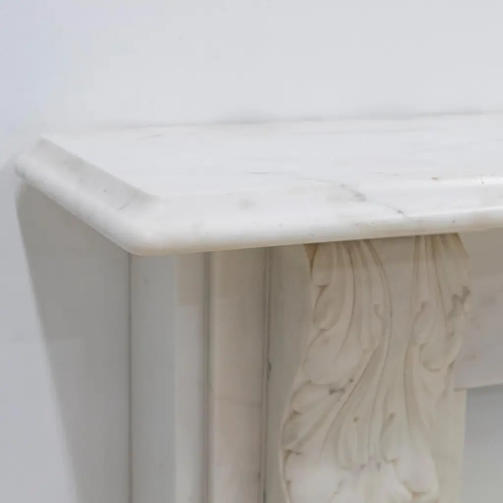 This refined early Victorian chimneypiece, crafted from fine Italian Carrara marble, showcases intricately carved corbels with foliage motifs, a large bevelled shelf rests atop.A magnificent fireplace surround, perfectly illustrating the superior design and craftsmanship celebrated during the Victorian era.DimensionsShelf: 178cm width x 31cm depthOverall height: 117cmOpening: 96cm width x 93cm heightWidth of Jambs: 29cm Dimensions are approximate.