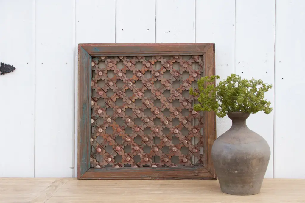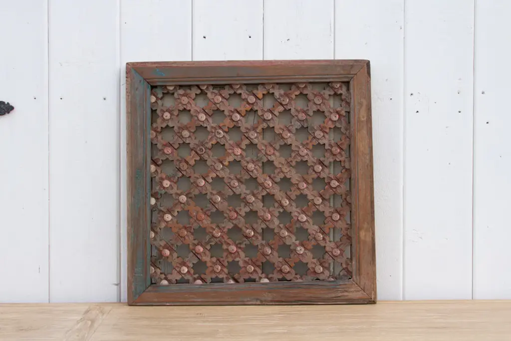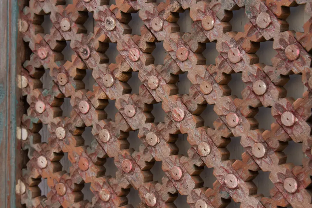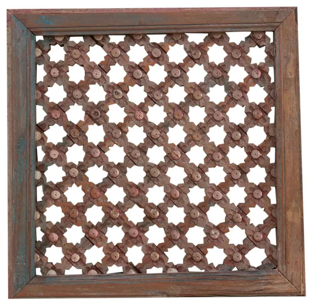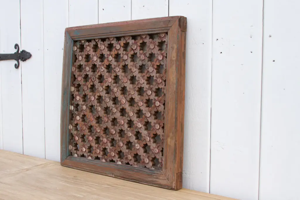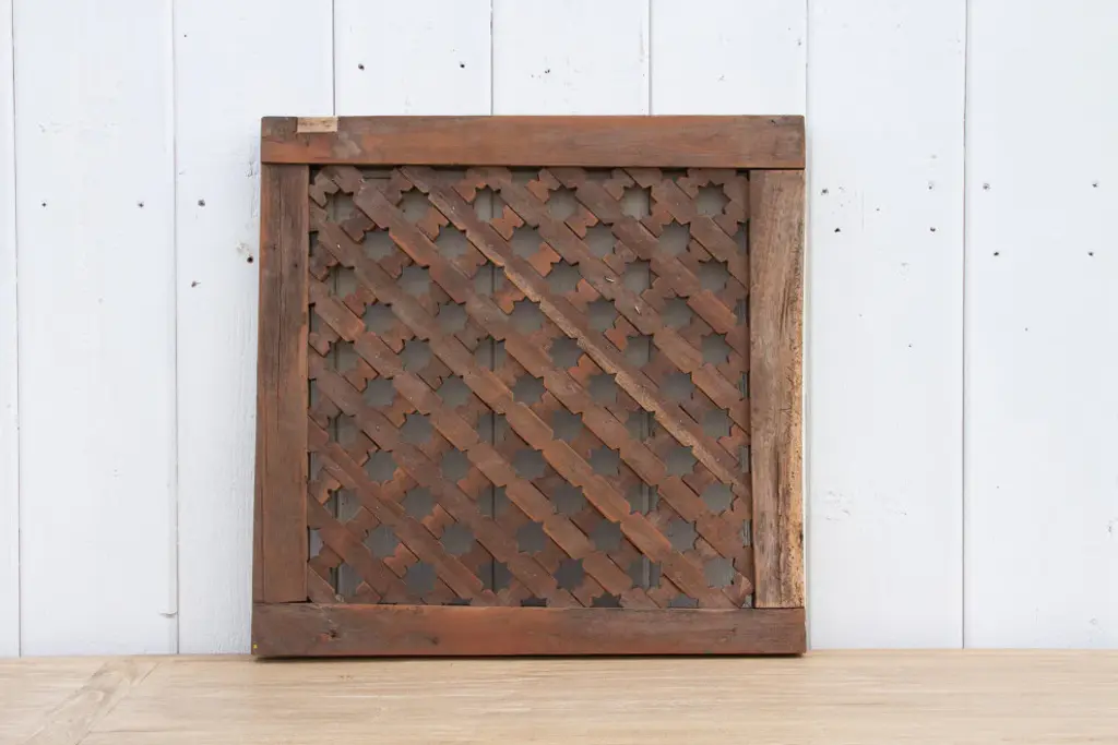 A charming painted window panel with carved details and a see-through cross weave design. Originally lattice window panels were used to let air ventilate while giving a sense of privacy.