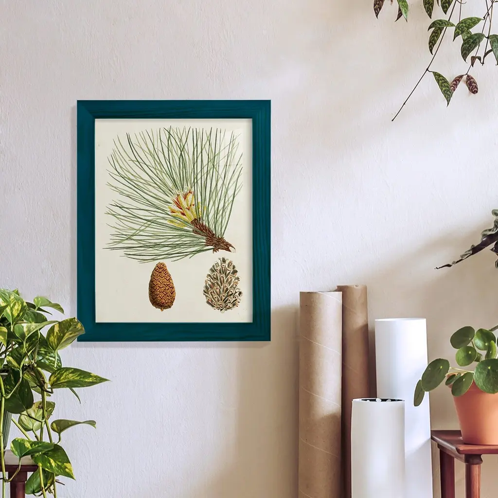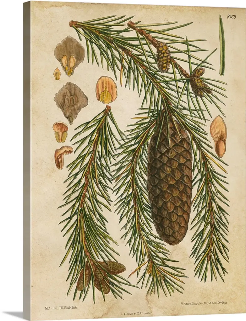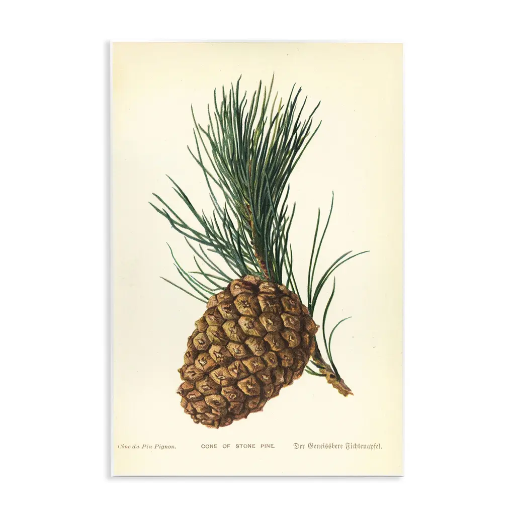 Vintage stylized illustration of a tree branch with pine cones hanging from it.