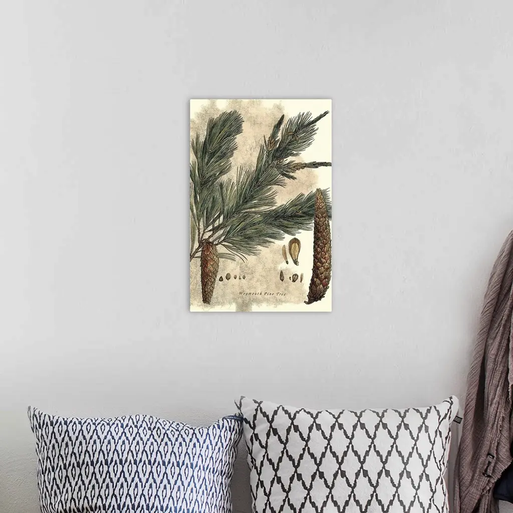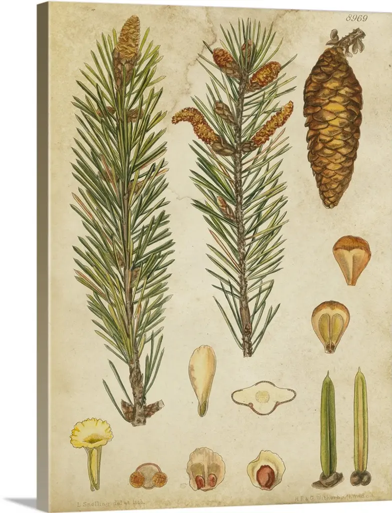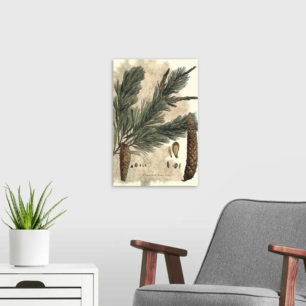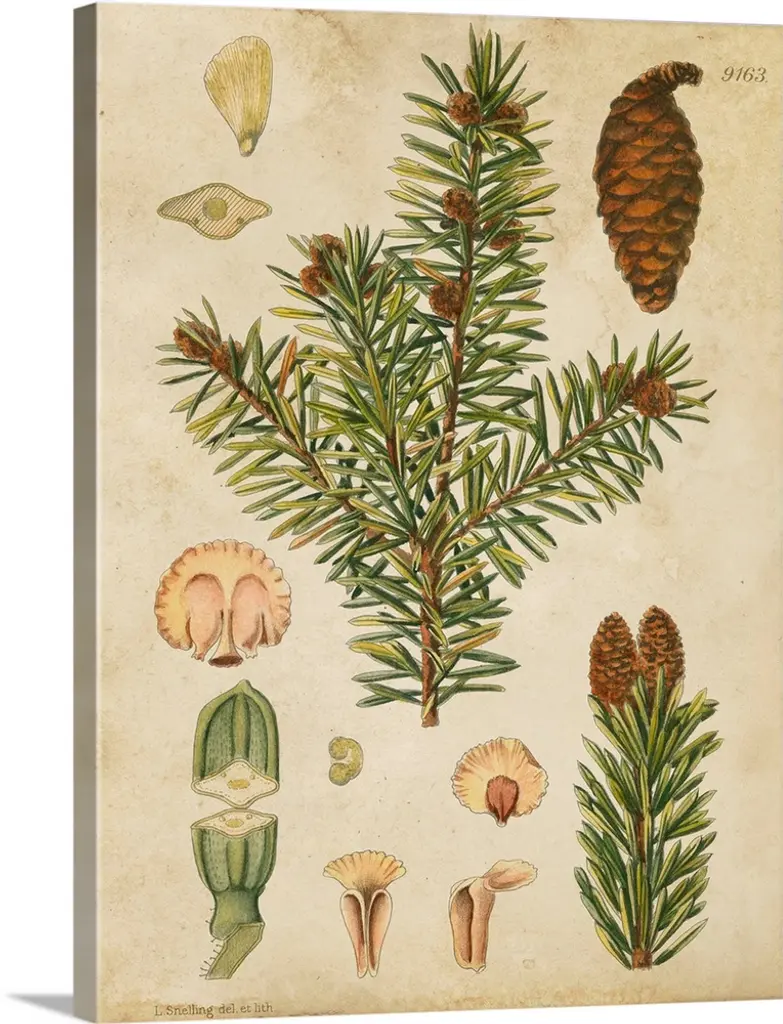 Vintage stylized illustration of a tree branch with pine cones hanging from it.