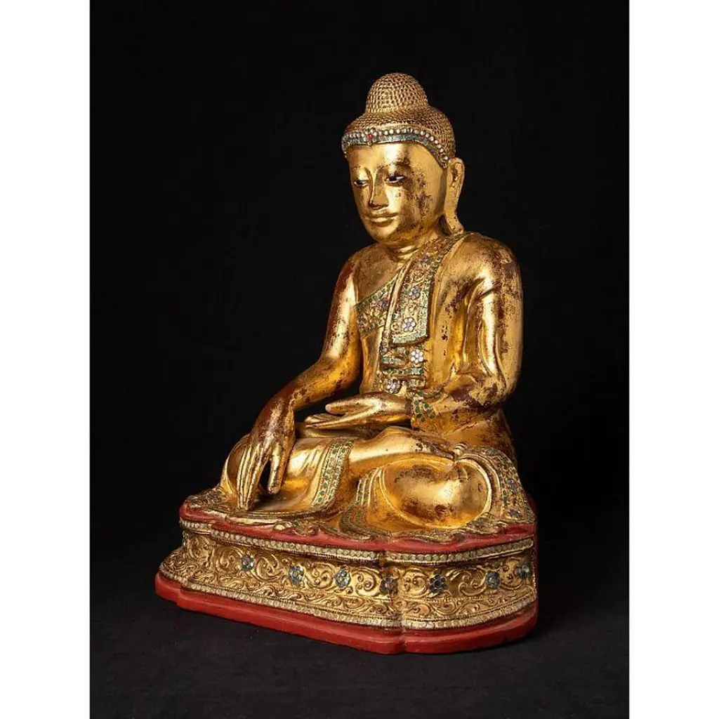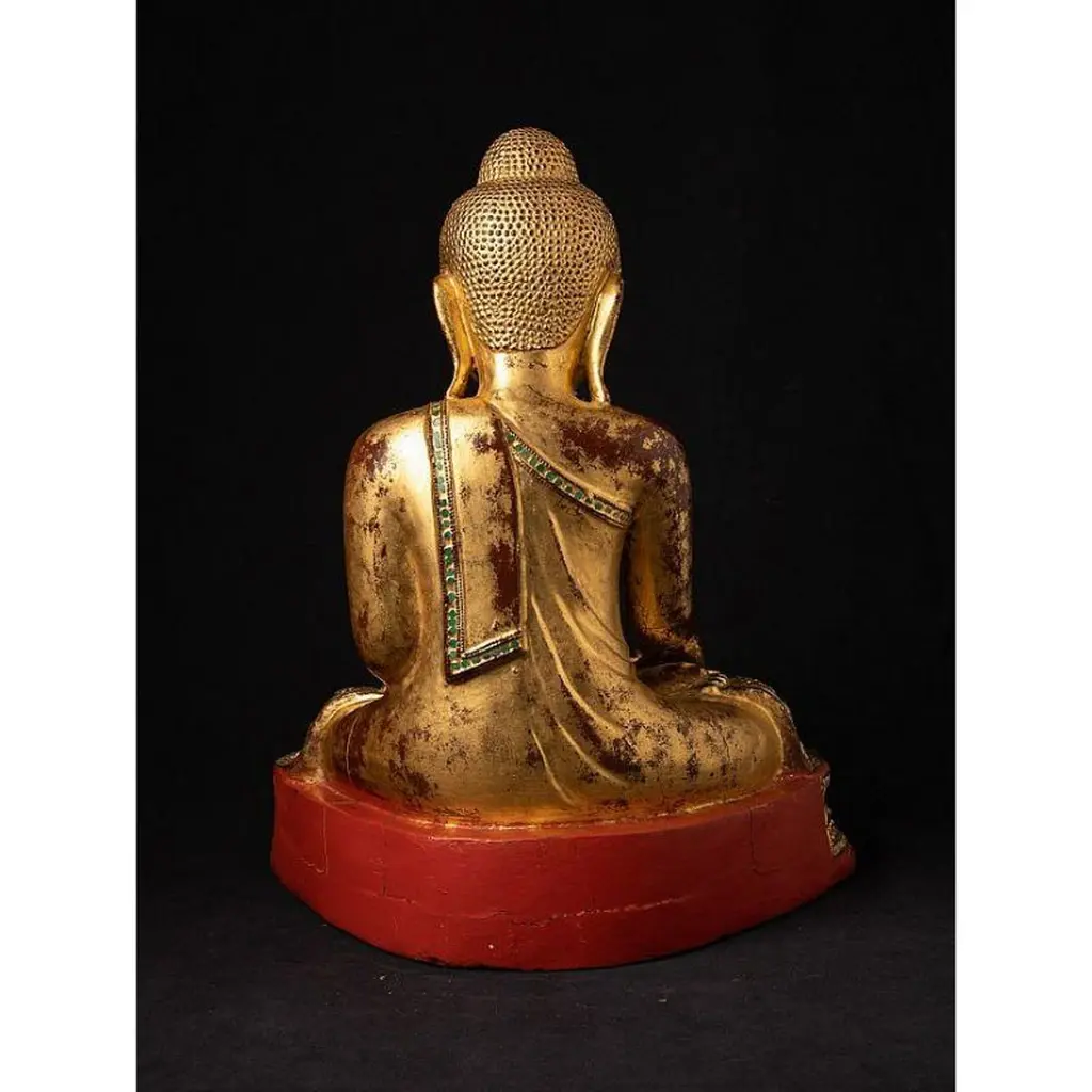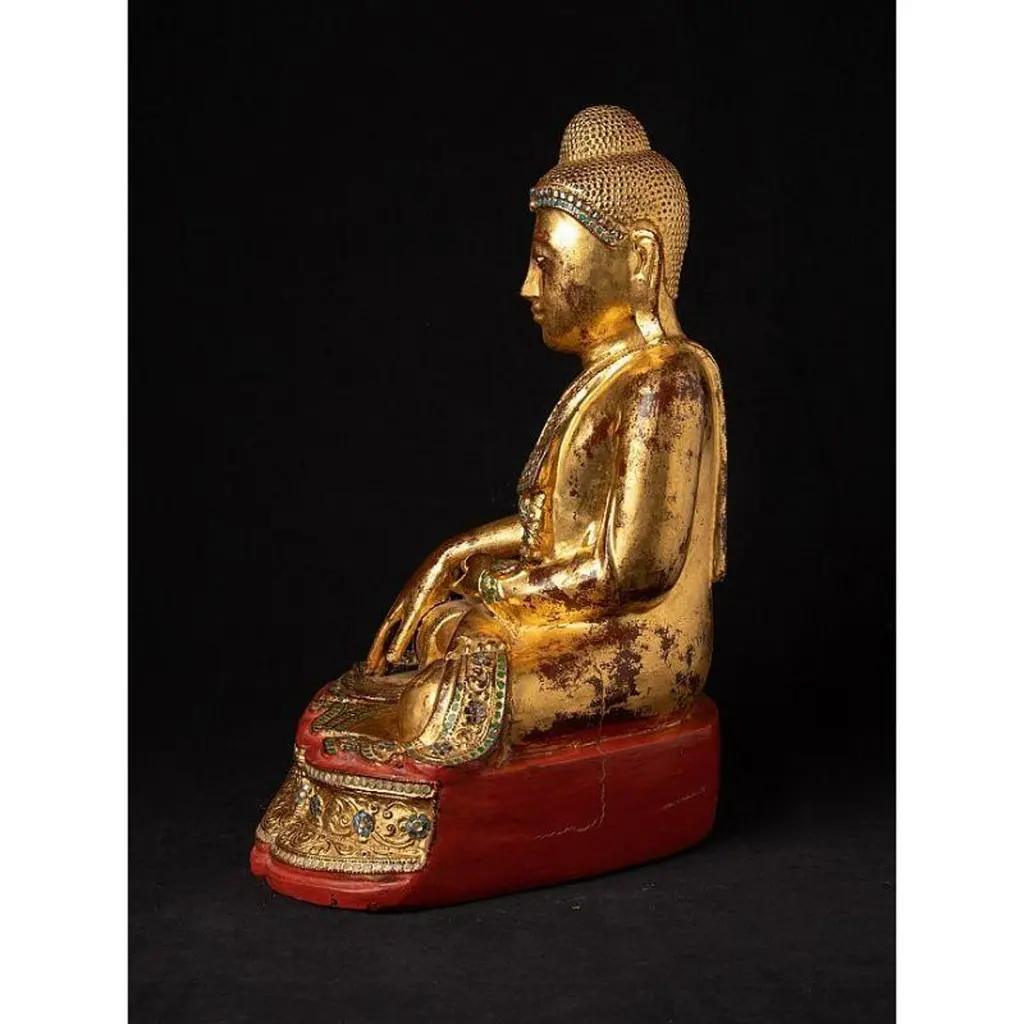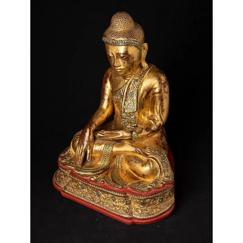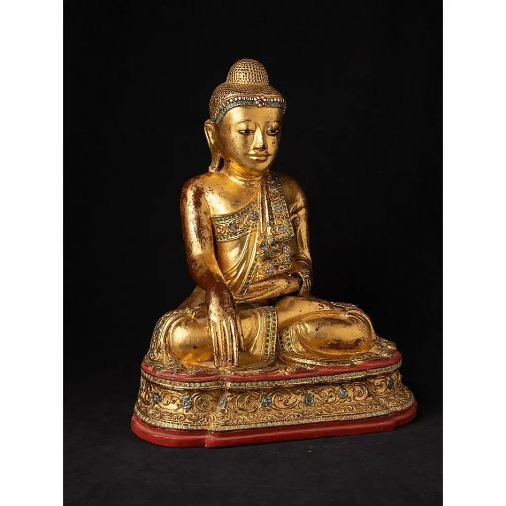 Material: woodMeasures: 44,4 cm high 36,2 cm wide and 27,3 cm deepWeight: 5.6 kgsGilded with 24 krt. goldMandalay styleBhumisparsha mudraOriginating from Burma19th CenturyWith inlayed eyes.