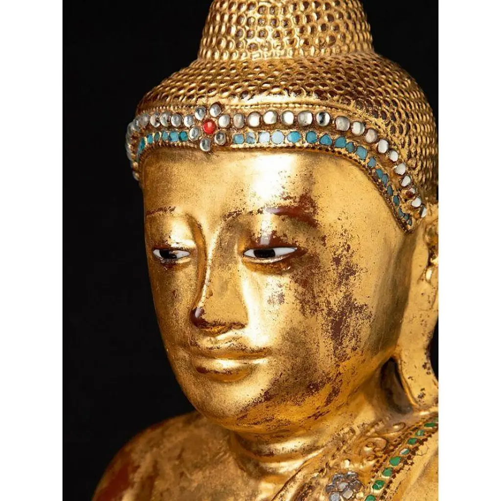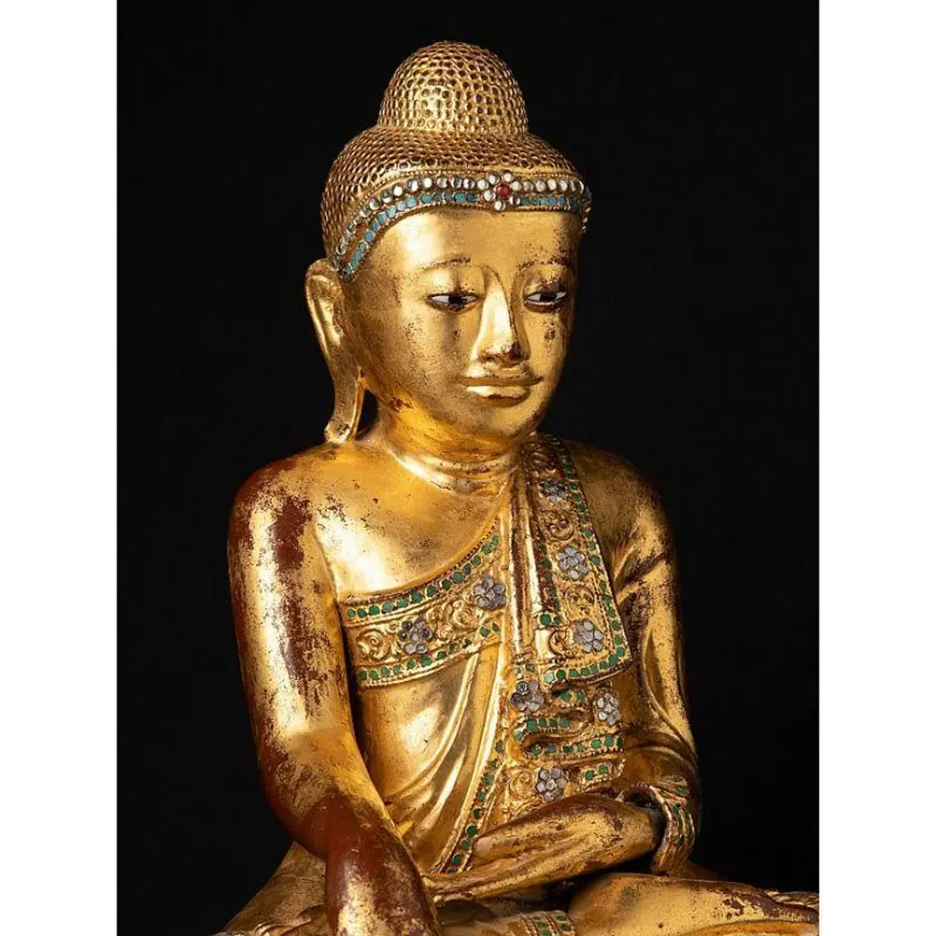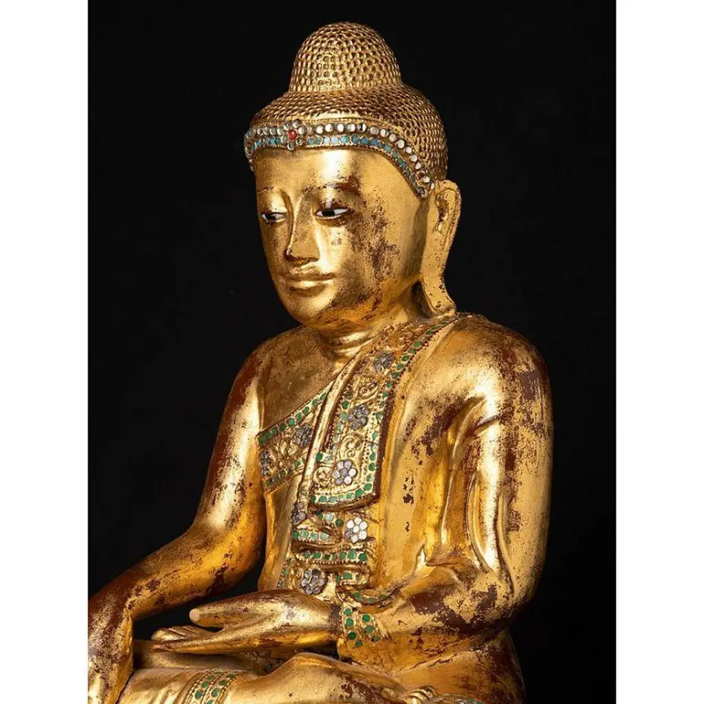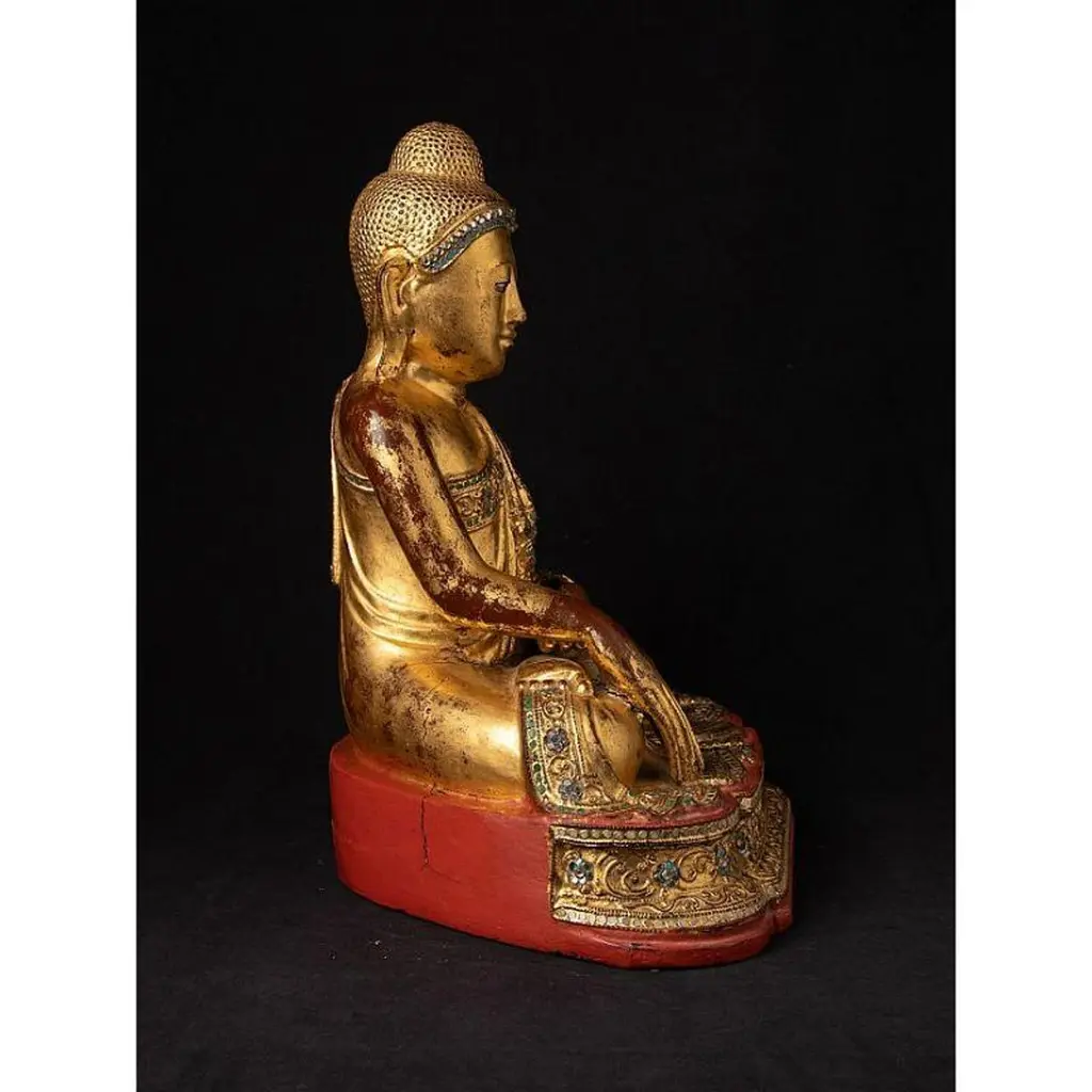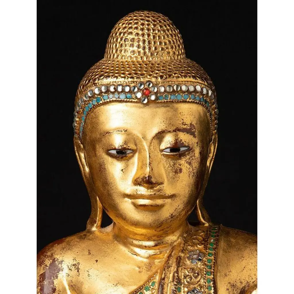 Material: woodMeasures: 44,4 cm high 36,2 cm wide and 27,3 cm deepWeight: 5.6 kgsGilded with 24 krt. goldMandalay styleBhumisparsha mudraOriginating from Burma19th CenturyWith inlayed eyes.