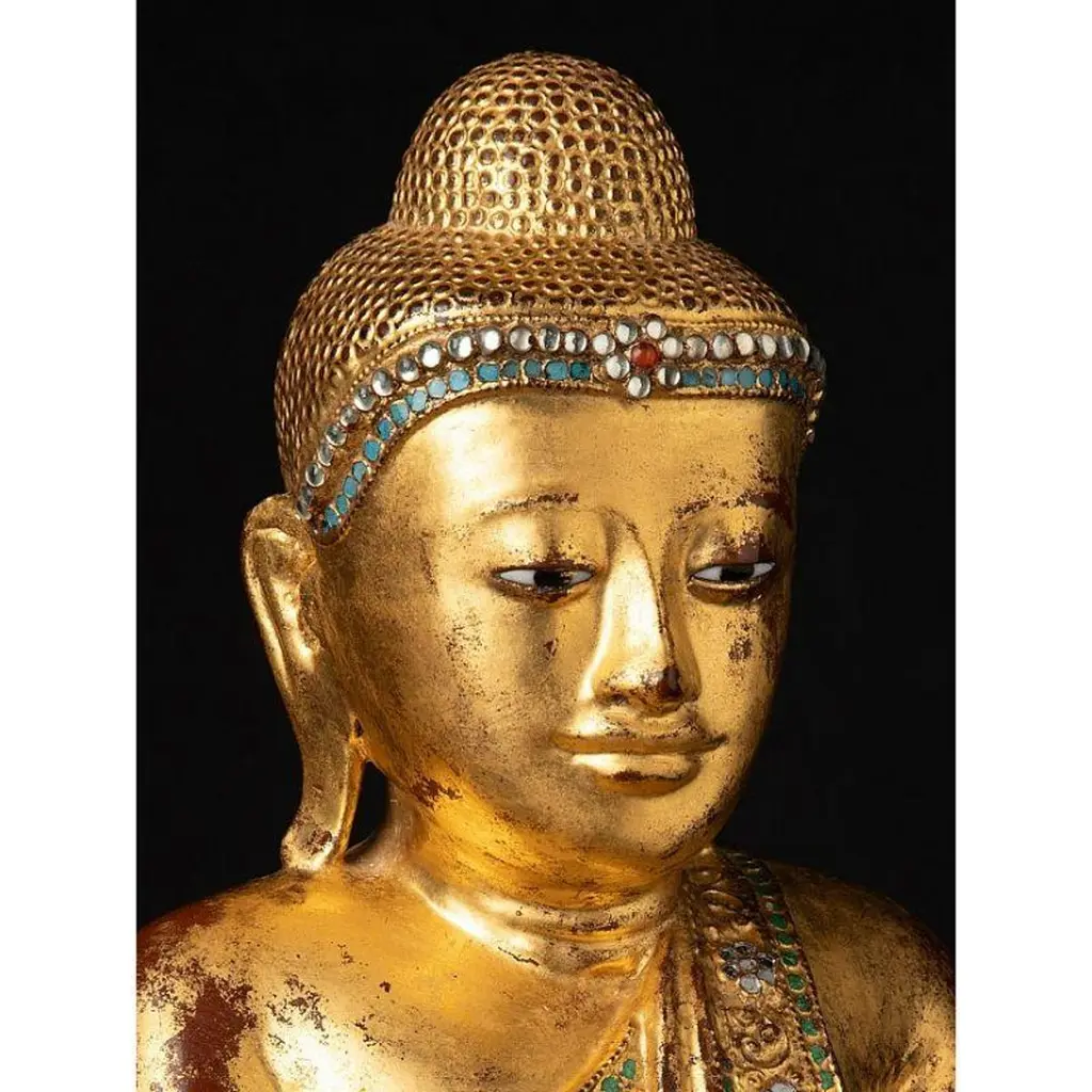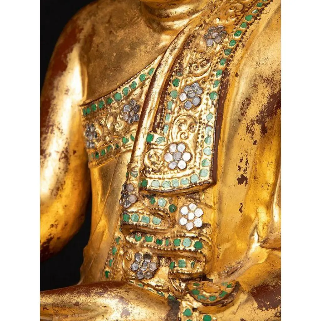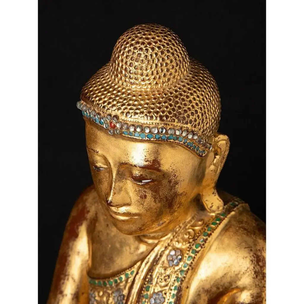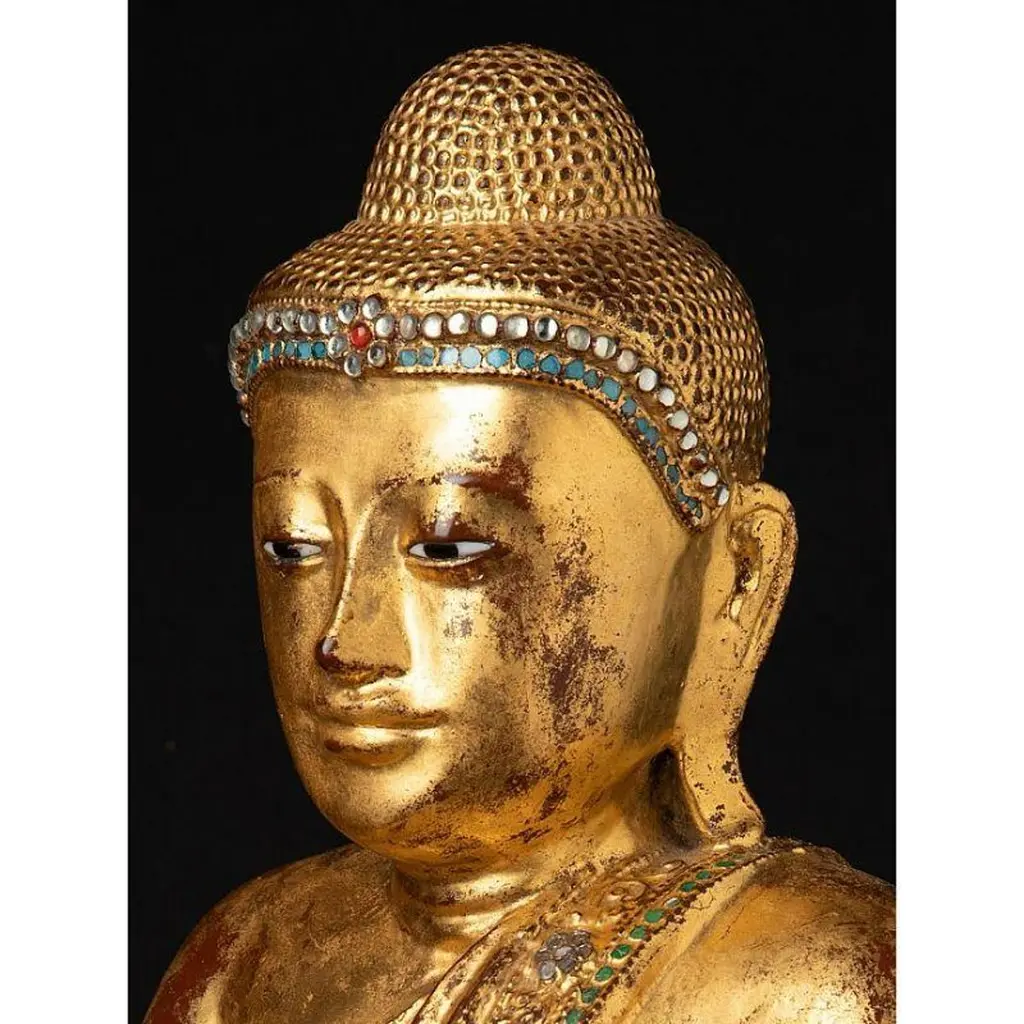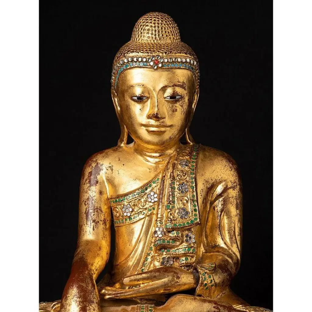 Material: woodMeasures: 44,4 cm high 36,2 cm wide and 27,3 cm deepWeight: 5.6 kgsGilded with 24 krt. goldMandalay styleBhumisparsha mudraOriginating from Burma19th CenturyWith inlayed eyes.