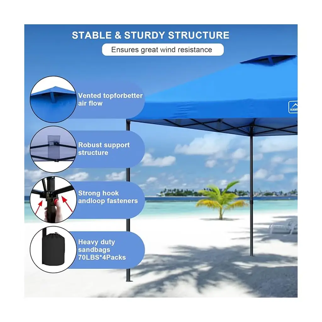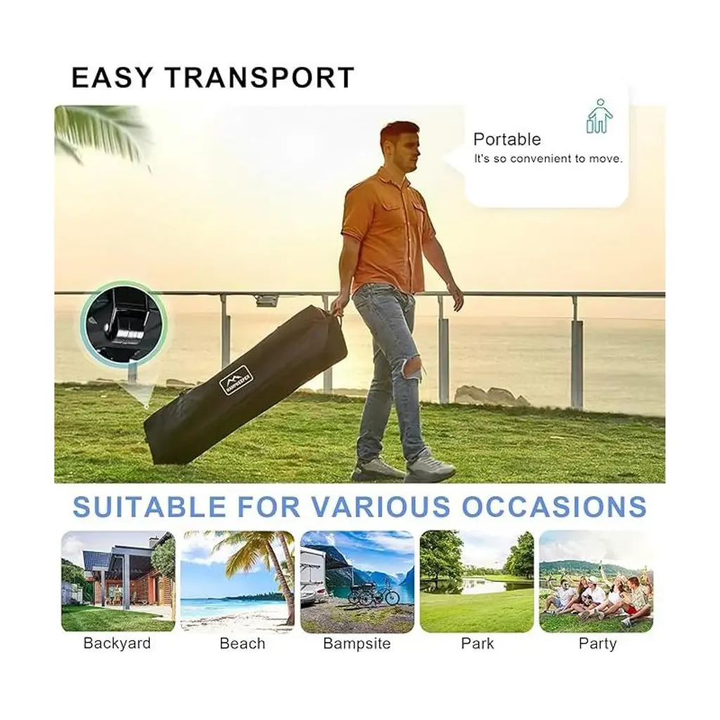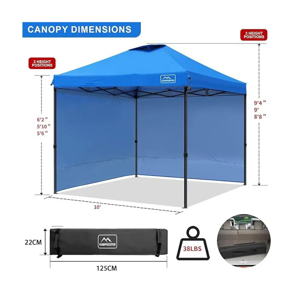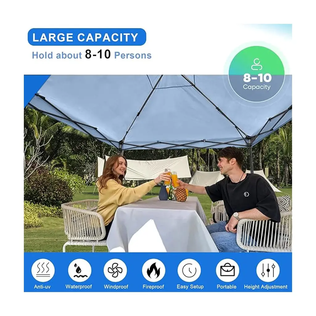 10x10 FT LARGE CAPACITY - Our outdoor 10ft pop up canopy provides 100 square feet of shade for about 10-14 people. 3 adjustable heights up to 9ft from floor to roof.