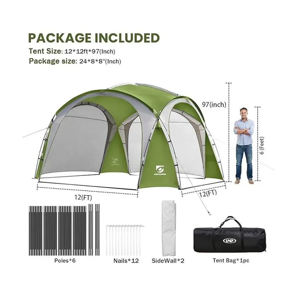 The 12-ft canopy provides 144 square feet of activity space. With a height of 90 inches, it comfortably accommodates 7-10 people