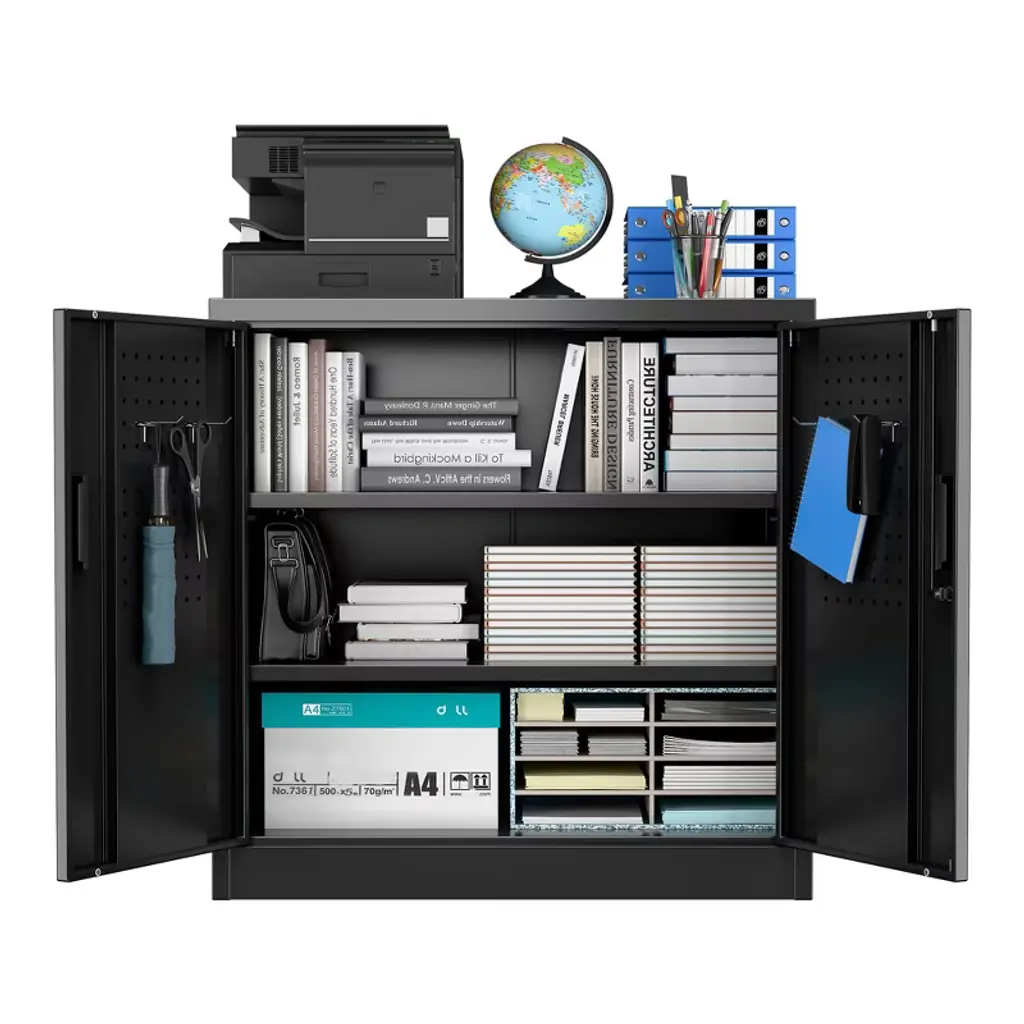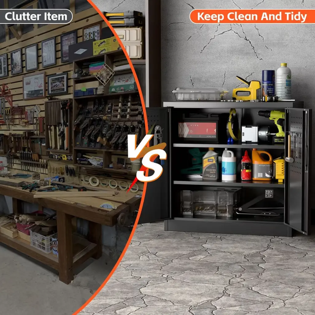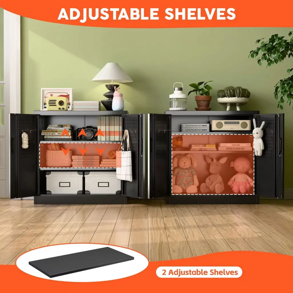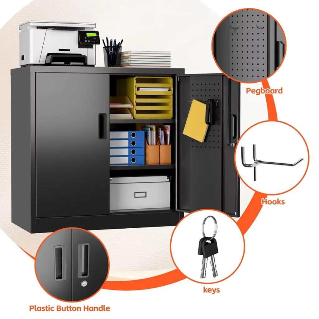 Tame your space with versatile storage! This 31.5"H metal cabinet features 2 adjustable shelves (120lb each!) and pegboard doors with 4 hooks for smart organization. Secure 3-point lock (2 keys) protects tools or supplies. Easy-clean steel wipes down quickly. Fits perfectly in garages, home offices, or mudrooms. Simple assembly with included hardware.