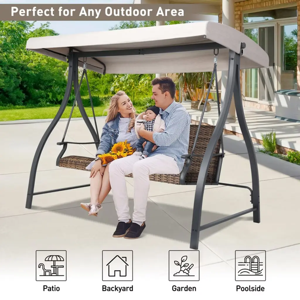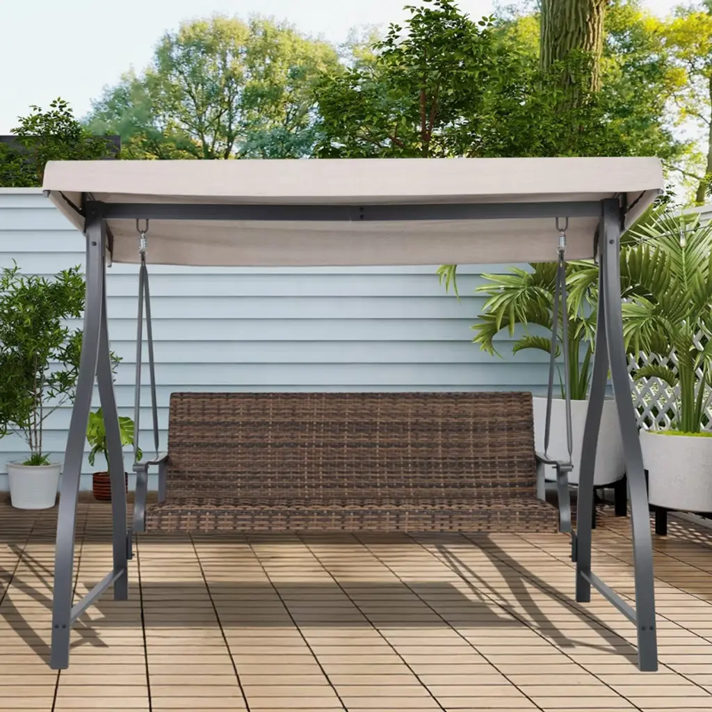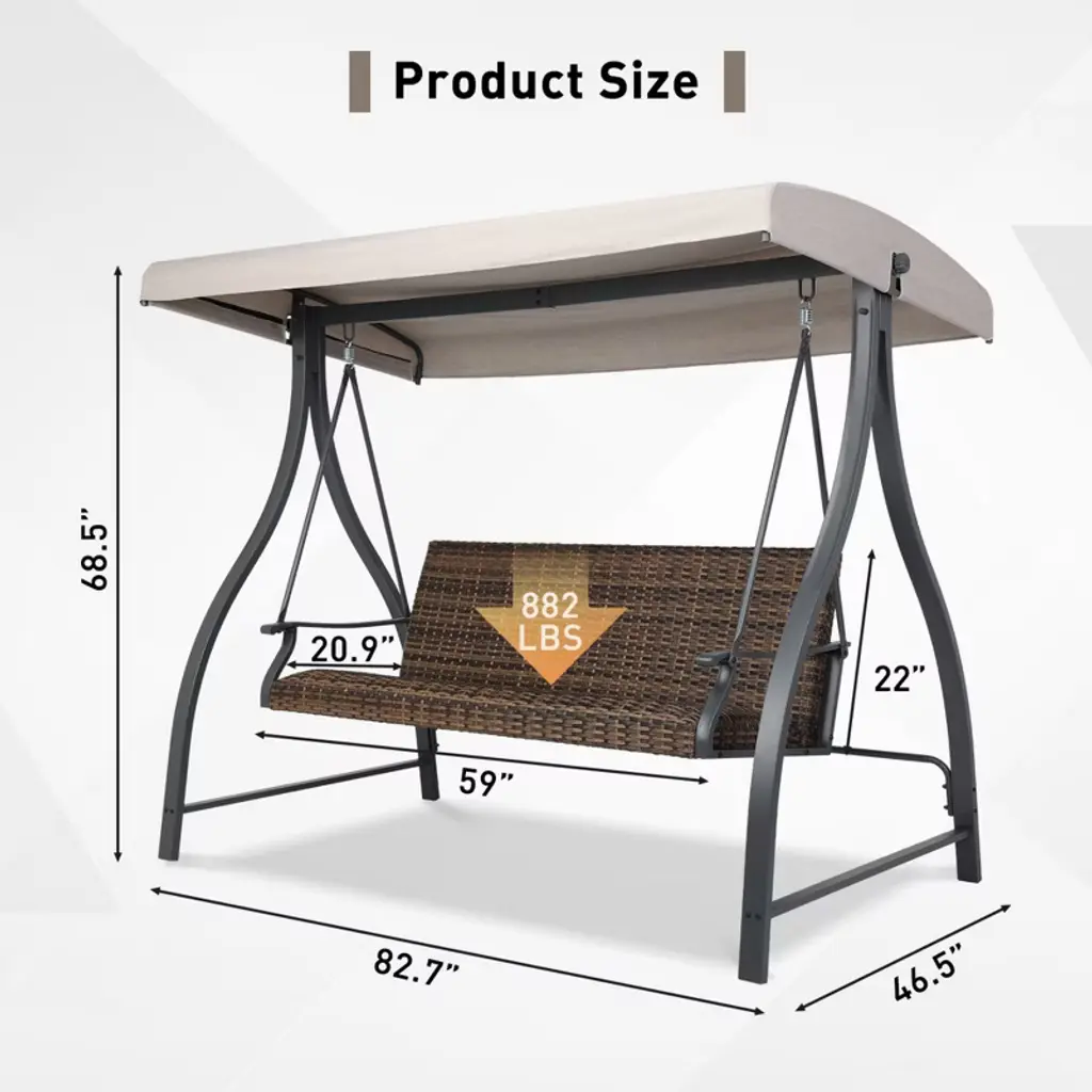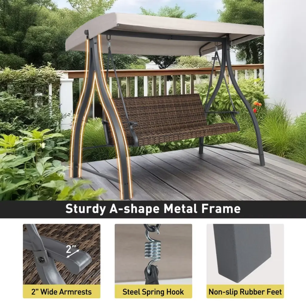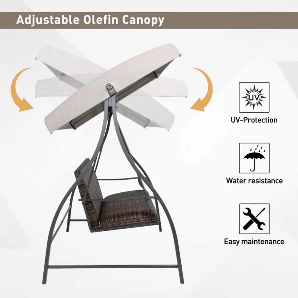 Aoodor 3-seat Outdoor Rattan Patio Swing With Adjustable Dark Blue Canopy, Built-in Quick-drying Foam Seat, Rattan Wicker, Rust-resistant Iron Frame