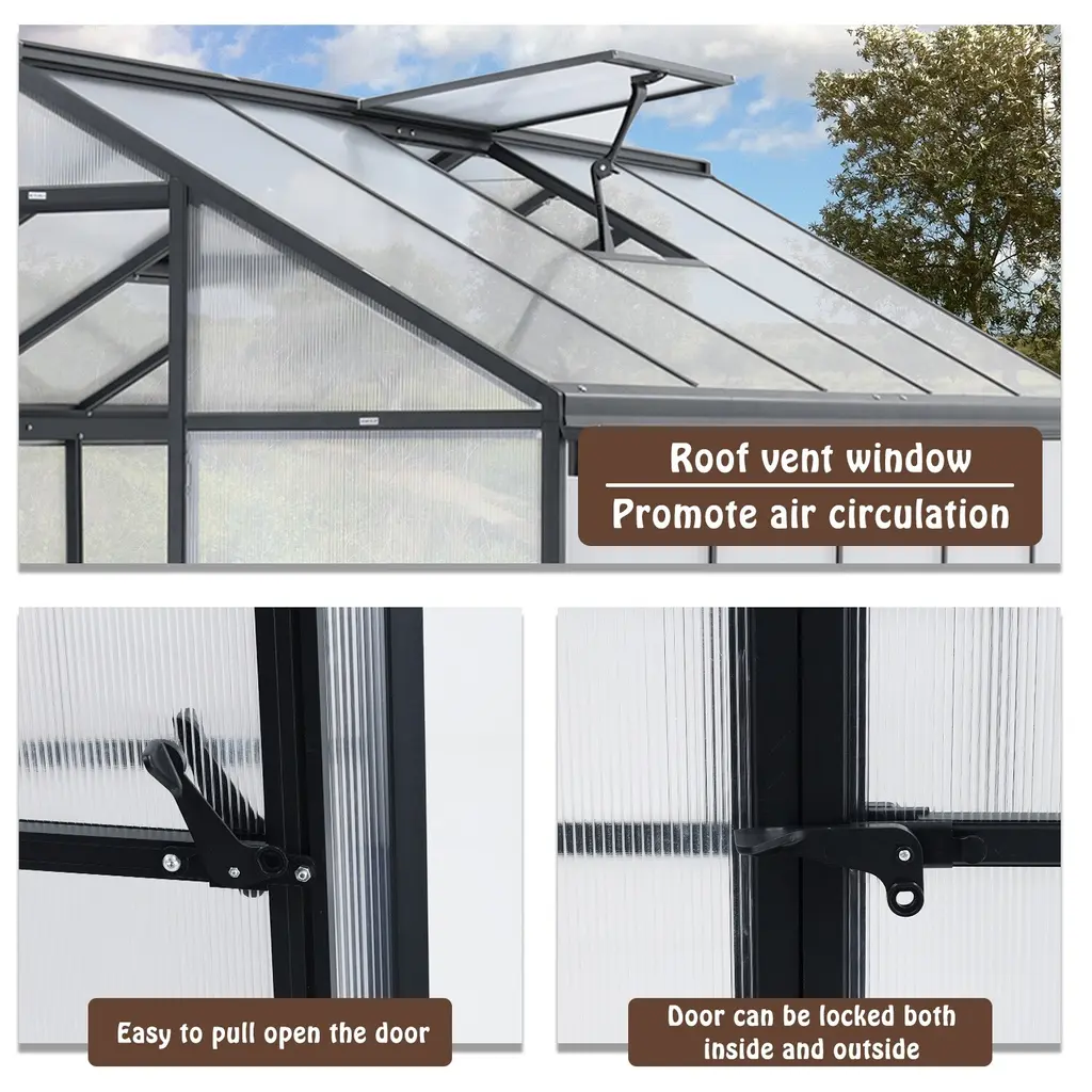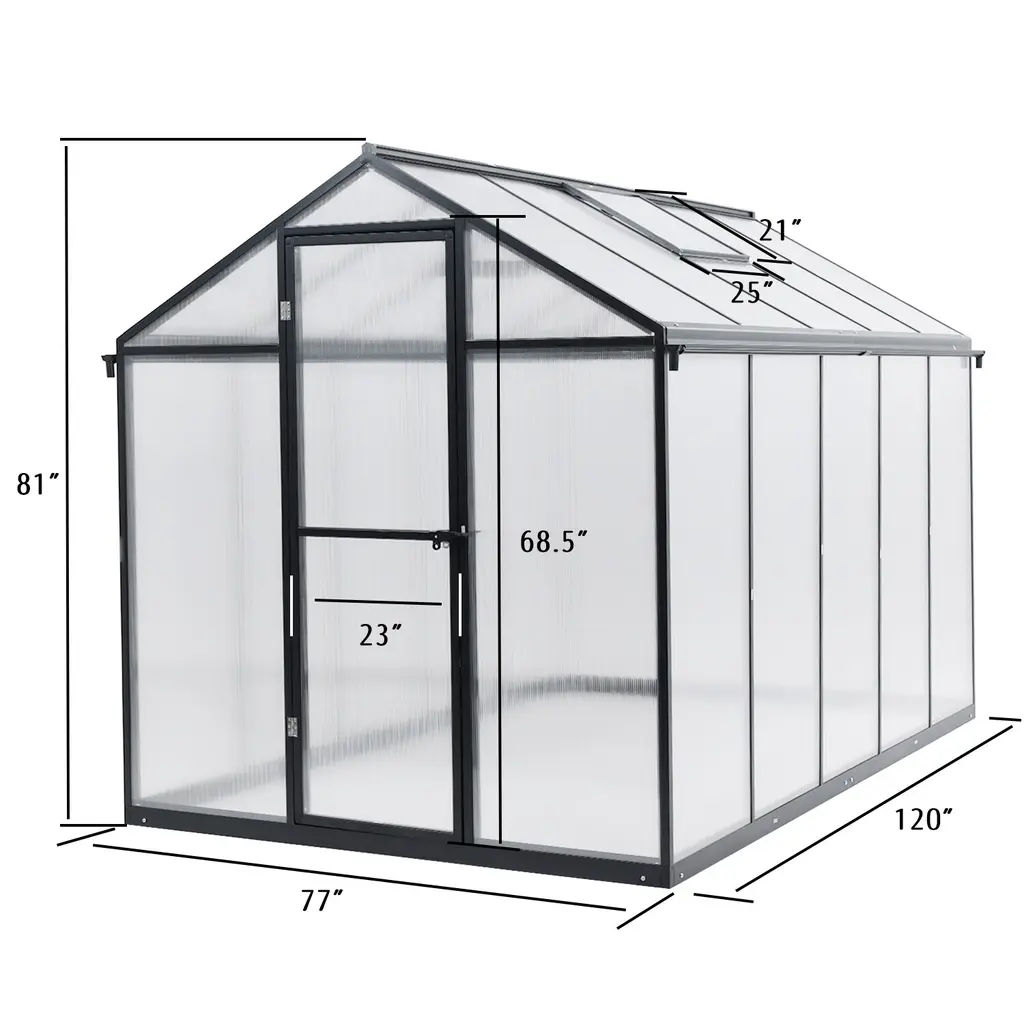 Spacious & Versatile: Aoodor's greenhouse, 77"x 120" x 81", suits backyards, decks, and gardens, ideal for growing various plants with ample space. Rust-Proof Aluminum: Heavy-duty aluminum frame ensures solidity and a waterproof structure, equipped with drainage pipes for efficient water management. Vent & Lockable Door: Adjustable top vents and lockable doors provide ventilation and security, maintaining a cool working environment for you and optimal air circulation for plants. Premium Panels - 4mm Premium Panels ensure superior water resistance, shading, and stability. Leaking pipes prevent water buildup, making cleanup a breeze. Easy Assembly: The galvanized steel base enhances stability for effortless installation, ensuring a sturdy greenhouse setup with clear instructions.