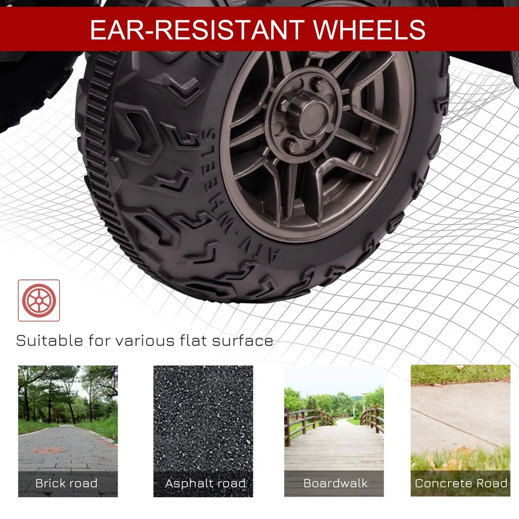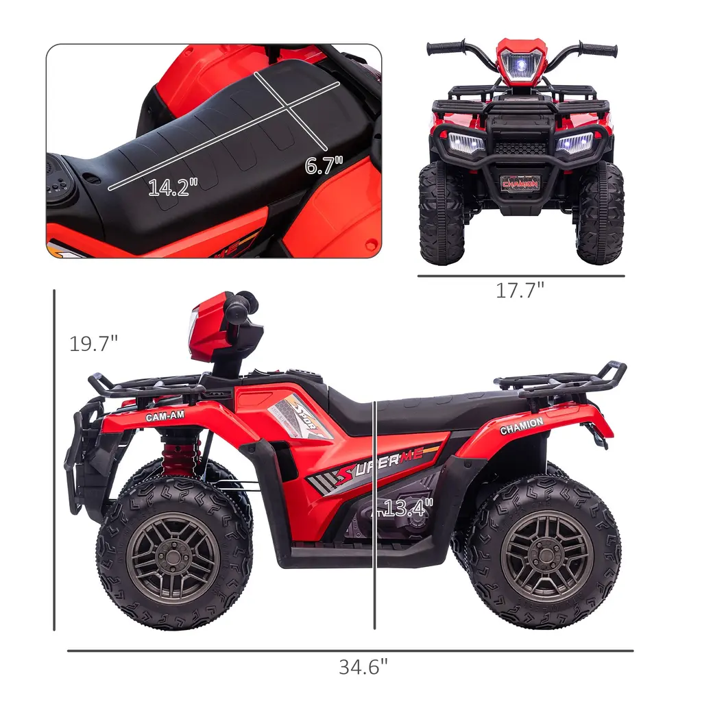 Descriptions: This electric quad is an ultra-fun electric powerhouse for your child. The cool tunes and realistic design will keep them rocking out and roll playing as they drive independently. Our four wheeler for kids is extra safe with a slow speed and big, wide wheels that let little ones cover a wide variety of terrain, using tough, wear-resistant tread for better movement. Aosom offers you a way to upgrade playing outside.● Strong traction and tough, wear-resistant tread;● AUX port and USB port add music to the fun while letting devices charge;● Ultra-safe two-speed setting at 1.2 or 2.5 mph and bright triple LED headlights;● Comfortable seat for a better feel;● Dashboard for the full experience;● Easy grip with comfortable handles to hold on to;● Assembly required;● Color: Red, Black;● Materials: Polypropylene, Steel;● Overall Dimensions: 34.6" L x 17.7" W x 19.7" H;● Seat Dimensions: 14.2" W x 6.7" D x 13.4" H (Off the Ground);● Wheel Dimensions: Dia. 9.4" x 4.3" W;● First Charging Time: 8 Hours;● Regular Charge Time: 8-12 Hours;● Use Time: 50 mins (Depending on the intensity of use);● Battery: 12V, 4.5AH. ● Motor: 12V x 2;● Speed: 1.2-2.5 mph;● Recommended/Standard Ages: 37-72 months;● Weight Capacity: 55 lbs.;● Item Label: 370-260V80RD;
