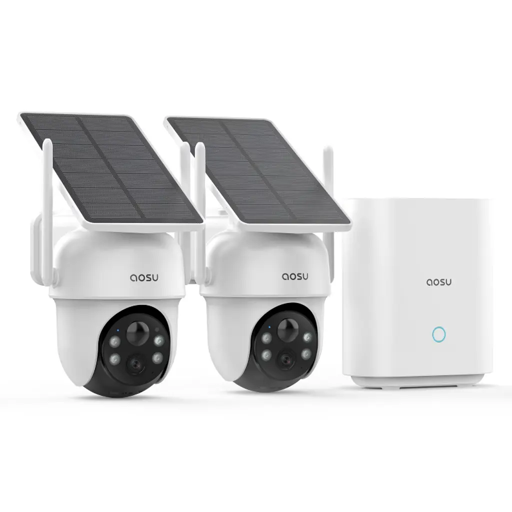 Family safety is aosu’s top priority. We’re devoted to protecting what matters most to you by offering smart security solutions that blend simplicity with cutting-edge technology. Protect your home with the aosu 2K/3.0 MP solar security camera kit with HomeBase. Capture every event in clear 2K QHD high-definition and use the panoramic PTZ feature to rotate each camera across a 360° view, eliminating blind spots. Each camera is equipped with 4 LED spotlights to deliver excellent color night vision, doubling the light source compared to standard models. Advanced AI tracking automatically focuses on and tracks movements when a person is detected. Powered by sunlight, the solar cameras operate continuously without need to be charged. Just 3 hours of daily sunlight keeps them running even on cloudy days. Mount them anywhere for 365 days of uninterrupted surveillance. The included HomeBase provides instant notifications and stable live streaming over both 2.4-GHz and 5-GHz Wi-Fi®. Cross-camera tracking lets you view live streams from up to 4 areas simultaneously on 1 screen. And all recordings are encrypted and stored locally in the HomeBase with its 32 GB of storage - no subscriptions or hidden costs - providing up to 2 months of video loop recording.