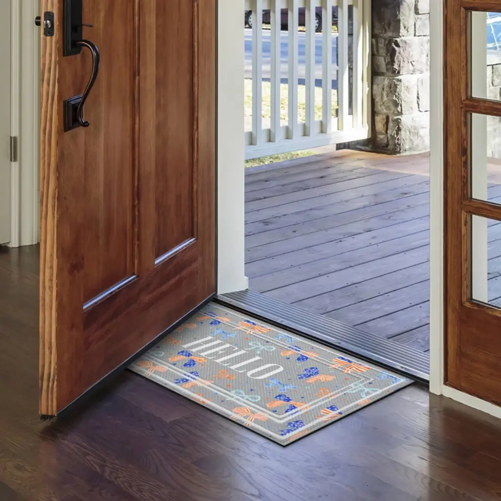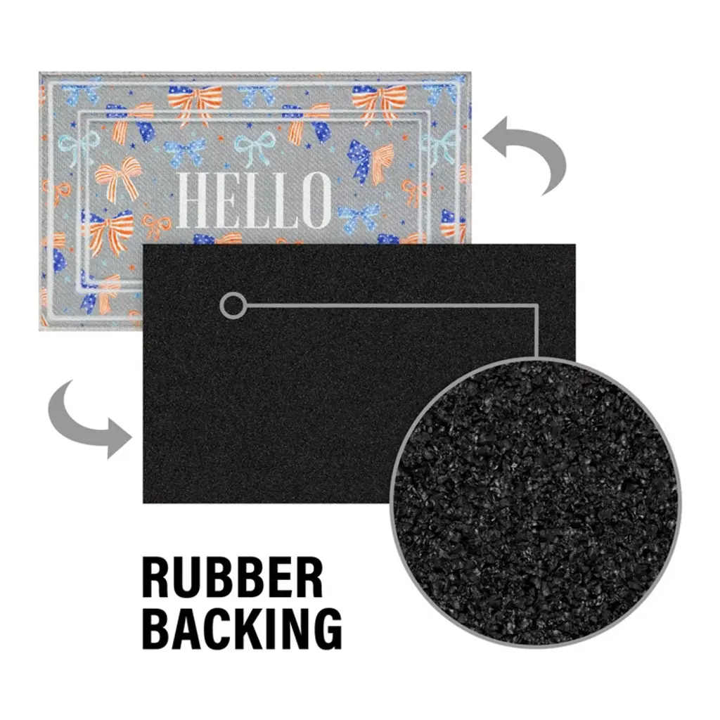 Add sophistication and luxury to your entryway with the Hello Americana Stars and Bows Sparkle Door Mat. Featuring a specialty polyester fabric made with metallic yarns, this door mat produces an eye-catching glitter effect which enhances the printed design. The flat woven surface helps to remove dirt from shoes, will not mat down, and is extremely easy to clean – making it ideal for high-traffic areas or homes with pets. A low-profile construction allows the mat to fit under doors, while a skid-resistant recycled rubber backing keeps the mat in place.