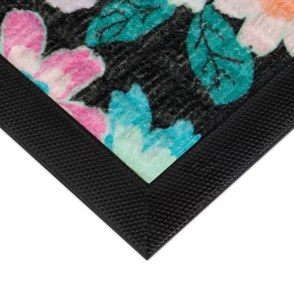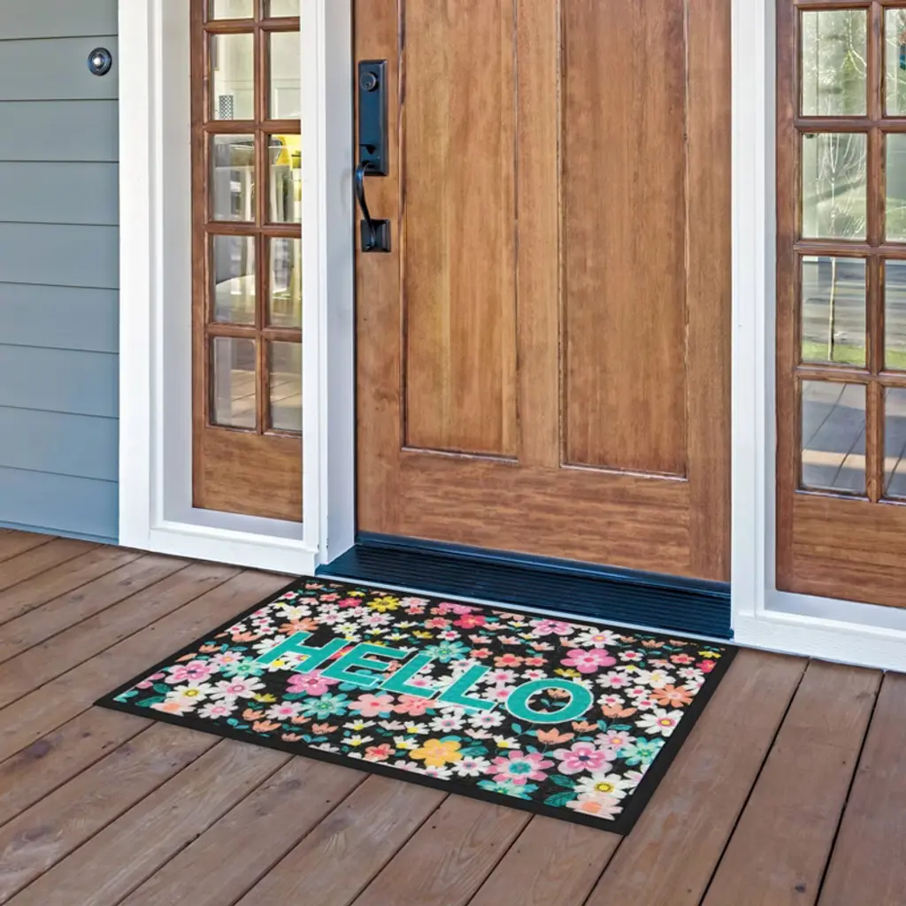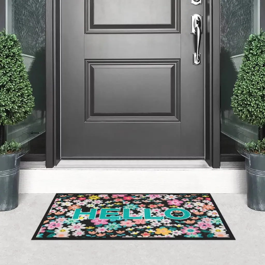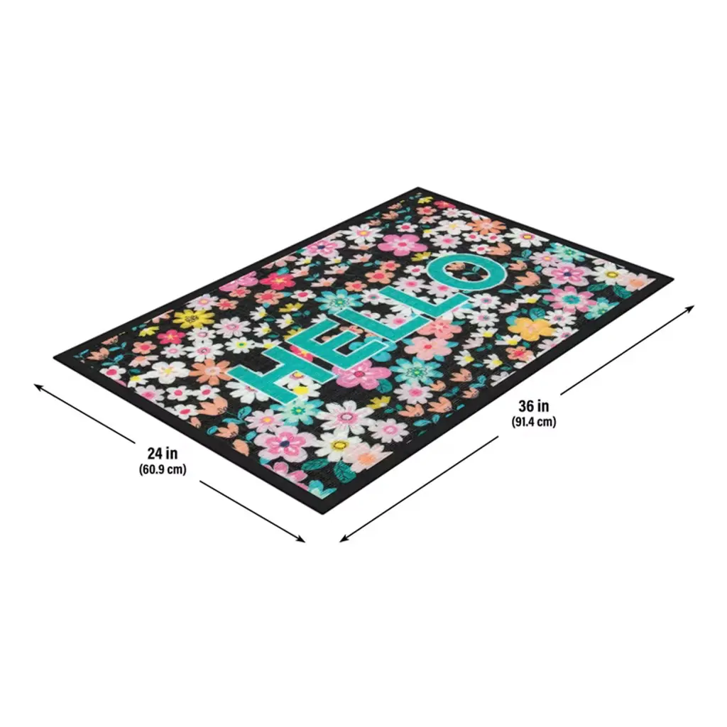 Fashion meets function with the Hello Festive Spring Door Mat. Featuring a colorful print on a durable, commercial-grade polyester carpet and molded rubber base, these mats are the perfect way to bring style to high-traffic areas. The needle punch carpet surface offers excellent absorption and dries quickly, while the phthalate-free natural rubber backing offers skid resistance. The rubber-reinforced squares and raised rubber border remove and trap dirt and moisture, and increase the mat’s lifespan for long-lasting performance.