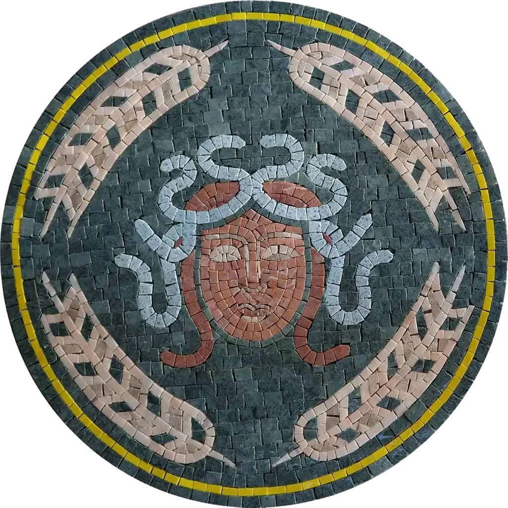 Aphrodite is a fully handmade mosaic medallion. This Roman Greek Goddess is entirely composed of natural stones and hand cut tiles that create a long lasting artwork.