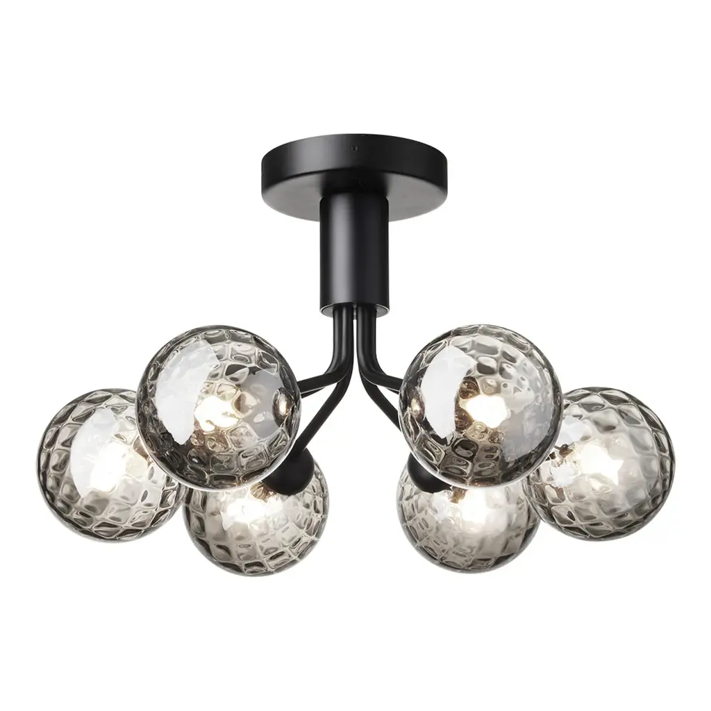 Apiales 6 Ceiling Fixture is an addition to the chandeliers and single pendants from the Apiales collection. The mouth-blown glass globes are attached to the 6 metal arms of this ceiling mounted mini-chandelier, and a soft and comfortable light is spread to the room.