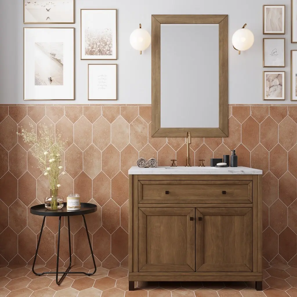 This terracotta-inspired bullnose trim is the epitome of rustic charm with a modern twist. Its warm, earthy tone—think classic burnt sienna—pairs perfectly with its matte finish, creating a natural, understated look that feels cozy yet refined. The 0.6x11.8" shape adds a sleek edge to any installation, whether you're capping off an outdoor wall, framing a backsplash, or finishing a fireplace surround. The slight variation (V2) in its tone gives it a subtle depth, making each piece unique without overwhelming the design. This trim works beautifully with neutral or white tiles for a classic farmhouse aesthetic or can be paired with bold blues or greens for a Mediterranean-inspired vibe. It's also a perfect match for wood-look tiles, creating a seamless connection between organic textures and rich, earthy colors. Durability is key here—this porcelain trim is designed to handle high-traffic floors, steam rooms, and even outdoor walls, all while maintaining its warm, inviting look. Whether you're sprucing up a backyard patio or putting the finishing touches on a cozy kitchen, this trim adds that perfect mix of strength and style, blending rustic charm with contemporary design.