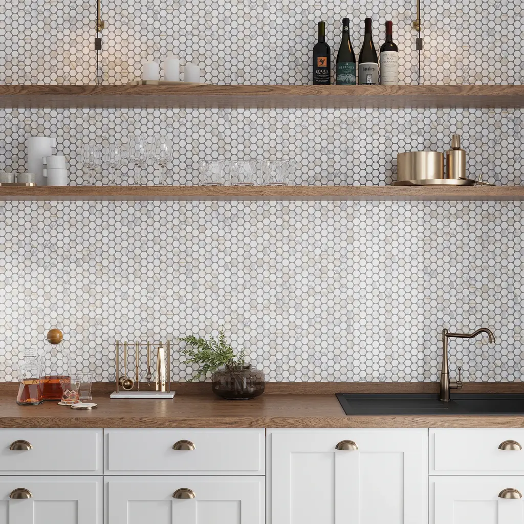 The Calacatta Gold Honed Penny Round Mosaic Tile is a blend of timeless marble elegance and playful modern design. Featuring bright white marble accented with soft gray veining and hints of warm gold undertones, this tile adds charm and sophistication to any surface. The 1.2x1.2-inch penny-shaped chips, mounted on an 11.2x11.5-inch mesh sheet, create a smooth, seamless look that's easy to install. Perfect for chic bathroom floors, stylish shower walls, or trendy kitchen backsplashes, this honed tile's matte finish brings a soft, velvety texture that balances luxury with a contemporary vibe. Durable enough for light and heavy foot traffic, it's equally at home in residential spaces or commercial settings, offering both style and practicality. Pair with brass or black accents for a bold statement or subtle tones for a classic look. Whether you're designing a spa-like retreat or a playful statement wall, the Calacatta Gold Honed Penny Round Mosaic Tile makes every space feel thoughtfully curated and effortlessly sophisticated.