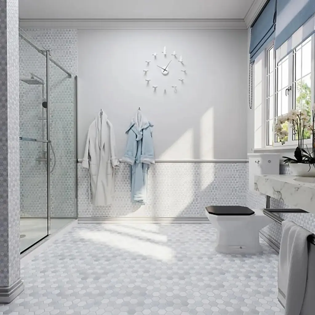 The tile pattern in the image presents a sleek and sophisticated hexagonal design with a clean, minimalist look, featuring a blend of pure white and soft blue Celeste hues. The subtle gradations in the blue shades give the appearance of a soft marble, while the polished finish adds an elegant shine. These tiles come in a 12x12" mesh-mounted sheet, making them ideal for easy installation on walls or floors. Crafted from high-quality materials like Thassos, Blue Celeste, and Paper White porcelain, the tiles are both durable and versatile. The rectified edges provide a seamless, precise fit for modern spaces, adding to the contemporary feel. Common applications for these tiles include indoor walls, light to moderate traffic floors, shower walls, and even shower floors. They thrive in high-traffic areas, commercial spaces, and can endure heat up to 150°F. This makes them a top choice for residential kitchens, bathrooms, and commercial offices or showrooms. For installation, use Laticrete 254 Platinum mortar and Laticrete Permacolor grout for the best finish. For added protection, STONETECH® BulletProof® Sealer is recommended to preserve their pristine look and durability over time. When pairing, consider complementing the clean, soft tones of these tiles with warmer wooden accents or bold, contrasting colors to add vibrancy to your space. These tiles will balance a minimalist, modern aesthetic while offering the functionality you need for various settings.