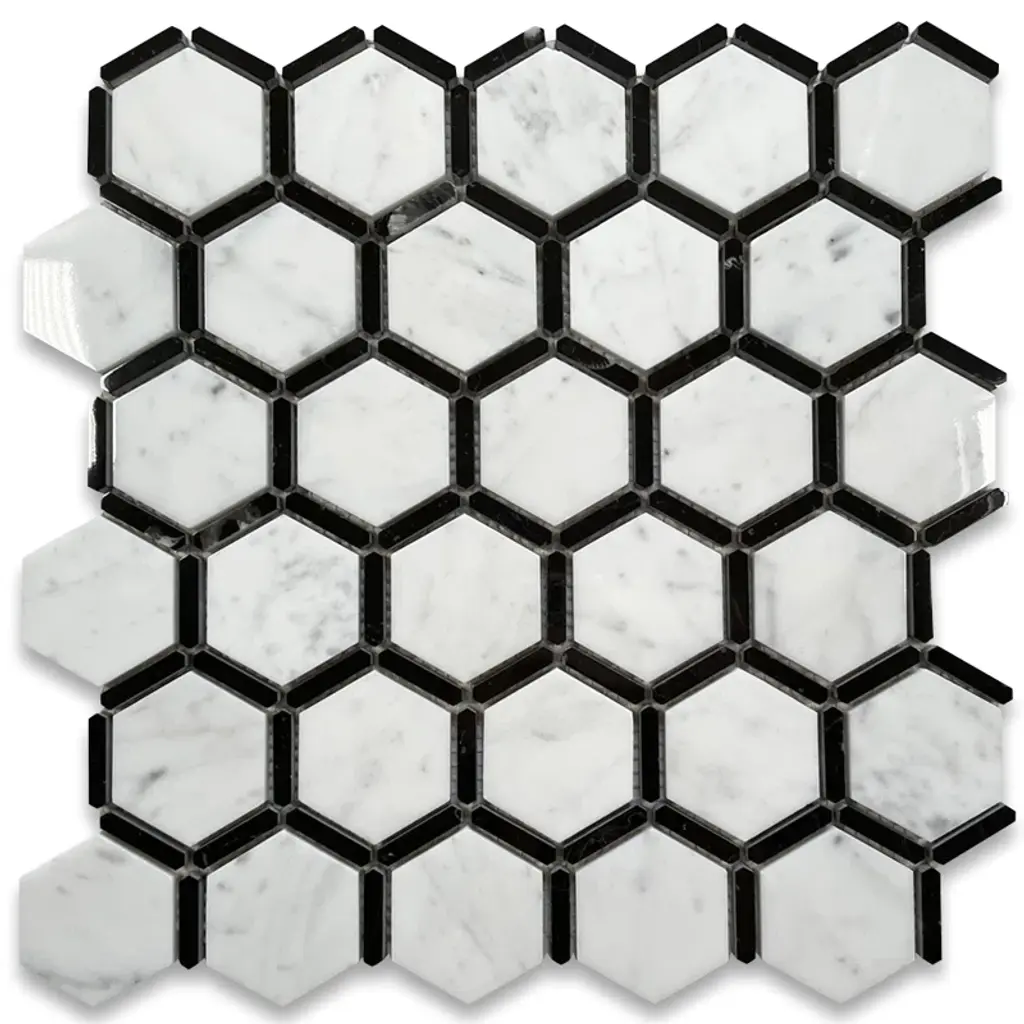 The Calacatta Gold Hexagon Mosaic Tile combines timeless sophistication with a modern geometric twist. Crafted from polished Calacatta Gold marble, this tile features a bright white base adorned with soft gray veining and warm golden accents, making it both versatile and luxurious. The 1.9x1.9-inch hexagonal chips, mounted on a 12x12-inch mesh sheet, create a seamless design perfect for a variety of applications. Ideal for stylish bathroom floors, trendy kitchen backsplashes, or stunning shower walls, this hexagon mosaic offers endless design possibilities. Its polished surface adds a subtle shine that reflects light beautifully, making spaces feel brighter and more open. With its V3 moderate variation, each tile has a unique character, ensuring a natural, non-repetitive look that elevates any space. Durable enough for both residential and commercial use, this tile works in high-traffic areas while maintaining its elegance. Pair it with gold or matte black fixtures for a modern, designer-approved finish. Whether you're updating your shower or adding flair to your entryway, the Calacatta Gold Hexagon Mosaic Tile is your go-to for effortless style.