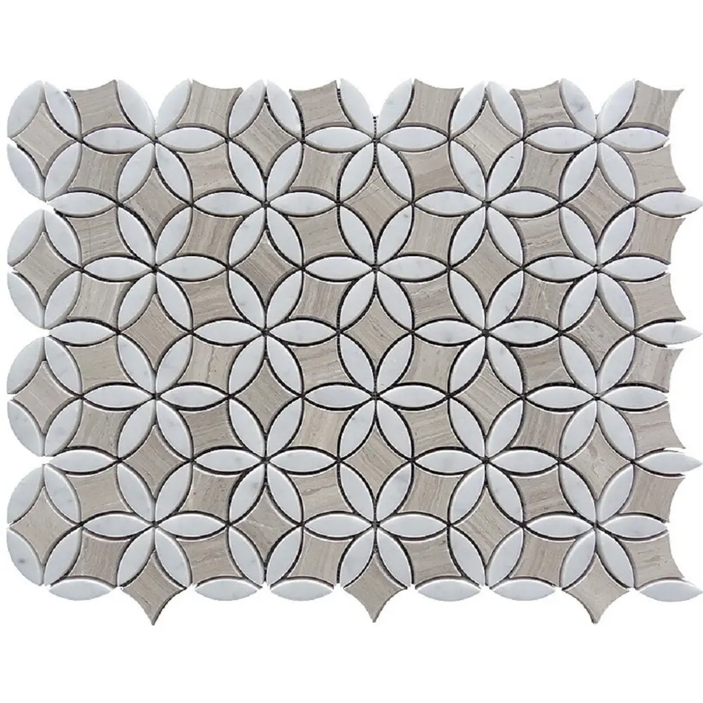 Transform your space with the captivating floral pattern of the 5 Pack Gray and Beige marble mosaic tiles. This wood-look marble tile features an elaborately detailed pattern of crisp white and wood-look greys, making it the perfect choice to integrate into various design styles. Whether for traditional kitchens, modern bathrooms, or Scandi living rooms, this neutral backdrop adds interest to any space. With a naturally slip-resistant surface, this mosaic tile is perfect for creating floors that dazzle with intricate beauty. Elevate your decor with statement walls that are more chic than a few coats of paint with the Apollo Tile.Features: