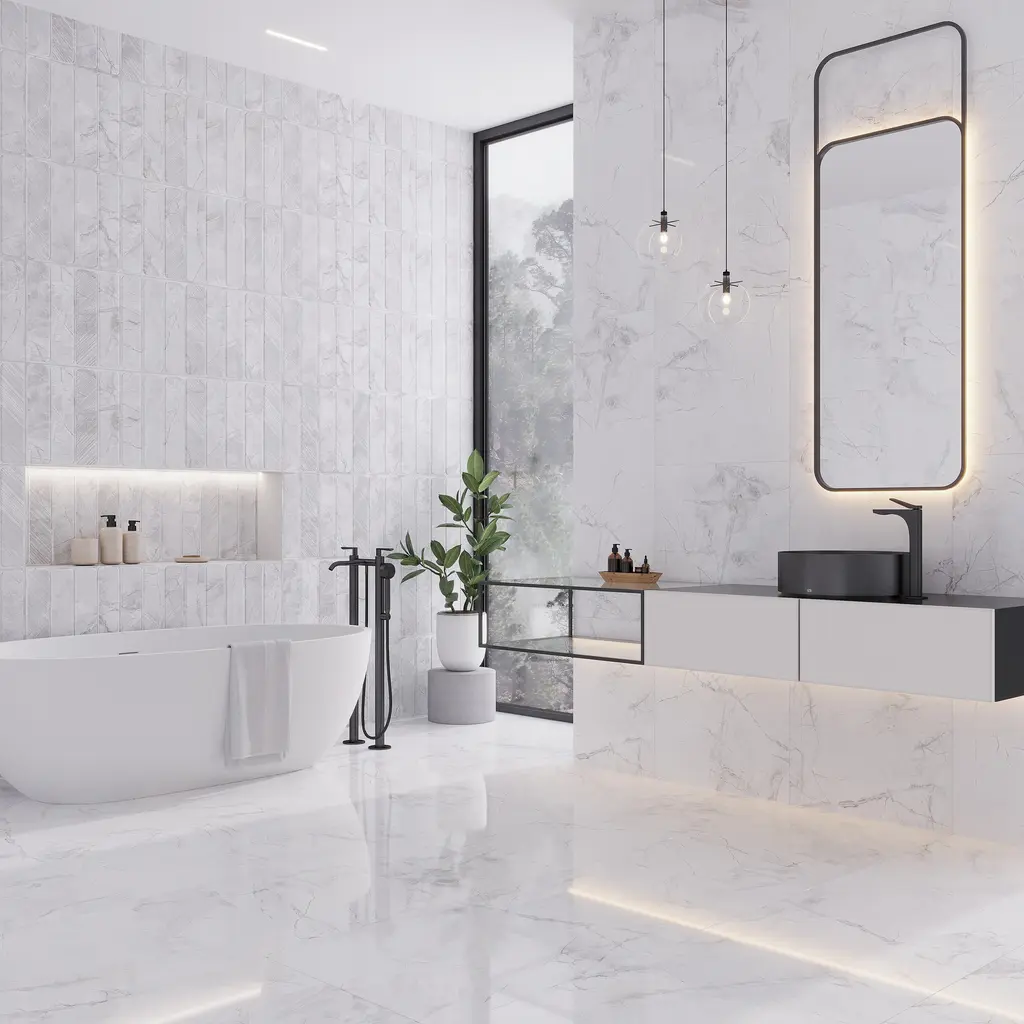 Soft gray tones paired with delicate white veining and refined textural patterns create an elegant yet modern aesthetic. The matt surface finish gives it a muted sophistication, while the elongated 16"x48" shape provides a contemporary edge, perfect for creating seamless, eye-catching wall designs. With a moderate variation (V3) and 10 unique porcelain faces, each piece offers just the right amount of uniqueness to keep things interesting without overpowering the space. Ideal for shower walls, steam rooms, or upscale accent walls, it's designed to bring a sense of calm luxury to any setting. Whether used in boutique commercial spaces or cozy residential interiors, this tile elevates every project with its balance of texture and style. While it's not meant for floors, it thrives on vertical surfaces where its subtle patterns and textures can truly shine. Think of it as the ultimate blend of contemporary design and timeless charm, offering just enough detail to spark conversation while maintaining a clean and polished look. From serene bathrooms to statement walls, this tile has all the ingredients for a standout design.