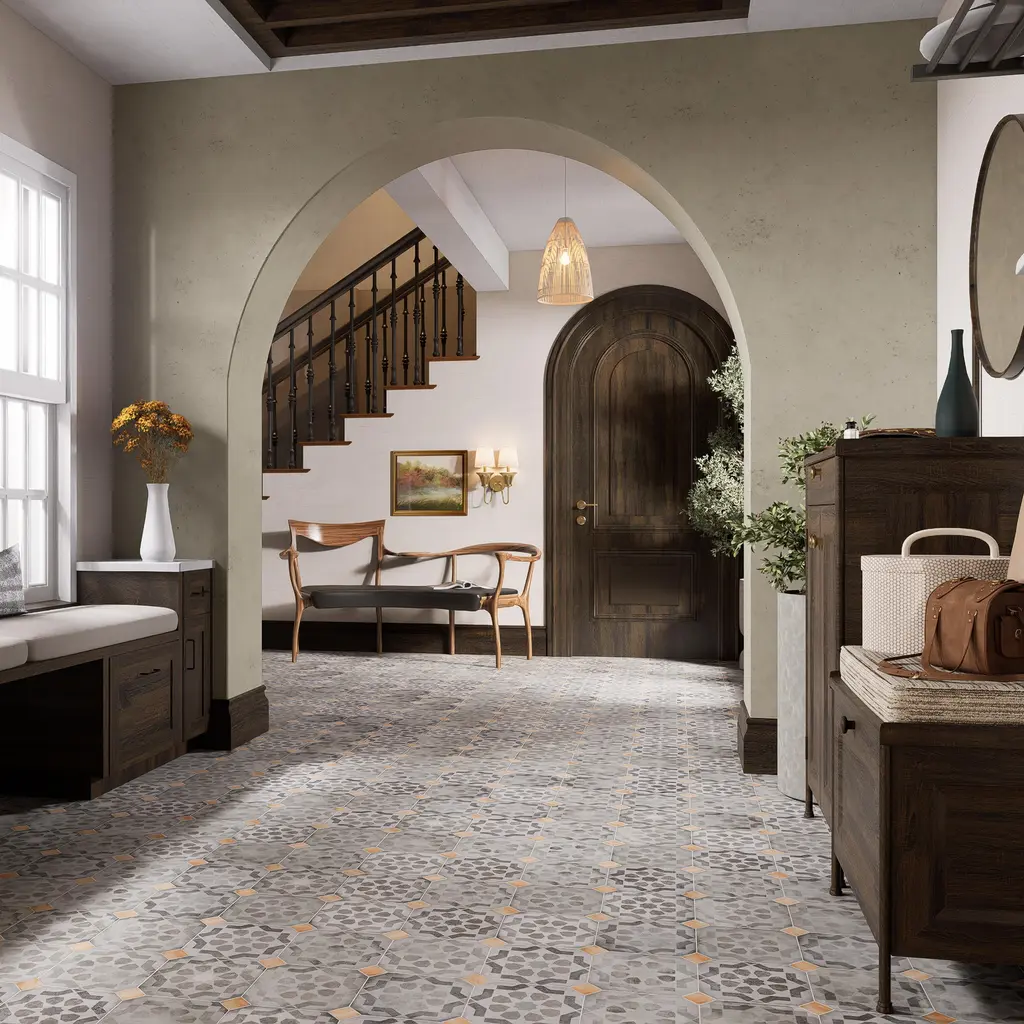 Deep, rich, and effortlessly elegant, this true black terrazzo-inspired hexagonal tile is designed to make a bold statement. The dramatic black base is speckled with white and light gray stone-like fragments, creating a striking, high-contrast look that's both modern and timeless. Its hexagonal shape adds a geometric edge, making it a favorite for high-impact, design-forward spaces. Perfect for luxurious bathroom floors, contemporary shower walls, or even as a bold kitchen backsplash, this tile brings drama and sophistication to any surface. The matte finish enhances its understated elegance, while the slight V2 variation and 10 unique porcelain faces ensure a custom look every time. Built to handle it all, this tile is slip-resistant, stain-proof, frost-resistant, and tough enough for heavy traffic areas. Its pressed edges allow for seamless installation, whether in a chic indoor setting or a stylish outdoor patio. With heat resistance and durability to match its looks, it's the ultimate choice for spaces that demand both performance and style.